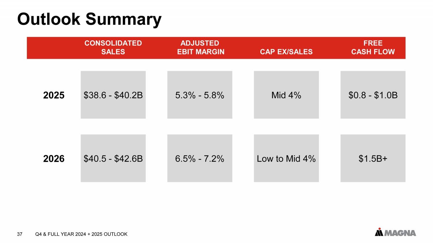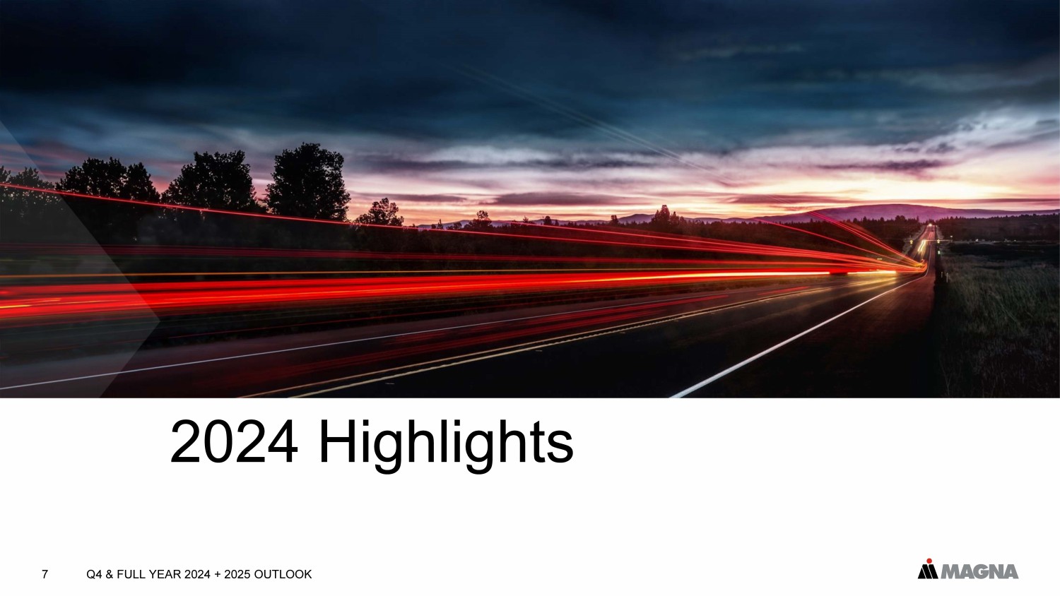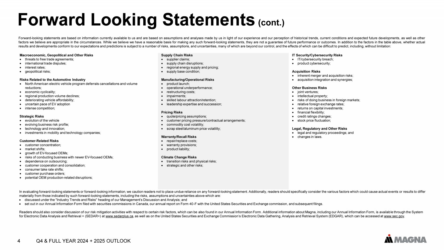 Q4 & FULL YEAR 2024 + 2025 OUTLOOK 2 Vice President, Investor Relations Louis Tonelli Q4 & FULL YEAR 2024 + 2025 OUTLOOK 3 Forward Looking Statements Certain statements in this presentation and accompanying document constitute "forward - looking information" or "forward - looking statements" (collectively, "forward - looking statements") . Any such forward - looking statements are intended to provide information about management's current expectations and plans and may not be appropriate for other purposes . Forward - looking statements may include financial and other projections, as well as statements regarding our future plans, strategic objectives or economic performance, or the assumptions underlying any of the foregoing, and other statements that are not recitations of historical fact . We use words such as "may", "would", "could", "should", "will", "likely", "expect", "anticipate", "assume", "believe", "intend", "plan", "aim", "forecast", "outlook", "project", "potential", "estimate", "target" and similar expressions suggesting future outcomes or events to identify forward - looking statements . The following table identifies the material forward - looking statements contained in this presentation and accompanying document, together with the material potential risks that we currently believe could cause actual results to differ materially from such forward - looking statements . Readers should also consider all of the risk factors which follow below the table : Material Potential Risks Related to Applicable Forward - Looking Statement Material Forward - Looking Statement Light vehicle sales levels Production disruptions, including as a result of labour strikes Supply disruptions Free trade arrangements and tariffs Relative currency values Commodities prices Availability and relative cost of skilled labour Light Vehicle Production Same risks as for Light Vehicle Production above North American electric vehicle program deferrals, cancellations and volume reductions The impact of elevated interest rates and availability of credit on consumer confidence and in turn vehicle sales and production The impact of deteriorating vehicle affordability on consumer demand, and in turn vehicle sales and production Alignment of our product mix with production demand Customer concentration Uncertain pace of EV adoption Shifts in market shares among vehicles or vehicle segments Shifts in consumer "take rates" for products we sell Consolidated/Total Sales Segment Sales Same risks as for Consolidated/Total Sales and Segment Sales above Successful execution of critical program launches Operational underperformance Product warranty/recall risks Restructuring costs Impairments Inflationary pressures Our ability to secure cost recoveries from customers and/or otherwise offset higher input costs Price concessions Risks of conducting business with newer EV - focused OEMs Commodity cost volatility Scrap steel price volatility Higher labour costs Tax risks Acquisition integration and synergies Adjusted EBIT Margin, Free Cash Flow, Interest Expense, net, CapEx / Sales, Adjusted Net Income Attributable to Magna, Target Leverage Ratio / Adj . Debt to Adj . EBITDA, Capital Allocation, Dividend Growth, Ability to Repurchase Shares and Relative Spending on Investment and Capital Return Same risks as Adjusted EBIT Margin, Free Cash Flow, Interest Expense, net, CapEx /Sales, Net Income Attributable to Magna, Target Leverage Ratio / Adj . Debt to Adj .