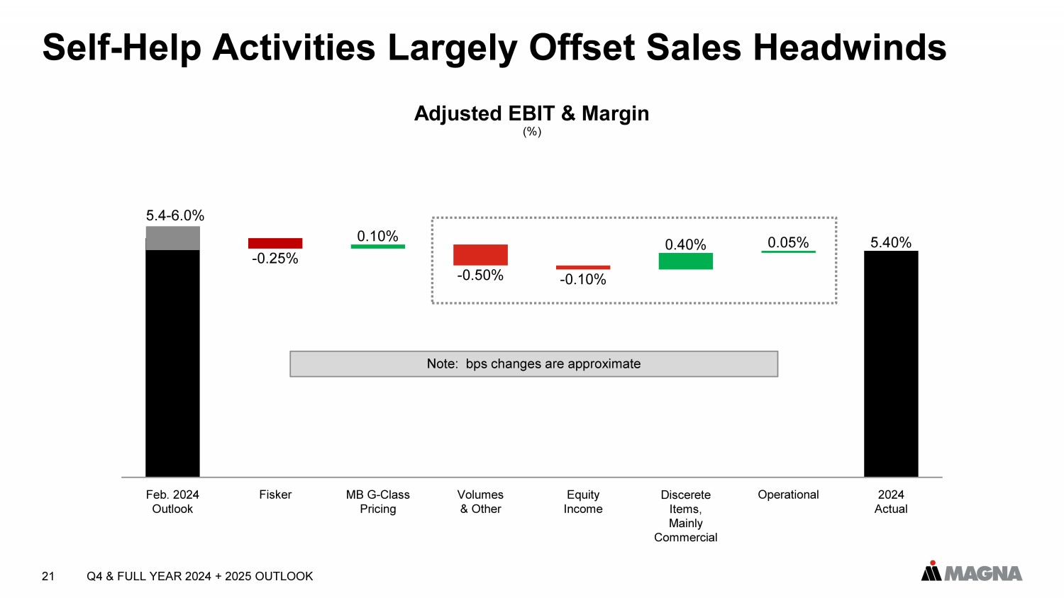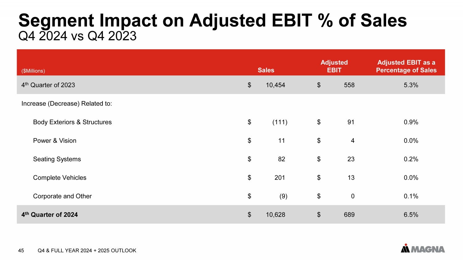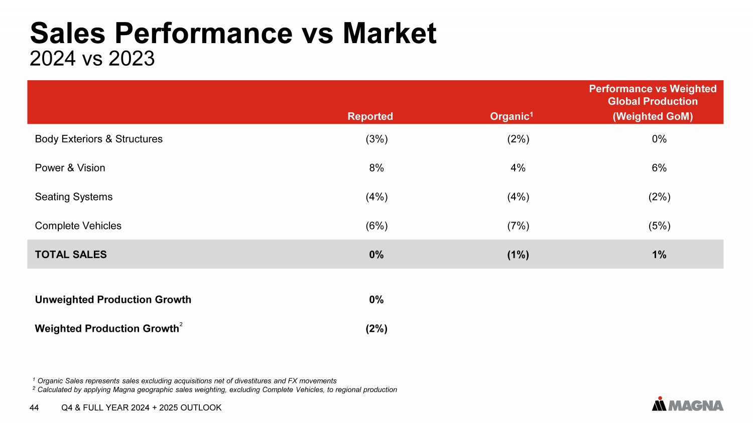 Q4 & FULL YEAR 2024 + 2025 OUTLOOK 43 Q4 2024 vs Q4 2023 Sales Performance vs Market Performance vs Weighted Global Production (Weighted GoM) Organic 1 Reported (1%) (1%) (3%) Body Exteriors & Structures 0% 0% 0% Power & Vision 6% 6% 6% Seating Systems 17% 17% 17% Complete Vehicles 2% 2% 2% TOTAL SALES 2% Unweighted Production Growth 0% Weighted Production Growth 2 1 Organic Sales represents sales excluding acquisitions net of divestitures and FX movements 2 Calculated by applying Magna geographic sales weighting, excluding Complete Vehicles, to regional production Q4 & FULL YEAR 2024 + 2025 OUTLOOK 44 2024 vs 2023 Sales Performance vs Market Performance vs Weighted Global Production (Weighted GoM) Organic 1 Reported 0% (2%) (3%) Body Exteriors & Structures 6% 4% 8% Power & Vision (2%) (4%) (4%) Seating Systems (5%) (7%) (6%) Complete Vehicles 1% (1%) 0% TOTAL SALES 0% Unweighted Production Growth (2%) Weighted Production Growth 2 1 Organic Sales represents sales excluding acquisitions net of divestitures and FX movements 2 Calculated by applying Magna geographic sales weighting, excluding Complete Vehicles, to regional production