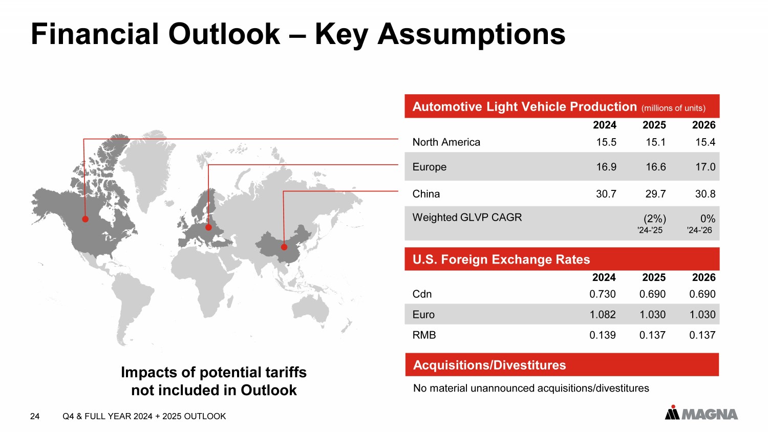 Q4 & FULL YEAR 2024 + 2025 OUTLOOK 23 Tailwinds • Further margin contribution from Operational Excellence activities Continuous improvement activities Optimizing current operations Factory of the Future initiatives • Benefits of restructuring actions • Insourcing business to optimize capacity • Lower net engineering spend • Return to normal cadence of CapEx /Sales • Significant EV investments behind us Overview of 2025 Outlook (relative to '24) Headwinds • Macro Challenges Continued weak LVP Strong USD • Additional net input cost increases predominantly labour • Lower expected net favourable commercial items Driven by less industry volatility from OEM program recalibration Q4 & FULL YEAR 2024 + 2025 OUTLOOK 24 Financial Outlook – Key Assumptions Automotive Light Vehicle Production (millions of units) 2026 2025 2024 15.4 15.1 15.5 North America 17.0 16.6 16.9 Europe 30.8 29.7 30.7 China 0% '24 - '26 (2%) '24 - '25 Weighted GLVP CAGR U.S. Foreign Exchange Rates 2026 2025 2024 0.690 0.690 0.730 Cdn 1.030 1.030 1.082 Euro 0.137 0.137 0.139 RMB Acquisitions/Divestitures No material unannounced acquisitions/divestitures Impacts of potential tariffs not included in Outlook