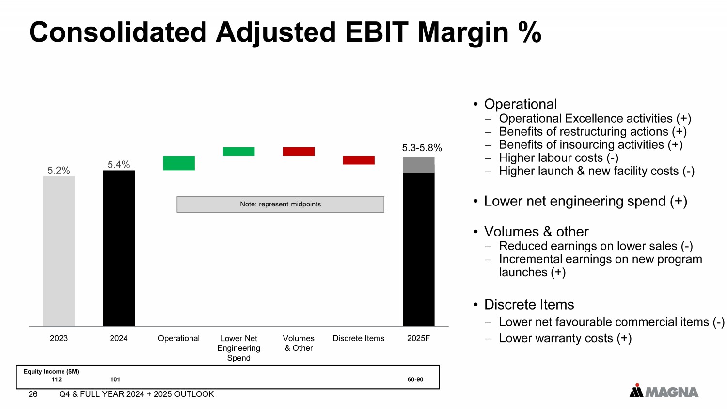 EBITDA, Capital Allocation, Dividend Growth, Ability to Repurchase Shares and Relative Spending on Investment and Capital Return above Risks related to conducting business through joint ventures Risks of doing business in foreign markets Legal and regulatory proceedings Changes in laws Equity Income Q4 & FULL YEAR 2024 + 2025 OUTLOOK 4 Forward Looking Statements (cont.) Forward - looking statements are based on information currently available to us and are based on assumptions and analyses made by us in light of our experience and our perception of historical trends, current conditions and expected future developments, as well as other factors we believe are appropriate in the circumstances . While we believe we have a reasonable basis for making any such forward - looking statements, they are not a guarantee of future performance or outcomes . In addition to the factors in the table above, whether actual results and developments conform to our expectations and predictions is subject to a number of risks, assumptions, and uncertainties, many of which are beyond our control, and the effects of which can be difficult to predict, including, without limitation : IT Security/Cybersecurity Risks IT/cybersecurity breach; product cybersecurity; Acquisition Risks inherent merger and acquisition risks; acquisition integration and synergies; Other Business Risks joint ventures; intellectual property; risks of doing business in foreign markets; relative foreign exchange rates; returns on capital investments; financial flexibility; credit ratings changes; stock price fluctuation; Legal, Regulatory and Other Risks legal and regulatory proceedings; and changes in laws. Supply Chain Risks supplier claims; supply chain disruptions; regional energy supply and pricing; supply base condition; Manufacturing/Operational Risks product launch; operational underperformance; restructuring costs; impairments; skilled labour attraction/retention; leadership expertise and succession; Pricing Risks quote/pricing assumptions; customer pricing pressure/contractual arrangements; commodity cost volatility; scrap steel/aluminum price volatility; Warranty/Recall Risks repair/replace costs; warranty provisions; product liability; Climate Change Risks transition risks and physical risks; strategic and other risks; Macroeconomic, Geopolitical and Other Risks threats to free trade agreements; international trade disputes; interest rates; geopolitical risks; Risks Related to the Automotive Industry North American electric vehicle program deferrals cancellations and volume reductions; economic cyclicality; regional production volume declines; deteriorating vehicle affordability; uncertain pace of EV adoption intense competition; Strategic Risks evolution of the vehicle evolving business risk profile; technology and innovation; investments in mobility and technology companies; Customer - Related Risks customer concentration; market shifts; growth of EV - focused OEMs; risks of conducting business with newer EV - focused OEMs; dependence on outsourcing; customer cooperation and consolidation; consumer take rate shifts; customer purchase orders; potential OEM production - related disruptions; In evaluating forward - looking statements or forward - looking information, we caution readers not to place undue reliance on any f orward - looking statement. Additionally, readers should specifically consider the various factors which could cause actual events or results to differ materially from those indicated by such forward - looking statements, including the risks, assumptions and uncertainties above whi ch are: discussed under the "Industry Trends and Risks" heading of our Management’s Discussion and Analysis; and set out in our Annual Information Form filed with securities commissions in Canada, our annual report on Form 40 - F with the Unit ed States Securities and Exchange commission, and subsequent filings. Readers should also consider discussion of our risk mitigation activities with respect to certain risk factors, which can be als o found in our Annual Information Form. Additional information about Magna, including our Annual Information Form, is availab le through the System for Electronic Data Analysis and Retrieval + (SEDAR+) at www.sedarplus.ca , as well as on the United States Securities and Exchange Commission’s Electronic Data Gathering, Analysis and Retrieval Syst em (EDGAR), which can be accessed at www.sec.gov .