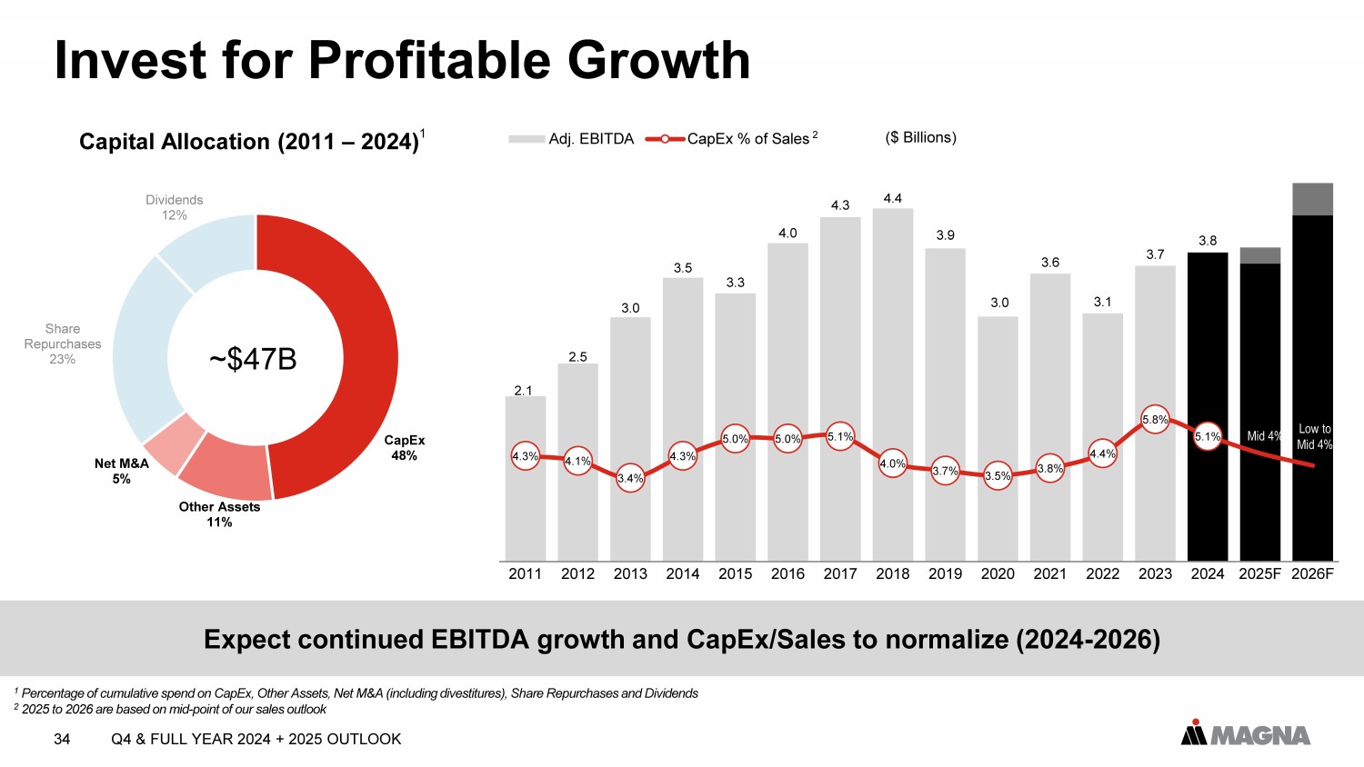 Your second part of the question, if you just look back in the history of Magna, over the period that I was showing data for the last 14 years, we have spent roughly $20 billion in investments to grow our business and about net of divestitures, $2 billion in M&A, right? So kind of it should give you a viewpoint there.