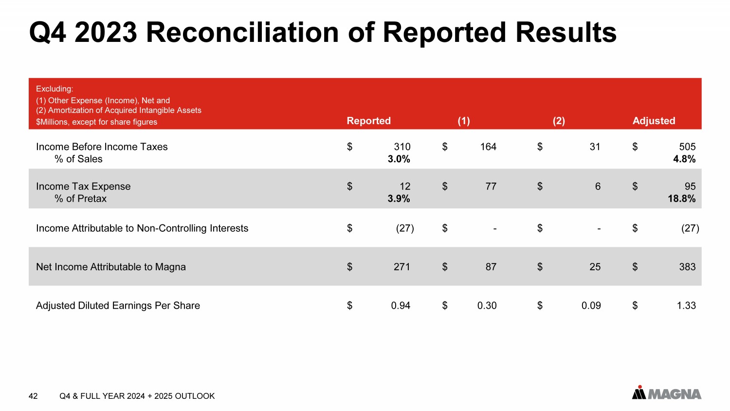 Q4 & FULL YEAR 2024 + 2025 OUTLOOK 40 Appendix – Q4 2024 Results Q4 & FULL YEAR 2024 + 2025 OUTLOOK 41 Q4 2024 Reconciliation of Reported Results Adjusted (2) (1) Reported Excluding: (1) Other Expense (Income), Net and (2) Amortization of Acquired Intangible Assets $Millions, except for share figures $ 637 $ 28 $ 228 $ 381 Income Before Income Taxes 6.0% 3.6% % of Sales $ 124 $ 6 $ (29) $ 147 Income Tax Expense 19.5% 38.6% % of Pretax $ (31) $ - $ - $ (31) Income Attributable to Non - Controlling Interests $ 482 $ 22 $ 257 $ 203 Adjusted Net Income Attributable to Magna 1 $ 1.69 $ 0.08 $ 0.90 $ 0.71 Adjusted Diluted Earnings Per Share 1 Adjusted Net Income Attributable to Magna represents Net Income excluding Other expense (income), net and Amortization of Acquired Int ang ible Assets Q4 & FULL YEAR 2024 + 2025 OUTLOOK 42 Q4 2023 Reconciliation of Reported Results Adjusted (2) (1) Reported Excluding: (1) Other Expense (Income), Net and (2) Amortization of Acquired Intangible Assets $Millions, except for share figures $ 505 $ 31 $ 164 $ 310 Income Before Income Taxes 4.8% 3.0% % of Sales $ 95 $ 6 $ 77 $ 12 Income Tax Expense 18.8% 3.9% % of Pretax $ (27) $ - $ - $ (27) Income Attributable to Non - Controlling Interests $ 383 $ 25 $ 87 $ 271 Net Income Attributable to Magna $ 1.33 $ 0.09 $ 0.30 $ 0.94 Adjusted Diluted Earnings Per Share