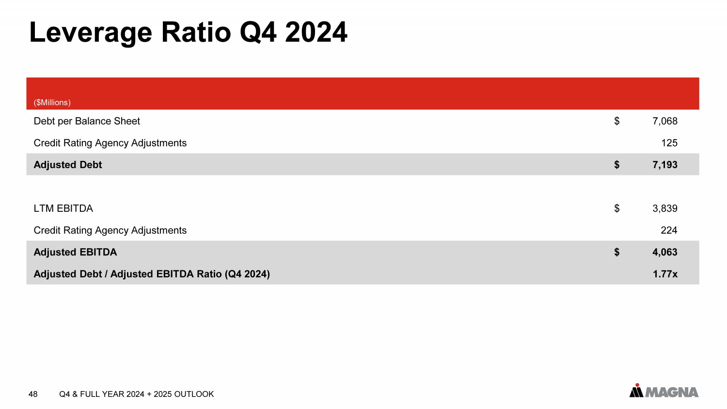 Q4 & FULL YEAR 2024 + 2025 OUTLOOK 47 Q4 2024 Financial Results Change Q4 2024 Q4 2023 ($Millions, unless otherwise noted) 174 10,628 10,454 Sales 131 689 558 Adjusted EBIT 1 52 53 Interest Expense 132 637 505 Adjusted Pre - Tax Income (29) 124 95 Adjusted Income Taxes (4) 31 27 Income Attributable to Non - Controlling Interests 99 482 383 Adjusted Net Income Attributable to Magna 0.7 285.9 286.6 Diluted Shares Outstanding (millions of shares) 0.36 1.69 1.33 Adjusted Diluted EPS ($) 18.8% 19.5% 5.3% 6.5% Q4 & FULL YEAR 2024 + 2025 OUTLOOK 48 Leverage Ratio Q4 2024 ($Millions) $ 7,068 Debt per Balance Sheet 125 Credit Rating Agency Adjustments $ 7,193 Adjusted Debt $ 3,839 LTM EBITDA 224 Credit Rating Agency Adjustments $ 4,063 Adjusted EBITDA 1.77x Adjusted Debt / Adjusted EBITDA Ratio (Q4 2024)