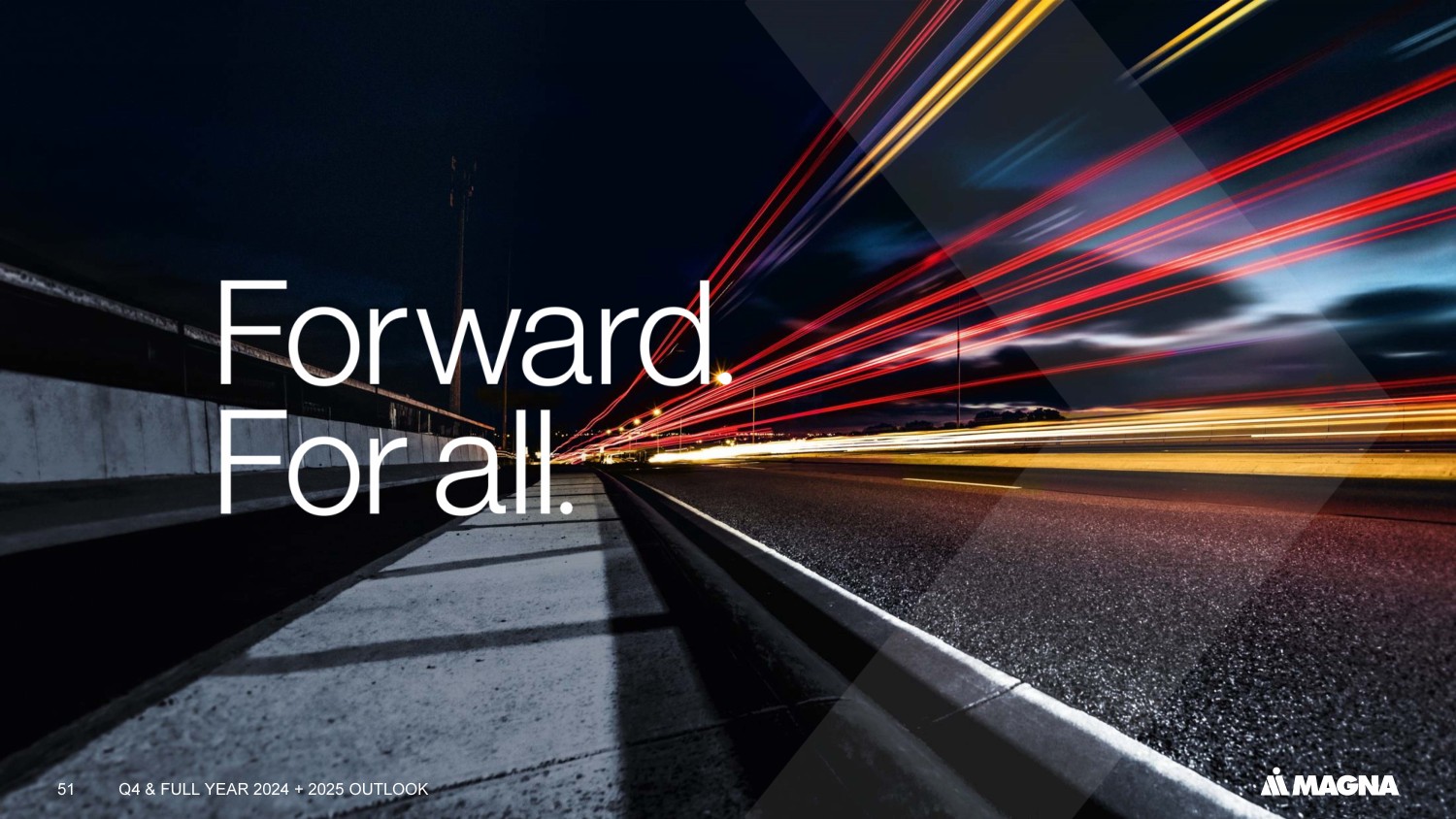 Q4 & FULL YEAR 2024 + 2025 OUTLOOK 49 Appendix - Outlook Q4 & FULL YEAR 2024 + 2025 OUTLOOK 50 Financial Outlook 2026 2025 ($Billions, unless otherwise noted) 16.8 – 17.6 15.2 – 15.7 5.3 – 5.7 3.7 – 4.1 15.7 – 16.3 14.1 – 14.5 5.3 – 5.6 4.0 – 4.3 Sales: • Body Exteriors & Structures • Power & Vision • Seating Systems • Complete Vehicles 40.5 – 42.6 38.6 – 40.2 Total Sales 6.5% – 7.2% 5.3% – 5.8% Adjusted EBIT Margin % 1 65M – 110M 60M – 90M Equity Income (included in EBIT) ~210M Interest Expense, net ~25% Income Tax Rate 2 1.3 – 1.5 Adjusted Net Income attributable to Magna 3 ~1.8 Capital Spending 1 Adjusted EBIT Margin is the ratio of Adjusted EBIT to Total Sales 2 Income Tax Rate has been calculated using Adjusted EBIT and is based on current tax legislation 3 Adjusted Net Income attributable to Magna represents Net Income excluding Other expense (income), net, and amortization of ac qu ired intangible assets, net of tax Q4 & FULL YEAR 2024 + 2025 OUTLOOK 51