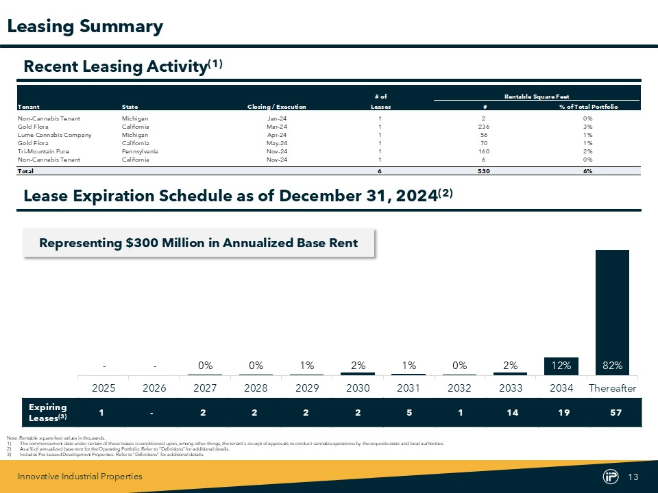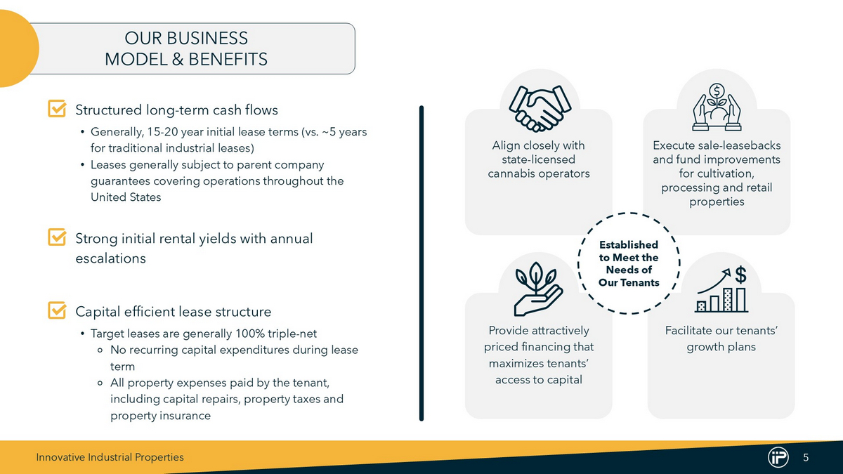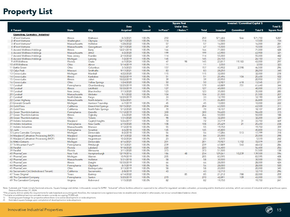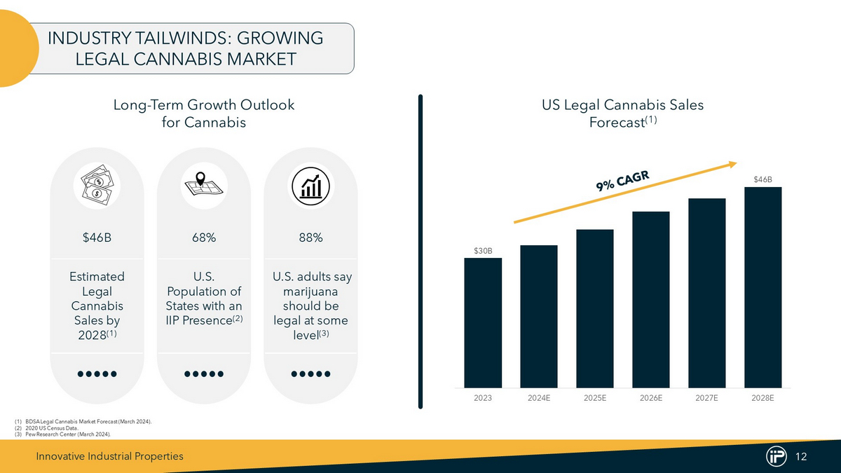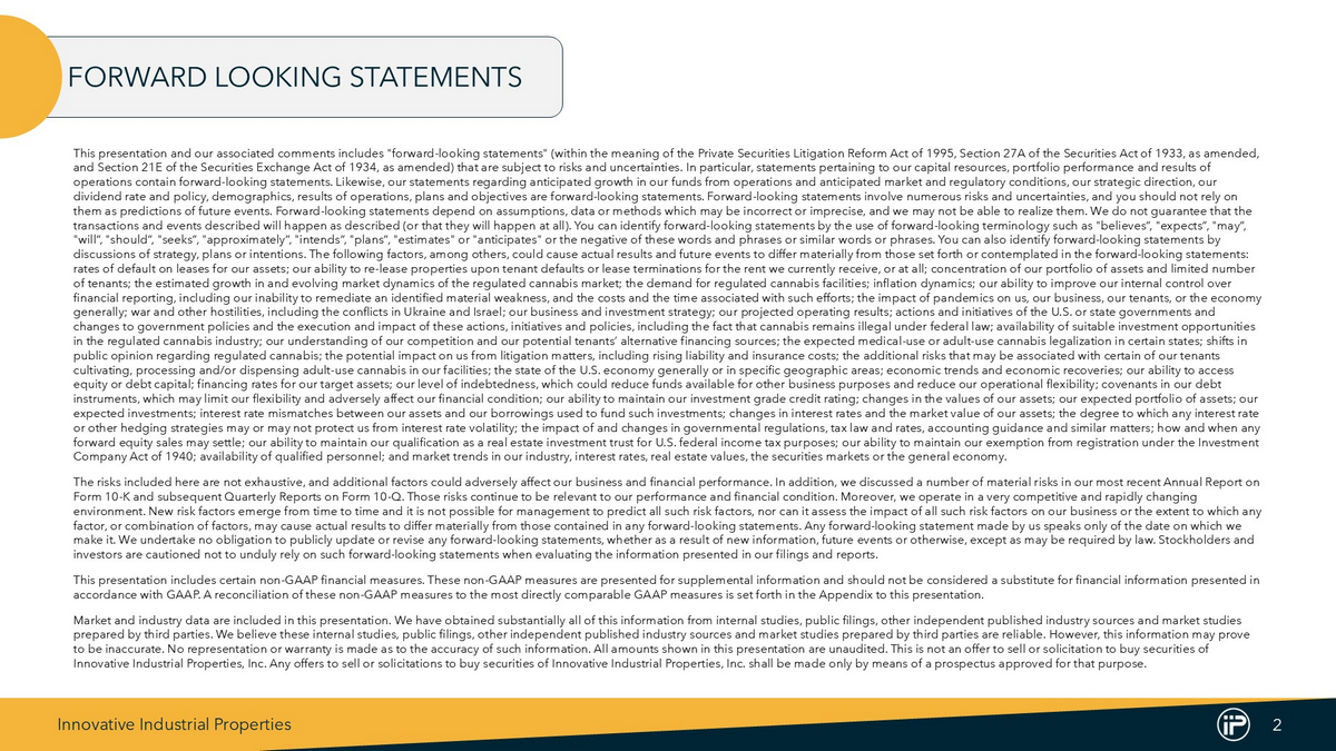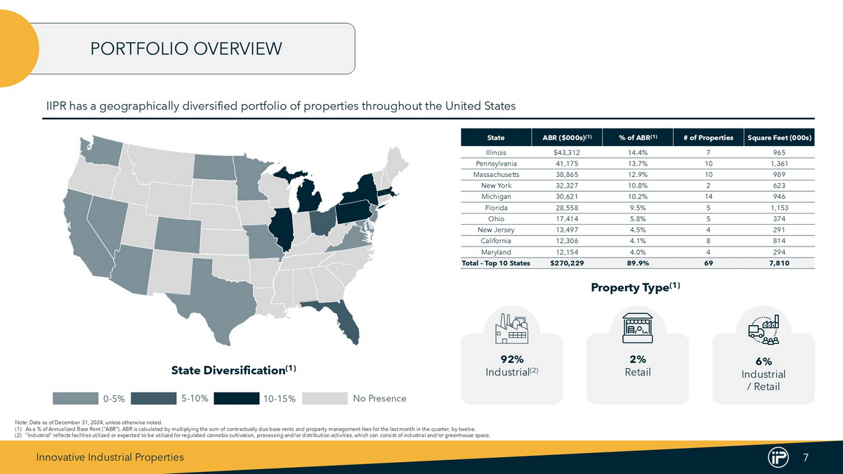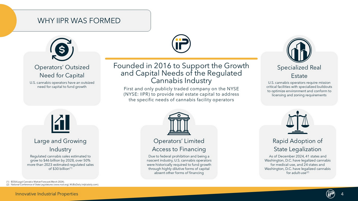 カリフォルニア州サンディエゴ-2025年2月19日-規制対象の米国大麻産業に特化したニューヨーク証券取引所初で唯一の不動産会社であるイノベーティブ・インダストリアル・プロパティーズ・インク(NYSE:IIPR)(以下「IIP」または「当社」)は本日、2024年12月31日を期末とする第4四半期および通期の業績を発表した。