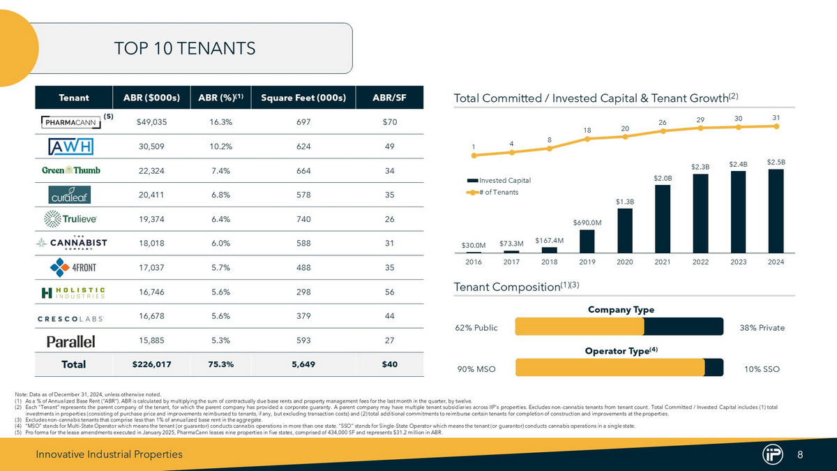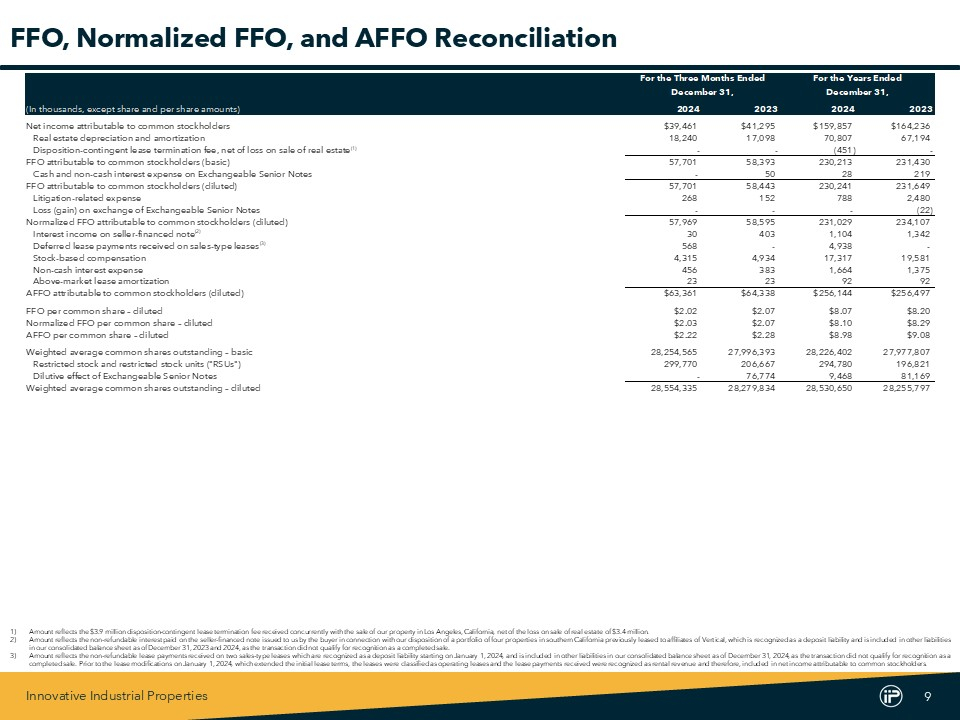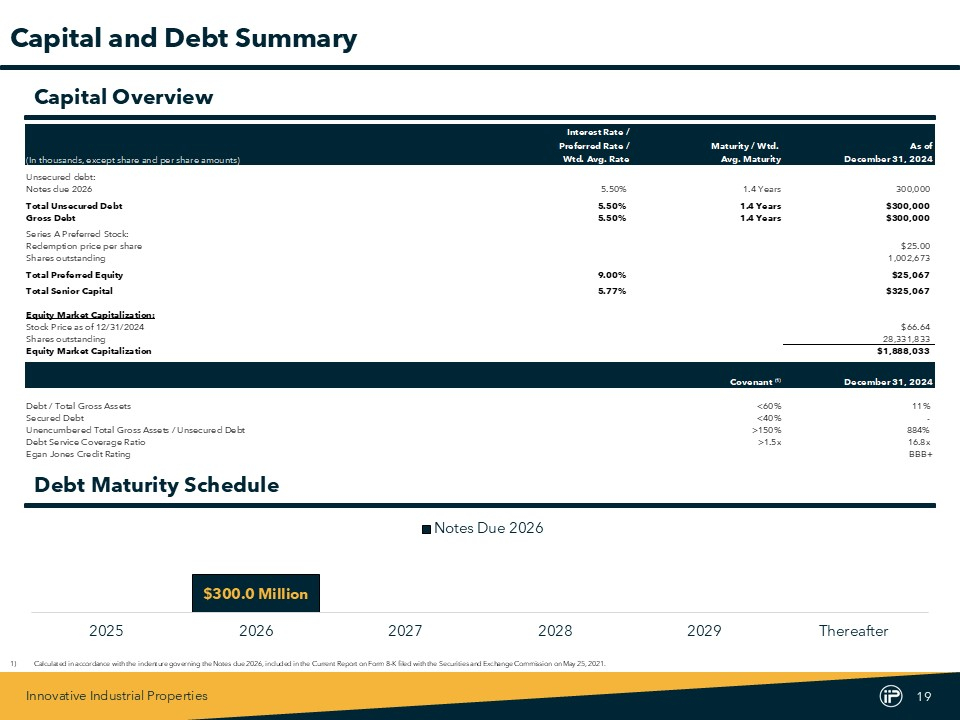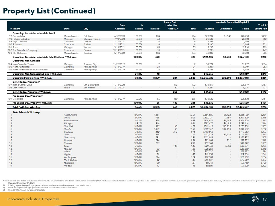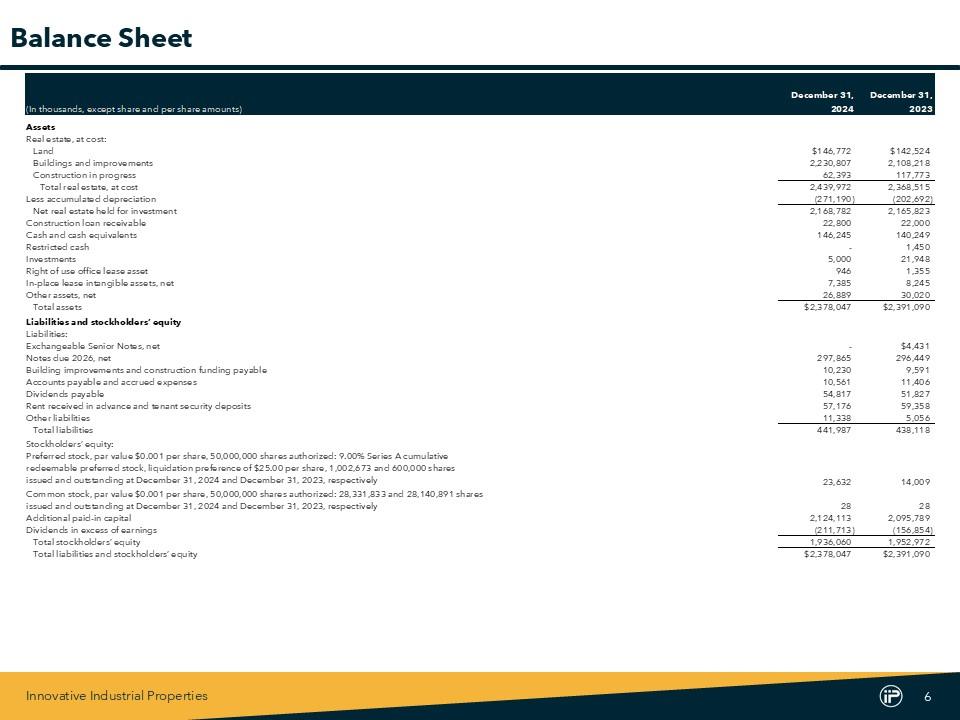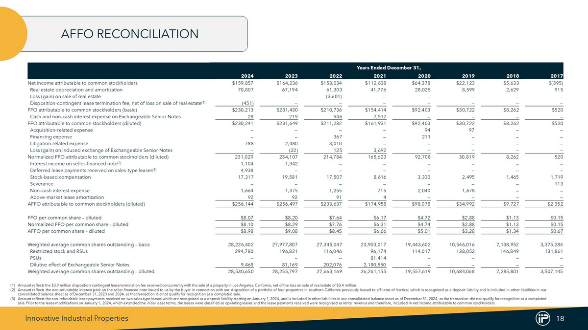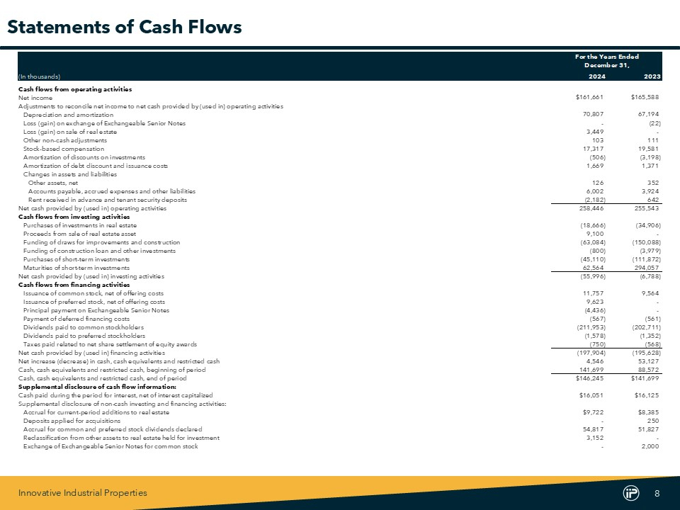 カリフォルニア州サンディエゴ-2025年2月19日-規制対象の米国大麻産業に特化したニューヨーク証券取引所初で唯一の不動産会社であるイノベーティブ・インダストリアル・プロパティーズ・インク(NYSE:IIPR)(以下「IIP」または「当社」)は本日、2024年12月31日を期末とする第4四半期および通期の業績を発表した。