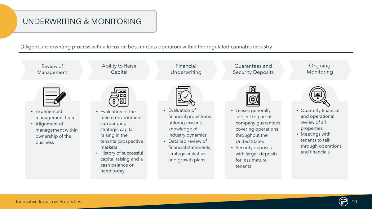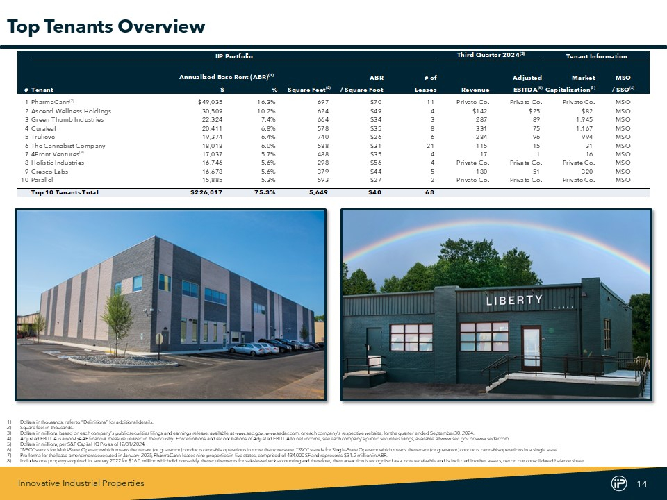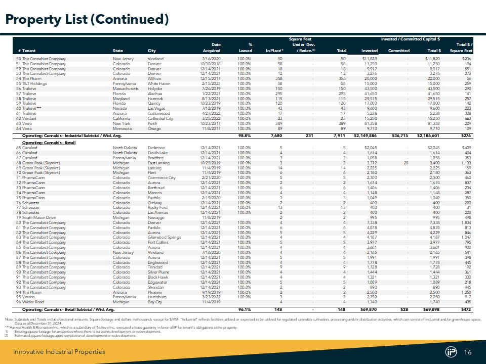 | · | 2025年1月30日に既報の通り、IIPはファーマキャン社およびその関連会社(以下「ファーマキャン社」)との間で、当社が所有する11物件のリースに関する既存のリース債務不履行を解消することで合意に達した。PharmaCann社とIIP社間の主な契約条件は以下の通り。: |