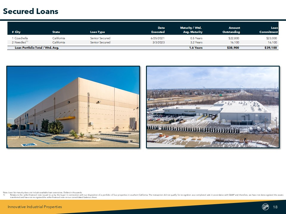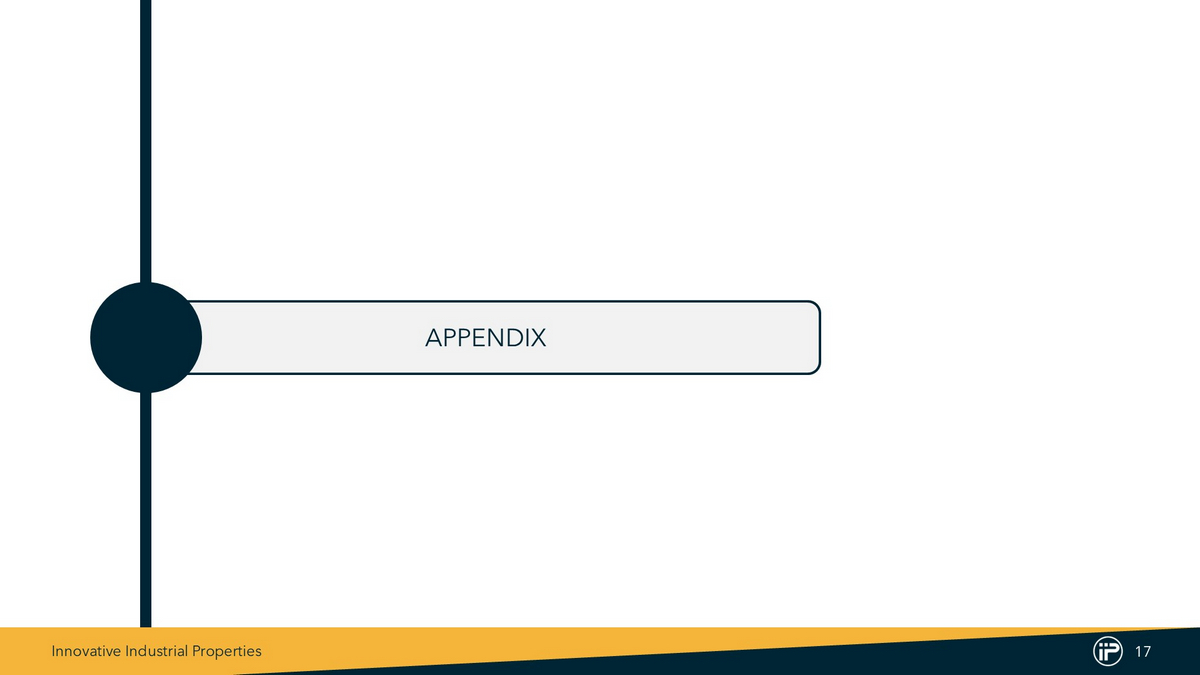 | · | 11月、カリフォルニア州パームスプリングスにあるIIPのノース・アンザ・ロードとデル・ソル・ロードの敷地6,000平方フィートを大麻以外のテナントに賃貸。 |
