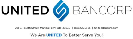 United Bancorp, Inc. is headquartered in Martins Ferry, Ohio and has total assets of $820.8 million and total shareholder’s equity of $67.6 million as of December 31, 2024. Through its single bank charter, Unified Bank, the Company currently has eighteen banking centers that serve the Ohio Counties of Athens, Belmont, Carroll, Fairfield, Harrison, Jefferson and Tuscarawas and Marshall County in West Virginia. United Bancorp, Inc. trades on the NASDAQ Capital Market tier of the NASDAQ Stock Market under the symbol UBCP, Cusip #909911109.