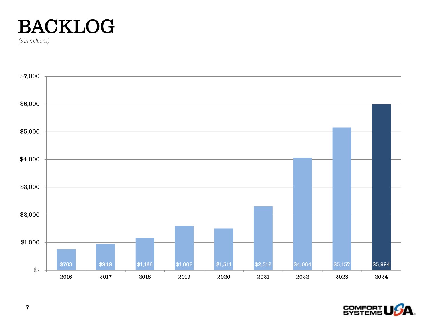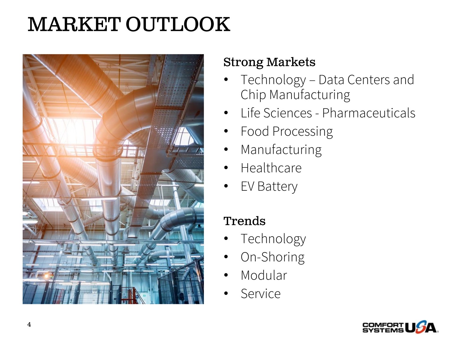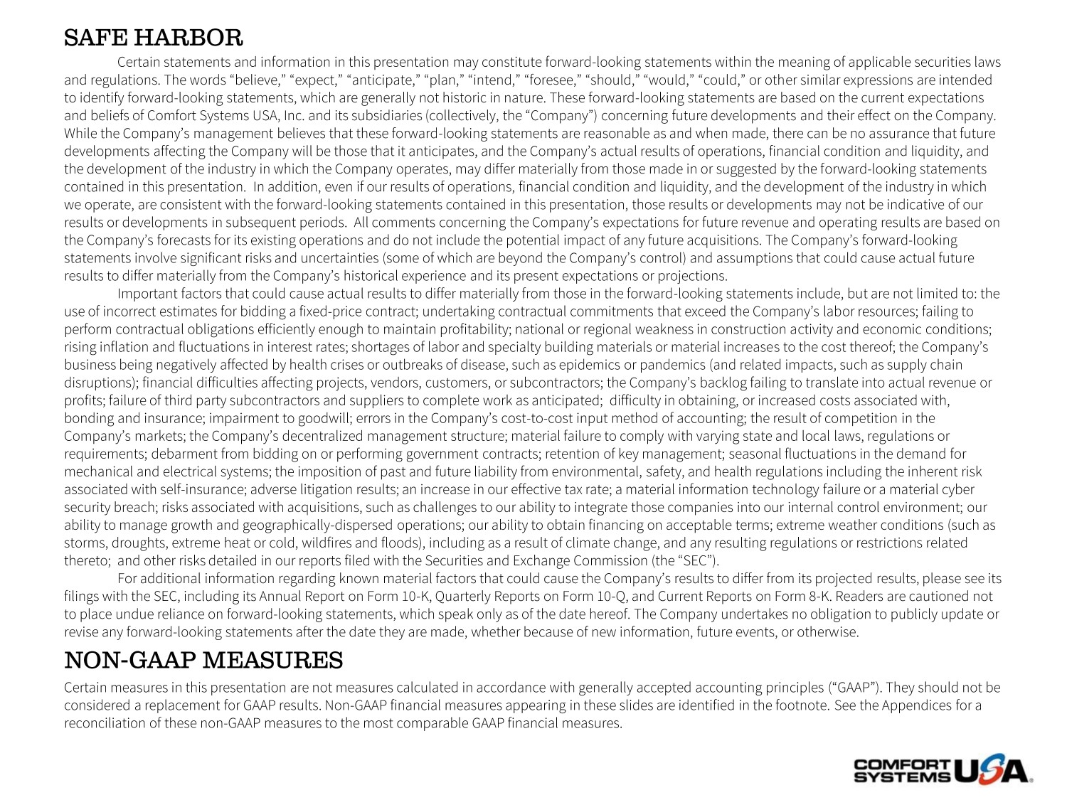 SAFE HARBOR Certain statements and information in this presentation may constitute forward - looking statements within the meaning of applicab le securities laws and regulations. The words “believe,” “expect,” “anticipate,” “plan,” “intend,” “foresee,” “should,” “would,” “could,” or oth er similar expressions are intended to identify forward - looking statements, which are generally not historic in nature. These forward - looking statements are based o n the current expectations and beliefs of Comfort Systems USA, Inc. and its subsidiaries (collectively, the “Company”) concerning future developments an d t heir effect on the Company. While the Company’s management believes that these forward - looking statements are reasonable as and when made, there can be no a ssurance that future developments affecting the Company will be those that it anticipates, and the Company’s actual results of operations, financi al condition and liquidity, and the development of the industry in which the Company operates, may differ materially from those made in or suggested by the f orw ard - looking statements contained in this presentation. In addition, even if our results of operations, financial condition and liquidity, and the d eve lopment of the industry in which we operate, are consistent with the forward - looking statements contained in this presentation, those results or developments may not be indicative of our results or developments in subsequent periods. All comments concerning the Company’s expectations for future revenue and ope rat ing results are based on the Company’s forecasts for its existing operations and do not include the potential impact of any future acquisitions. The C omp any’s forward - looking statements involve significant risks and uncertainties (some of which are beyond the Company’s control) and assumptions that cou ld cause actual future results to differ materially from the Company’s historical experience and its present expectations or projections. Important factors that could cause actual results to differ materially from those in the forward - looking statements include, bu t are not limited to: the use of incorrect estimates for bidding a fixed - price contract; undertaking contractual commitments that exceed the Company’s lab or resources; failing to perform contractual obligations efficiently enough to maintain profitability; national or regional weakness in construction a cti vity and economic conditions; rising inflation and fluctuations in interest rates; shortages of labor and specialty building materials or material increase s t o the cost thereof; the Company’s business being negatively affected by health crises or outbreaks of disease, such as epidemics or pandemics (and related impa cts , such as supply chain disruptions); financial difficulties affecting projects, vendors, customers, or subcontractors; the Company’s backlog failing to translate into actual revenue or profits; failure of third party subcontractors and suppliers to complete work as anticipated; difficulty in obtaining, or in cre ased costs associated with, bonding and insurance; impairment to goodwill; errors in the Company’s cost - to - cost input method of accounting; the result of co mpetition in the Company’s markets; the Company’s decentralized management structure; material failure to comply with varying state and local law s, regulations or requirements; debarment from bidding on or performing government contracts; retention of key management; seasonal fluctuation s i n the demand for mechanical and electrical systems; the imposition of past and future liability from environmental, safety, and health regulat ion s including the inherent risk associated with self - insurance; adverse litigation results; an increase in our effective tax rate; a material information techno logy failure or a material cyber security breach; risks associated with acquisitions, such as challenges to our ability to integrate those companies into our int ernal control environment; our ability to manage growth and geographically - dispersed operations; our ability to obtain financing on acceptable terms; extreme w eather conditions (such as storms, droughts, extreme heat or cold, wildfires and floods), including as a result of climate change, and any resulting reg ula tions or restrictions related thereto; and other risks detailed in our reports filed with the Securities and Exchange Commission (the “SEC”). For additional information regarding known material factors that could cause the Company’s results to differ from its project ed results, please see its filings with the SEC, including its Annual Report on Form 10 - K, Quarterly Reports on Form 10 - Q, and Current Reports on Form 8 - K. Readers are cautioned not to place undue reliance on forward - looking statements, which speak only as of the date hereof. The Company undertakes no obligat ion to publicly update or revise any forward - looking statements after the date they are made, whether because of new information, future events, or otherw ise. NON - GAAP MEASURES Certain measures in this presentation are not measures calculated in accordance with generally accepted accounting principles (“ GAAP”). They should not be considered a replacement for GAAP results. Non - GAAP financial measures appearing in these slides are identified in the footnote. See the Appendices for a reconciliation of these non - GAAP measures to the most comparable GAAP financial measures.