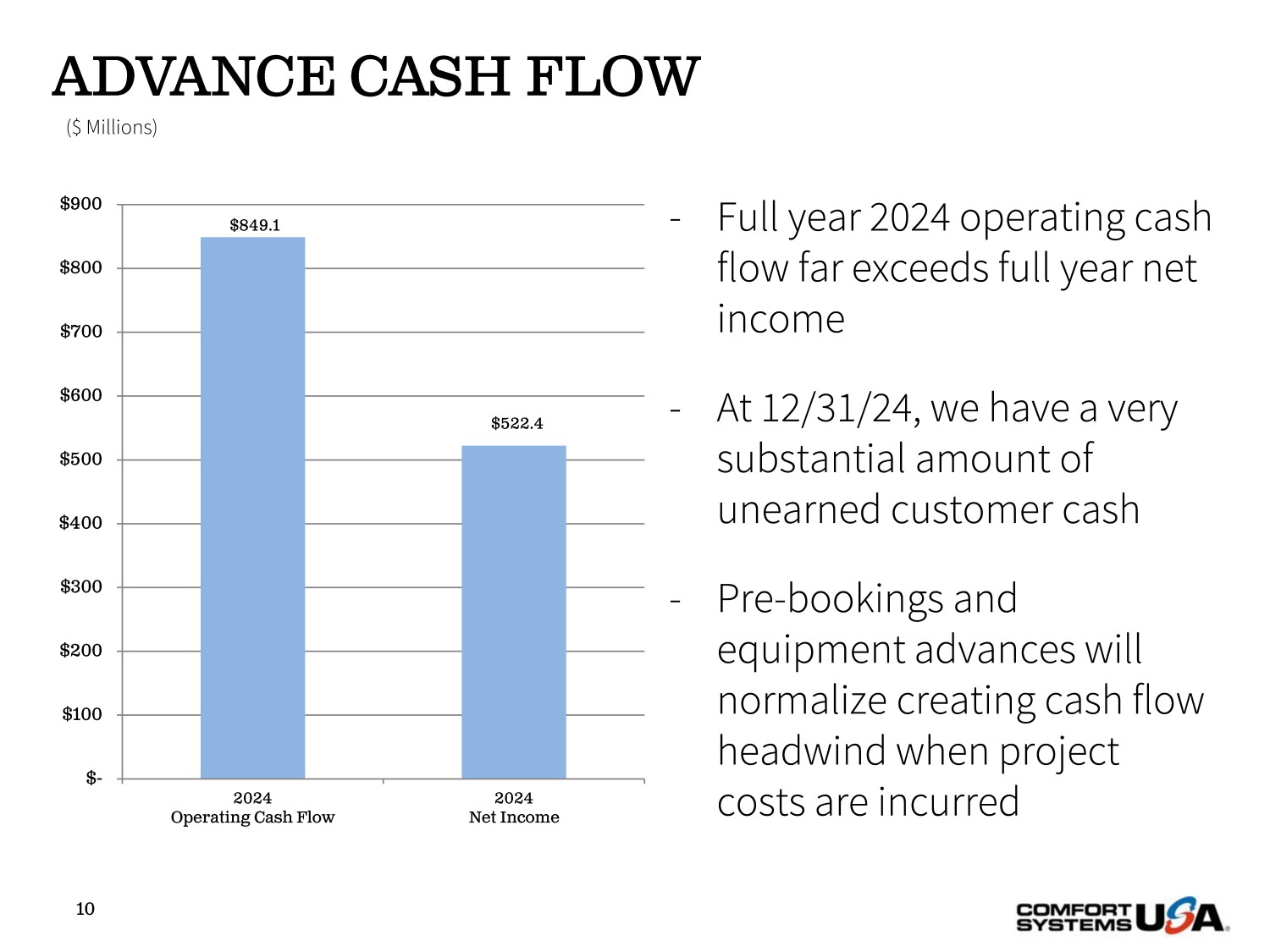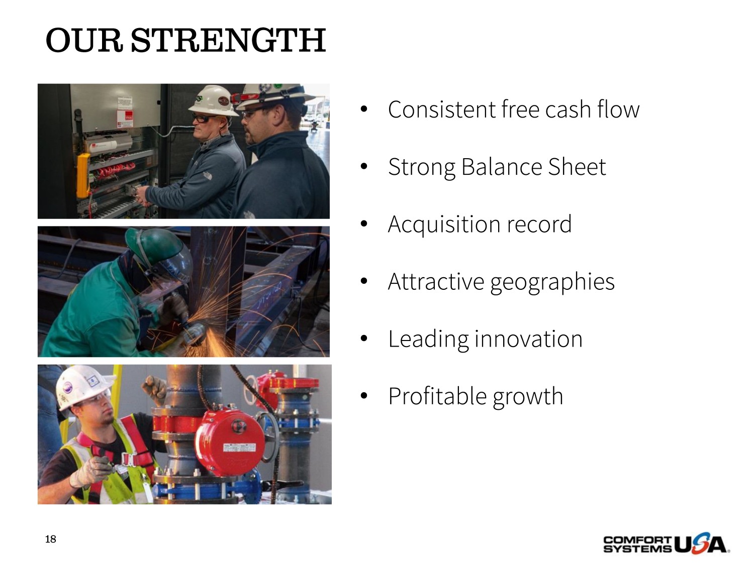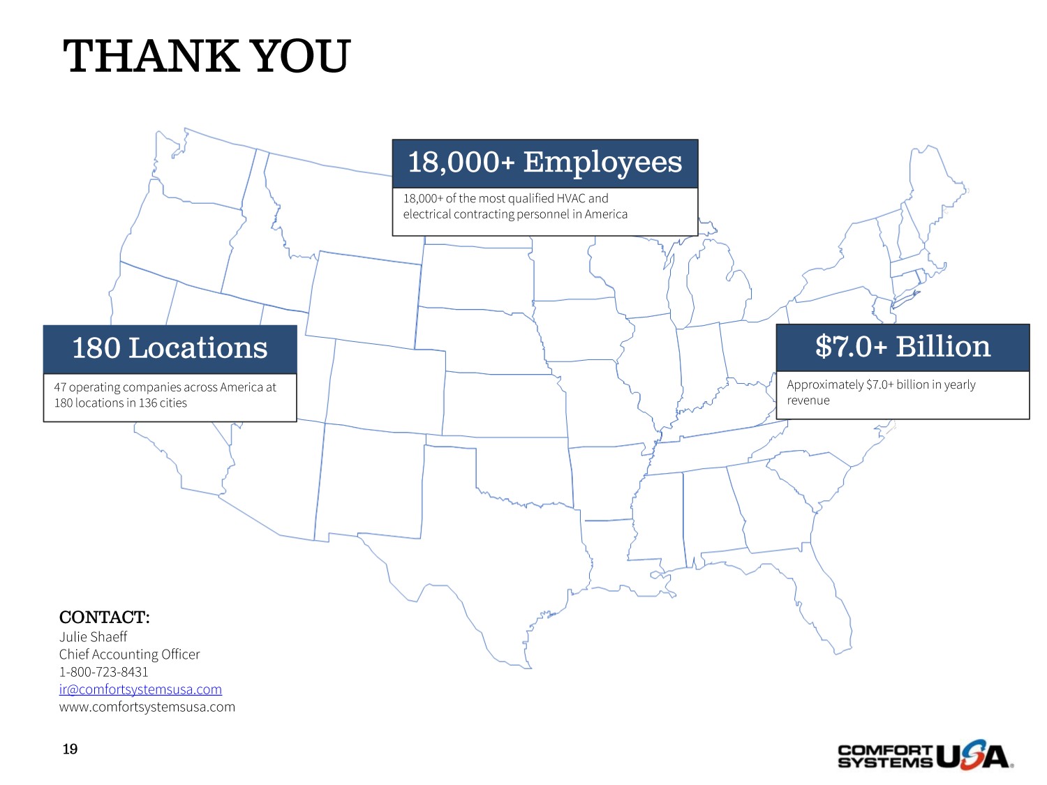 SAFE HARBOR Certain statements and information in this presentation may constitute forward - looking statements within the meaning of applicab le securities laws and regulations. The words “believe,” “expect,” “anticipate,” “plan,” “intend,” “foresee,” “should,” “would,” “could,” or oth er similar expressions are intended to identify forward - looking statements, which are generally not historic in nature. These forward - looking statements are based o n the current expectations and beliefs of Comfort Systems USA, Inc. and its subsidiaries (collectively, the “Company”) concerning future developments an d t heir effect on the Company. While the Company’s management believes that these forward - looking statements are reasonable as and when made, there can be no a ssurance that future developments affecting the Company will be those that it anticipates, and the Company’s actual results of operations, financi al condition and liquidity, and the development of the industry in which the Company operates, may differ materially from those made in or suggested by the f orw ard - looking statements contained in this presentation. In addition, even if our results of operations, financial condition and liquidity, and the d eve lopment of the industry in which we operate, are consistent with the forward - looking statements contained in this presentation, those results or developments may not be indicative of our results or developments in subsequent periods. All comments concerning the Company’s expectations for future revenue and ope rat ing results are based on the Company’s forecasts for its existing operations and do not include the potential impact of any future acquisitions. The C omp any’s forward - looking statements involve significant risks and uncertainties (some of which are beyond the Company’s control) and assumptions that cou ld cause actual future results to differ materially from the Company’s historical experience and its present expectations or projections. Important factors that could cause actual results to differ materially from those in the forward - looking statements include, bu t are not limited to: the use of incorrect estimates for bidding a fixed - price contract; undertaking contractual commitments that exceed the Company’s lab or resources; failing to perform contractual obligations efficiently enough to maintain profitability; national or regional weakness in construction a cti vity and economic conditions; rising inflation and fluctuations in interest rates; shortages of labor and specialty building materials or material increase s t o the cost thereof; the Company’s business being negatively affected by health crises or outbreaks of disease, such as epidemics or pandemics (and related impa cts , such as supply chain disruptions); financial difficulties affecting projects, vendors, customers, or subcontractors; the Company’s backlog failing to translate into actual revenue or profits; failure of third party subcontractors and suppliers to complete work as anticipated; difficulty in obtaining, or in cre ased costs associated with, bonding and insurance; impairment to goodwill; errors in the Company’s cost - to - cost input method of accounting; the result of co mpetition in the Company’s markets; the Company’s decentralized management structure; material failure to comply with varying state and local law s, regulations or requirements; debarment from bidding on or performing government contracts; retention of key management; seasonal fluctuation s i n the demand for mechanical and electrical systems; the imposition of past and future liability from environmental, safety, and health regulat ion s including the inherent risk associated with self - insurance; adverse litigation results; an increase in our effective tax rate; a material information techno logy failure or a material cyber security breach; risks associated with acquisitions, such as challenges to our ability to integrate those companies into our int ernal control environment; our ability to manage growth and geographically - dispersed operations; our ability to obtain financing on acceptable terms; extreme w eather conditions (such as storms, droughts, extreme heat or cold, wildfires and floods), including as a result of climate change, and any resulting reg ula tions or restrictions related thereto; and other risks detailed in our reports filed with the Securities and Exchange Commission (the “SEC”). For additional information regarding known material factors that could cause the Company’s results to differ from its project ed results, please see its filings with the SEC, including its Annual Report on Form 10 - K, Quarterly Reports on Form 10 - Q, and Current Reports on Form 8 - K. Readers are cautioned not to place undue reliance on forward - looking statements, which speak only as of the date hereof. The Company undertakes no obligat ion to publicly update or revise any forward - looking statements after the date they are made, whether because of new information, future events, or otherw ise. NON - GAAP MEASURES Certain measures in this presentation are not measures calculated in accordance with generally accepted accounting principles (“ GAAP”). They should not be considered a replacement for GAAP results. Non - GAAP financial measures appearing in these slides are identified in the footnote. See the Appendices for a reconciliation of these non - GAAP measures to the most comparable GAAP financial measures.
