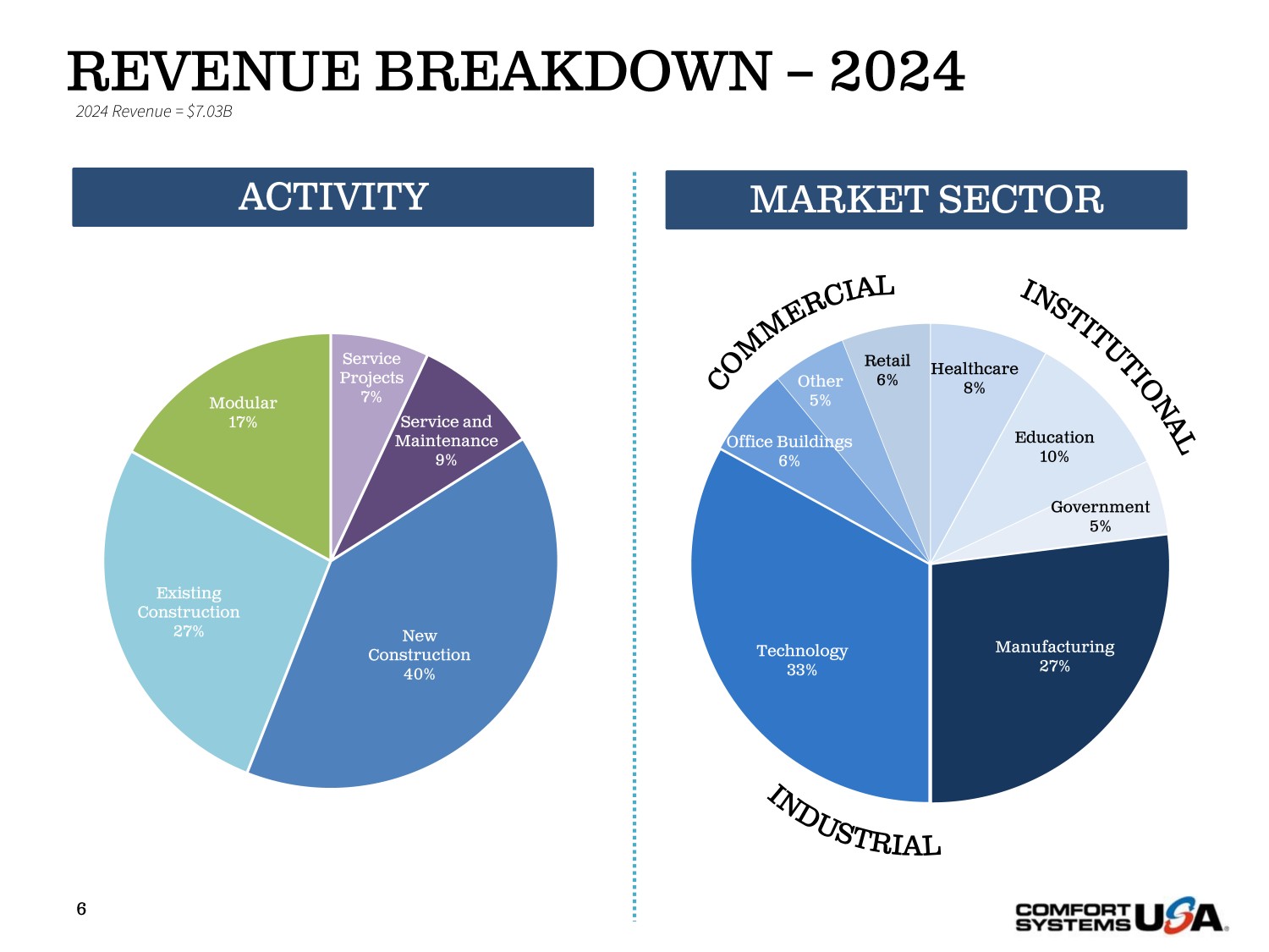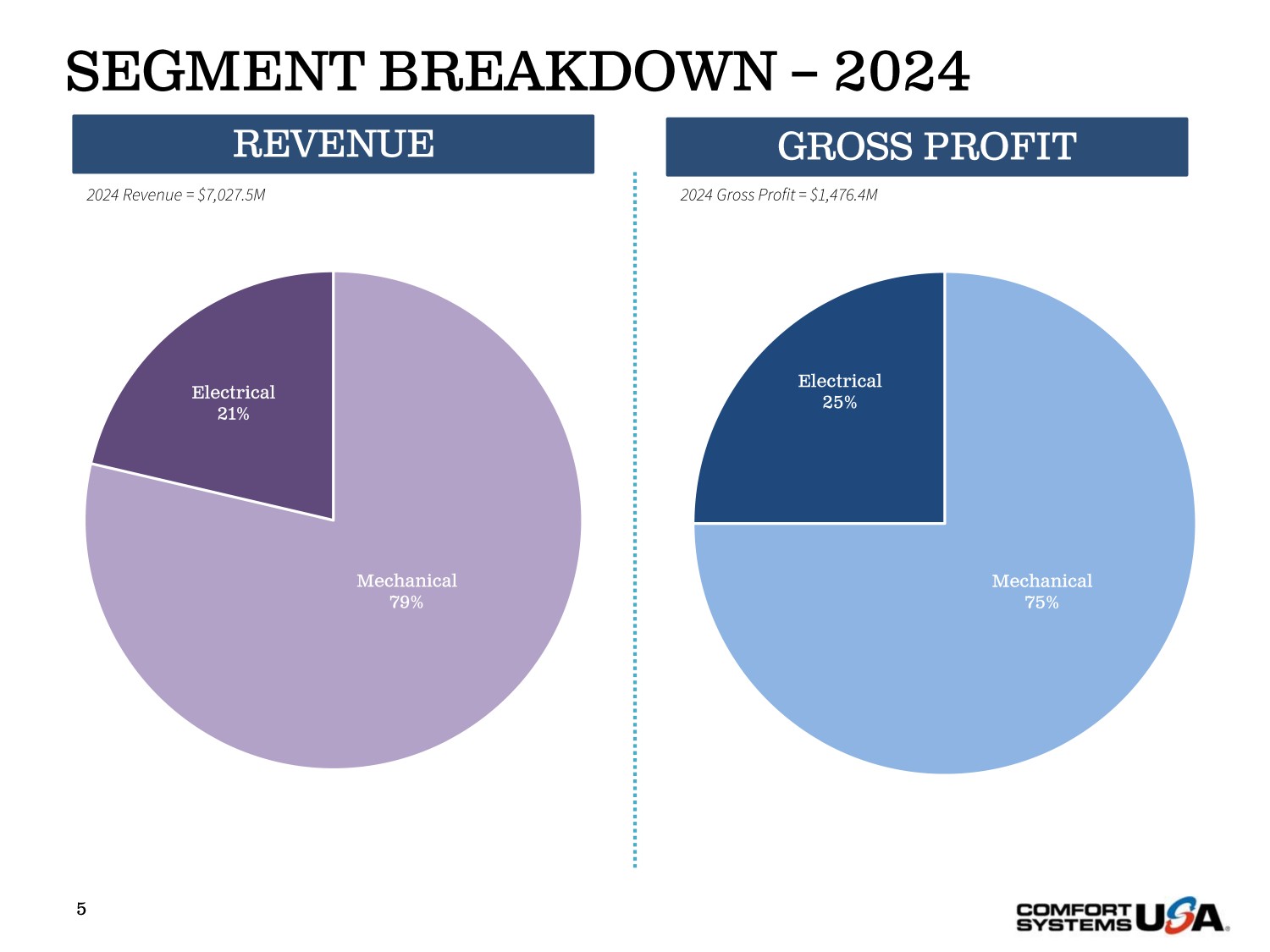 MARKET OUTLOOK 4 Strong Markets • Technology – Data Centers and Chip Manufacturing • Life Sciences - Pharmaceuticals • Food Processing • Manufacturing • Healthcare • EV Battery Trends • Technology • On - Shoring • Modular • Service Mechanical 79% Electrical 21% SEGMENT BREAKDOWN – 2024 5 REVENUE Mechanical 75% Electrical 25% GROSS PROFIT 2024 Gross Profit = $1,476.4M 2024 Revenue = $7,027.5M