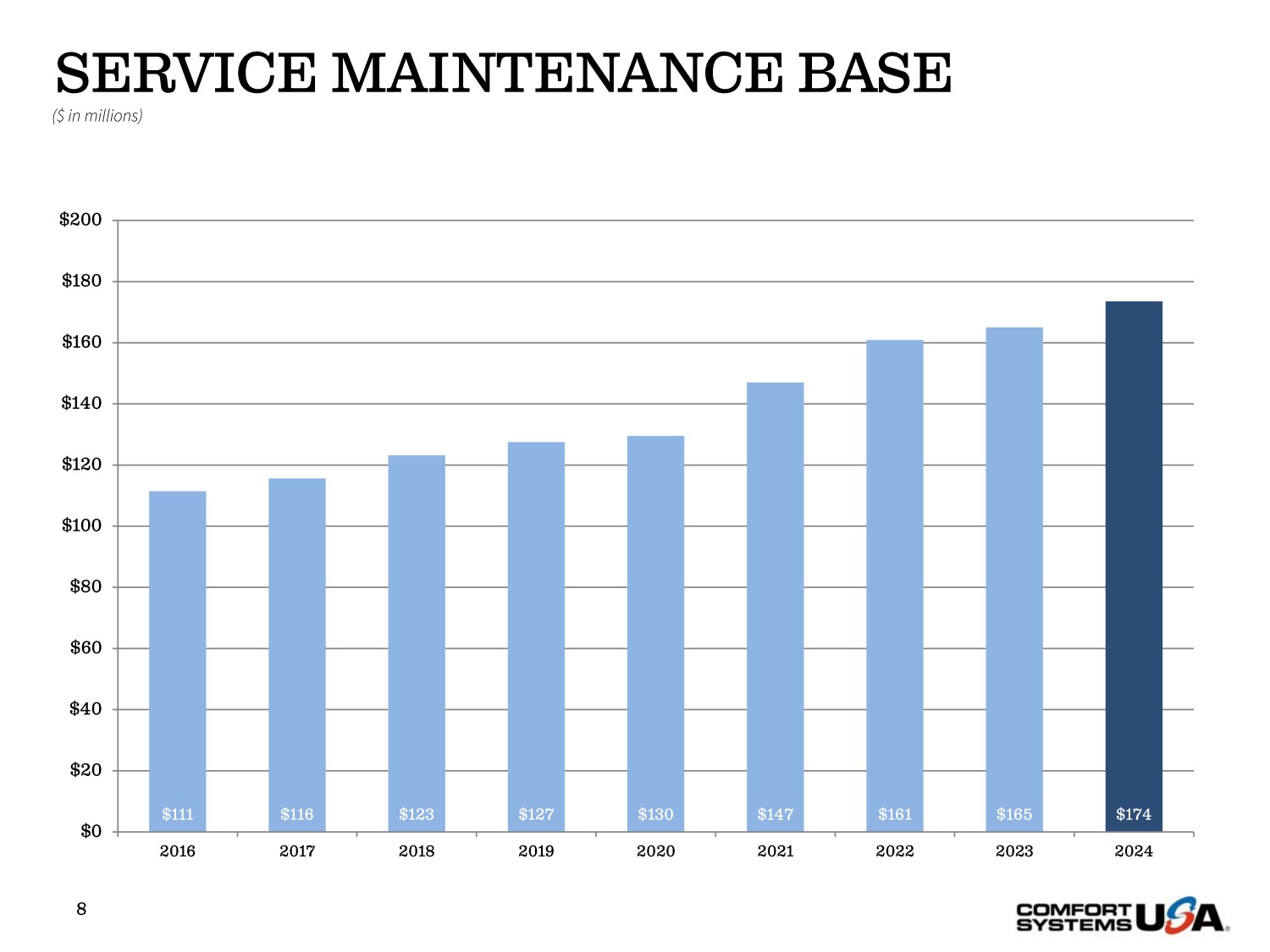SERVICE MAINTENANCE BASE 8 $111 $116 $123 $127 $130 $147 $161 $165 $174 $0 $20 $40 $60 $80 $100 $120 $140 $160 $180 $200 2016 2017 2018 2019 2020 2021 2022 2023 2024 ($ in millions)