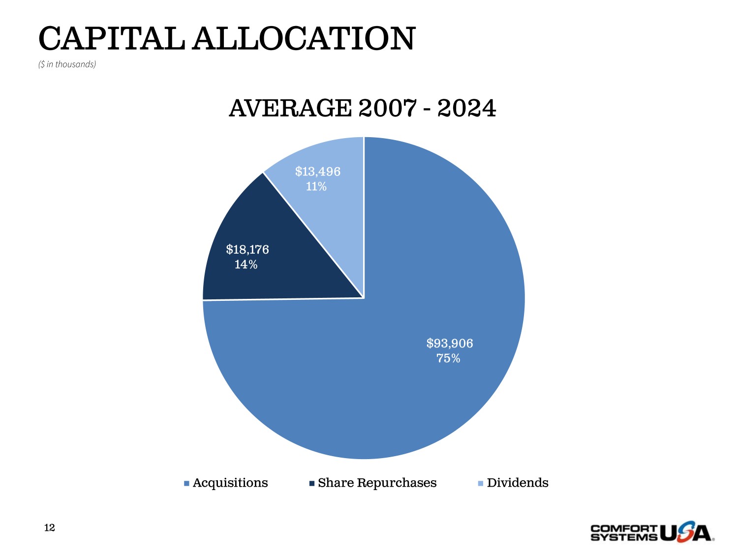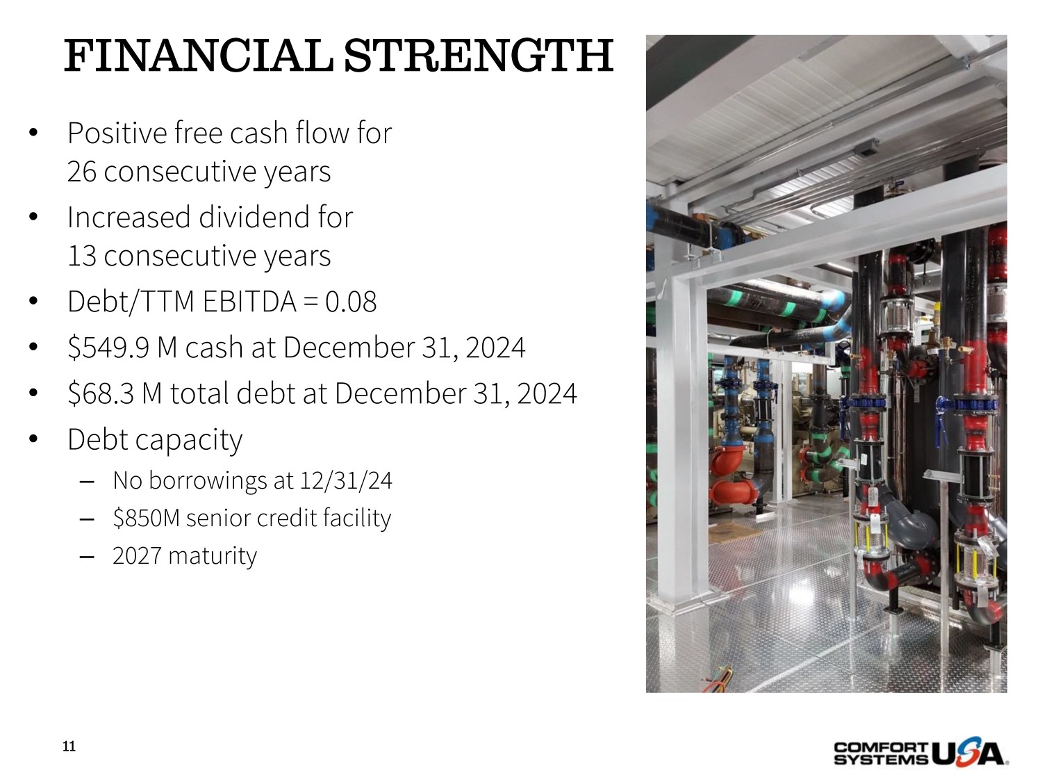 ADVANCE CASH FLOW 10 $849.1 $522.4 $- $100 $200 $300 $400 $500 $600 $700 $800 $900 2024 Operating Cash Flow 2024 Net Income ($ Millions) - Full year 2024 operating cash flow far exceeds full year net income - At 12/31/24, we have a very substantial amount of unearned customer cash - Pre - bookings and equipment advances will normalize creating cash flow headwind when project costs are incurred FINANCIAL STRENGTH • Positive free cash flow for 26 consecutive years • Increased dividend for 13 consecutive years • Debt/TTM EBITDA = 0.08 • $549.9 M cash at December 31, 2024 • $68.3 M total debt at December 31, 2024 • Debt capacity – No borrowings at 12/31/24 – $850M senior credit facility – 2027 maturity 11