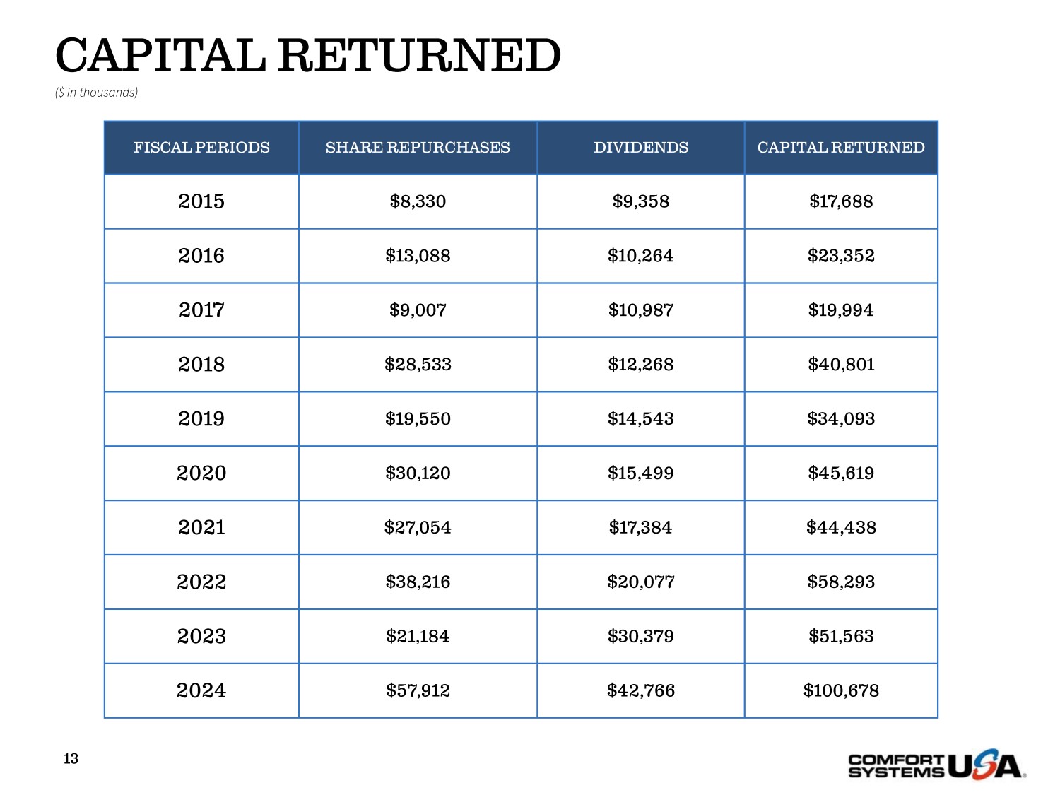 12 CAPITAL ALLOCATION ($ in thousands) $93,906 75% $18,176 14% $13,496 11% AVERAGE 2007 - 2024 Acquisitions Share Repurchases Dividends 13 CAPITAL RETURNED ($ in thousands) CAPITAL RETURNED DIVIDENDS SHARE REPURCHASES FISCAL PERIODS $17,688 $9,358 $8,330 2015 $23,352 $10,264 $13,088 2016 $19,994 $10,987 $9,007 2017 $40,801 $12,268 $28,533 2018 $34,093 $14,543 $19,550 2019 $45,619 $15,499 $30,120 2020 $44,438 $17,384 $27,054 2021 $58,293 $20,077 $38,216 2022 $51,563 $30,379 $21,184 2023 $100,678 $42,766 $57,912 2024 MODULAR OFF - SITE CONSTRUCTION 14