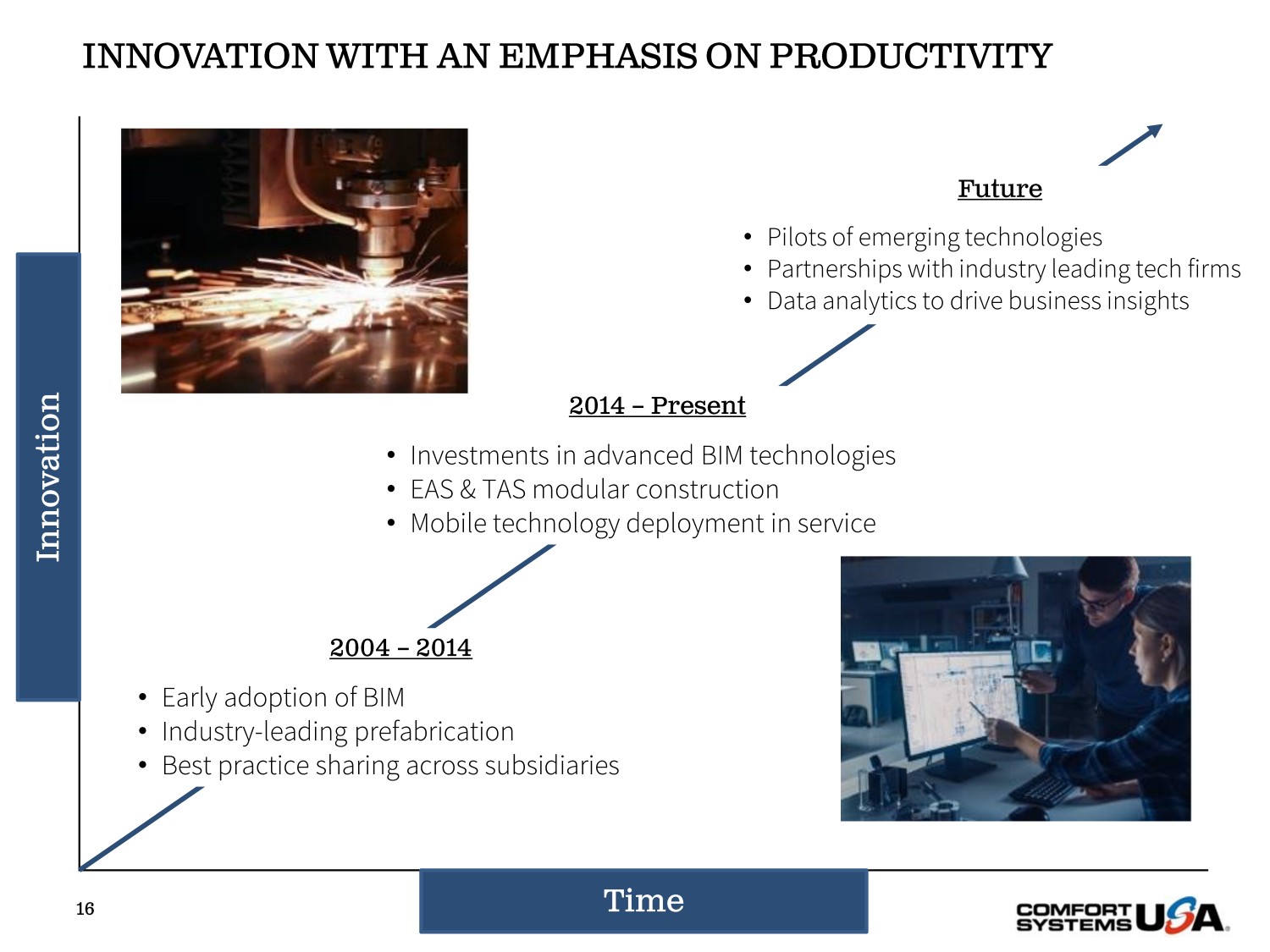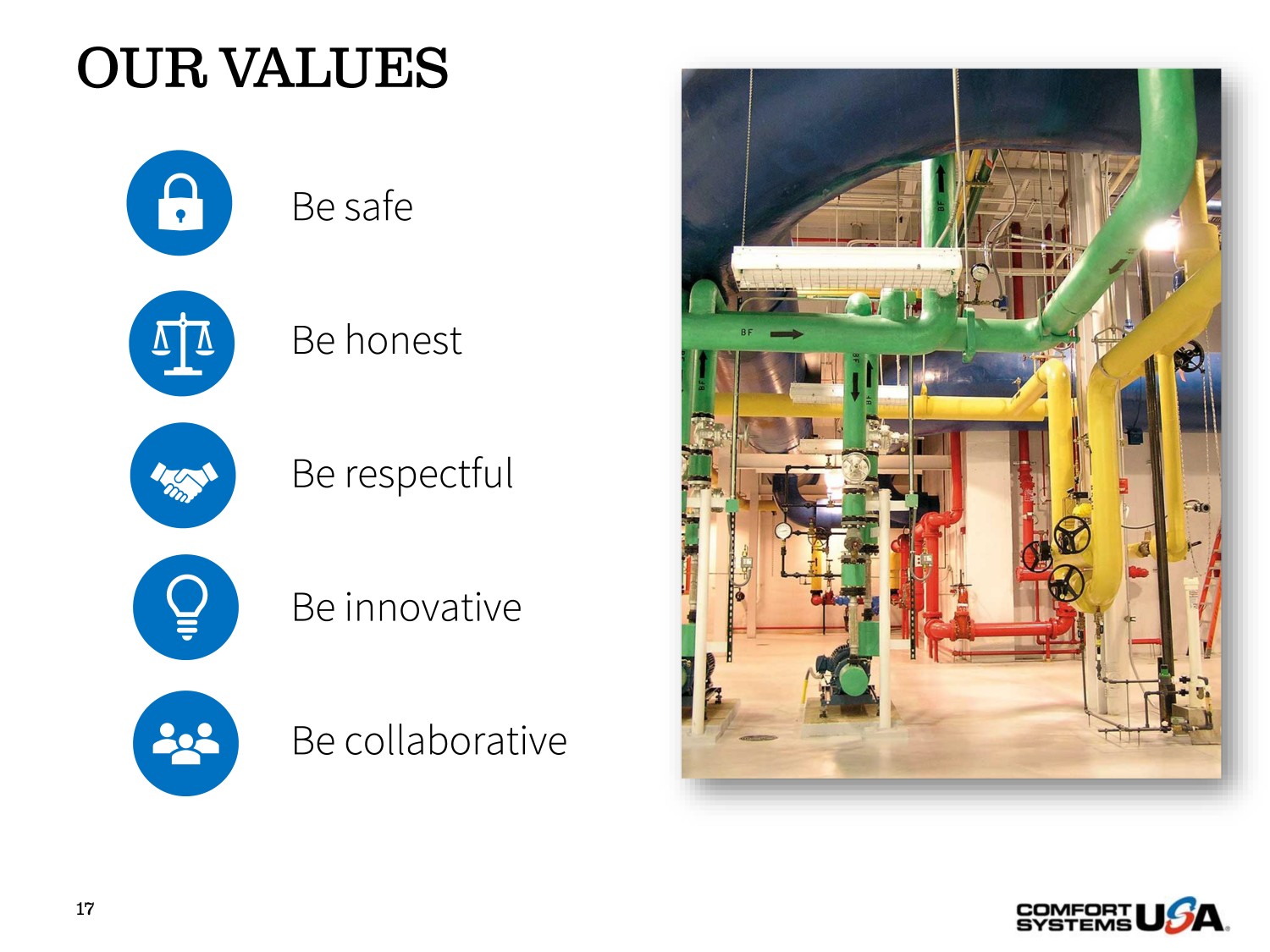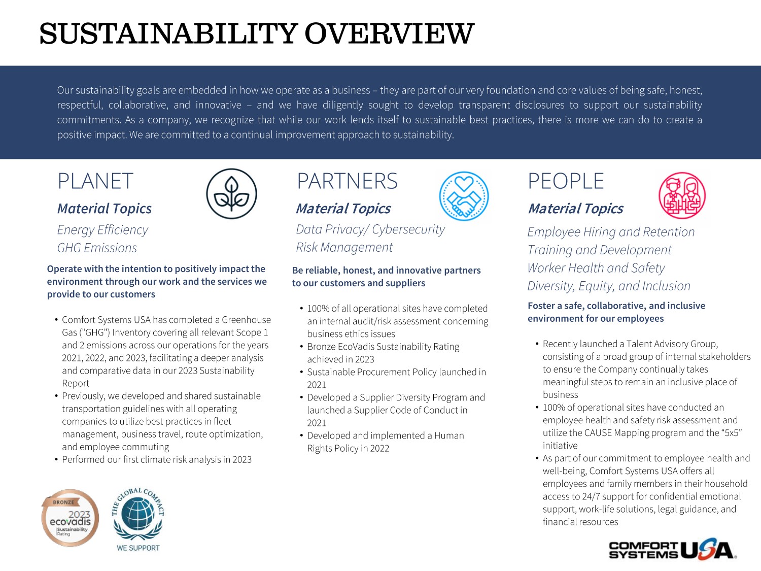 Foster a safe, collaborative, and inclusive environment for our employees • Recently launched a Talent Advisory Group, consisting of a broad group of internal stakeholders to ensure the Company continually takes meaningful steps to remain an inclusive place of business • 100% of operational sites have conducted an employee health and safety risk assessment and utilize the CAUSE Mapping program and the “5x5” initiative • As part of our commitment to employee health and well - being, Comfort Systems USA offers all employees and family members in their household access to 24/7 support for confidential emotional support, work - life solutions, legal guidance, and financial resources Our sustainability goals are embedded in how we operate as a business – they are part of our very foundation and core values of being safe, honest, respectful, collaborative, and innovative – and we have diligently sought to develop transparent disclosures to support our sustainability commitments . As a company, we recognize that while our work lends itself to sustainable best practices, there is more we can do to create a positive impact . We are committed to a continual improvement approach to sustainability . PEOPLE PARTNERS PLANET Be reliable, honest, and innovative partners to our customers and suppliers • 100% of all operational sites have completed an internal audit/risk assessment concerning business ethics issues • Bronze EcoVadis Sustainability Rating achieved in 2023 • Sustainable Procurement Policy launched in 2021 • Developed a Supplier Diversity Program and launched a Supplier Code of Conduct in 2021 • Developed and implemented a Human Rights Policy in 2022 Operate with the intention to positively impact the environment through our work and the services we provide to our customers • Comfort Systems USA has completed a Greenhouse Gas ("GHG") Inventory covering all relevant Scope 1 and 2 emissions across our operations for the years 2021, 2022, and 2023, facilitating a deeper analysis and comparative data in our 2023 Sustainability Report • Previously, we developed and shared sustainable transportation guidelines with all operating companies to utilize best practices in fleet management, business travel, route optimization, and employee commuting • Performed our first climate risk analysis in 2023 Energy Efficiency GHG Emissions Data Privacy/ Cybersecurity Risk Management Employee Hiring and Retention Training and Development Worker Health and Safety Diversity, Equity, and Inclusion Material Topics Material Topics Material Topics SUSTAINABILITY OVERVIEW 15 Time Innovation INNOVATION WITH AN EMPHASIS ON PRODUCTIVITY 2004 – 2014 • Early adoption of BIM • Industry - leading prefabrication • Best practice sharing across subsidiaries 2014 – Present • Investments in advanced BIM technologies • EAS & TAS modular construction • Mobile technology deployment in service Future • Pilots of emerging technologies • Partnerships with industry leading tech firms • Data analytics to drive business insights 16