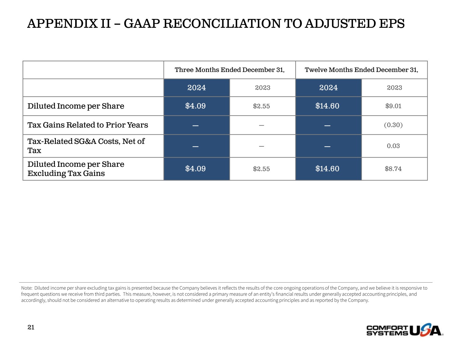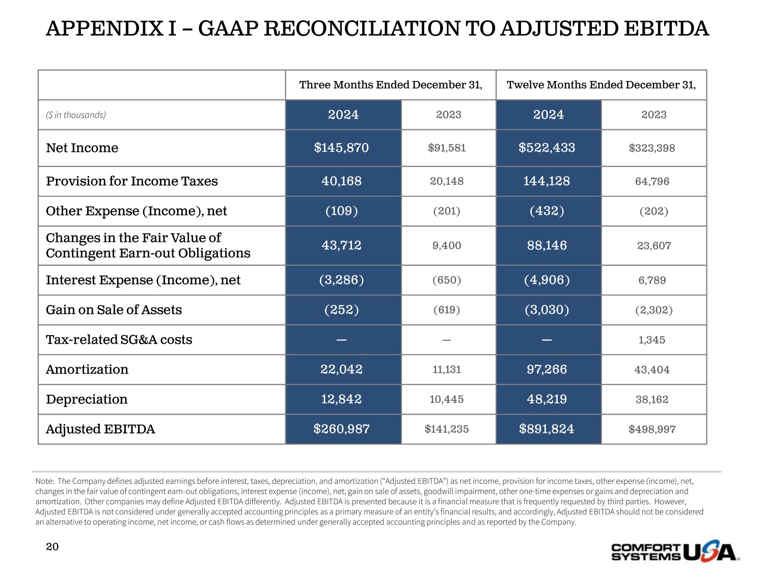 THANK YOU 19 180 Locations 47 operating companies across America at 180 locations in 136 cities 18,000+ of the most qualified HVAC and electrical contracting personnel in America 18,000+ Employees $7.0+ Billion Approximately $7.0+ billion in yearly revenue CONTACT: Julie Shaeff Chief Accounting Officer 1 - 800 - 723 - 8431 ir@comfortsystemsusa.com www.comfortsystemsusa.com APPENDIX I – GAAP RECONCILIATION TO ADJUSTED EBITDA 20 Twelve Months Ended December 31, Three Months Ended December 31, 2023 2024 2023 2024 ($ in thousands) $323,398 $522,433 $91,581 $145,870 Net Income 64,796 144,128 20,148 40,168 Provision for Income Taxes (202) (432) (201) (109) Other Expense (Income), net 23,607 88,146 9,400 43,712 Changes in the Fair Value of Contingent Earn - out Obligations 6,789 (4,906) (650) (3,286) Interest Expense (Income), net (2,302) (3,030) (619) (252) Gain on Sale of Assets 1,345 — — — Tax - related SG&A costs 43,404 97,266 11,131 22,042 Amortization 38,162 48,219 10,445 12,842 Depreciation $498,997 $891,824 $141,235 $260,987 Adjusted EBITDA Note: The Company defines adjusted earnings before interest, taxes, depreciation, and amortization (“Adjusted EBITDA”) as ne t i ncome, provision for income taxes, other expense (income), net, changes in the fair value of contingent earn - out obligations, interest expense (income), net, gain on sale of assets, goodwill i mpairment, other one - time expenses or gains and depreciation and amortization. Other companies may define Adjusted EBITDA differently. Adjusted EBITDA is presented because it is a financia l m easure that is frequently requested by third parties. However, Adjusted EBITDA is not considered under generally accepted accounting principles as a primary measure of an entity’s financia l r esults, and accordingly, Adjusted EBITDA should not be considered an alternative to operating income, net income, or cash flows as determined under generally accepted accounting principles an d a s reported by the Company.