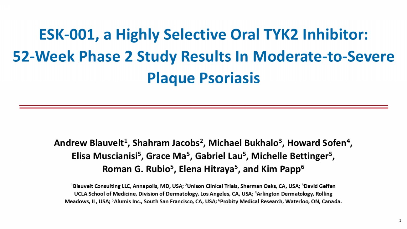 1 ESK - 001, a Highly S elective O ral TYK2 Inhibitor : 52 - Week Phase 2 Study Results In Moderate - to - Severe Plaque Psoriasis Andrew Blauvelt 1 , Shahram Jacobs 2 , Michael Bukhalo 3 , Howard Sofe n 4 , Elisa Muscianisi 5 , Grace Ma 5 , Gabriel Lau 5 , Michelle Bettinger 5 , Roman G. Rubio 5 , Elena Hitraya 5 , and Kim Papp 6 1 Blauvelt Consulting LLC, Annapolis, MD , USA ; 2 Unison Clinical Trials, Sherman Oaks, CA , USA ; 3 David Geffen UCLA School of Medicine, Division of Dermatology, Los Angeles, CA, USA; 4 Arlington Dermatology, Rolling Meadows, IL, USA ; 5 Alumis Inc., South San Francisco, CA, USA; 6 Probity Medical Research, Waterloo, ON, Canada .