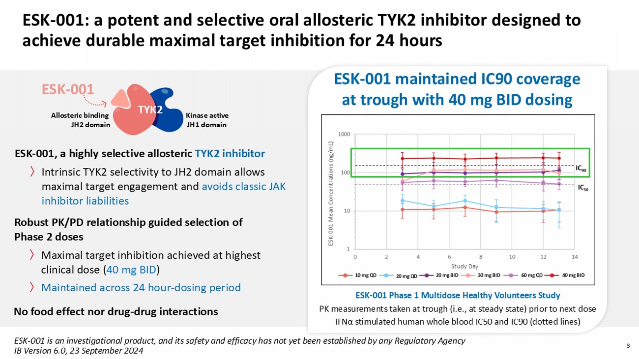| - | ESK-001 is a highly selective, next-generation oral tyrosine kinase 2 (TYK2) inhibitor currently under development in moderate-to-severe plaque psoriasis and systemic lupus |