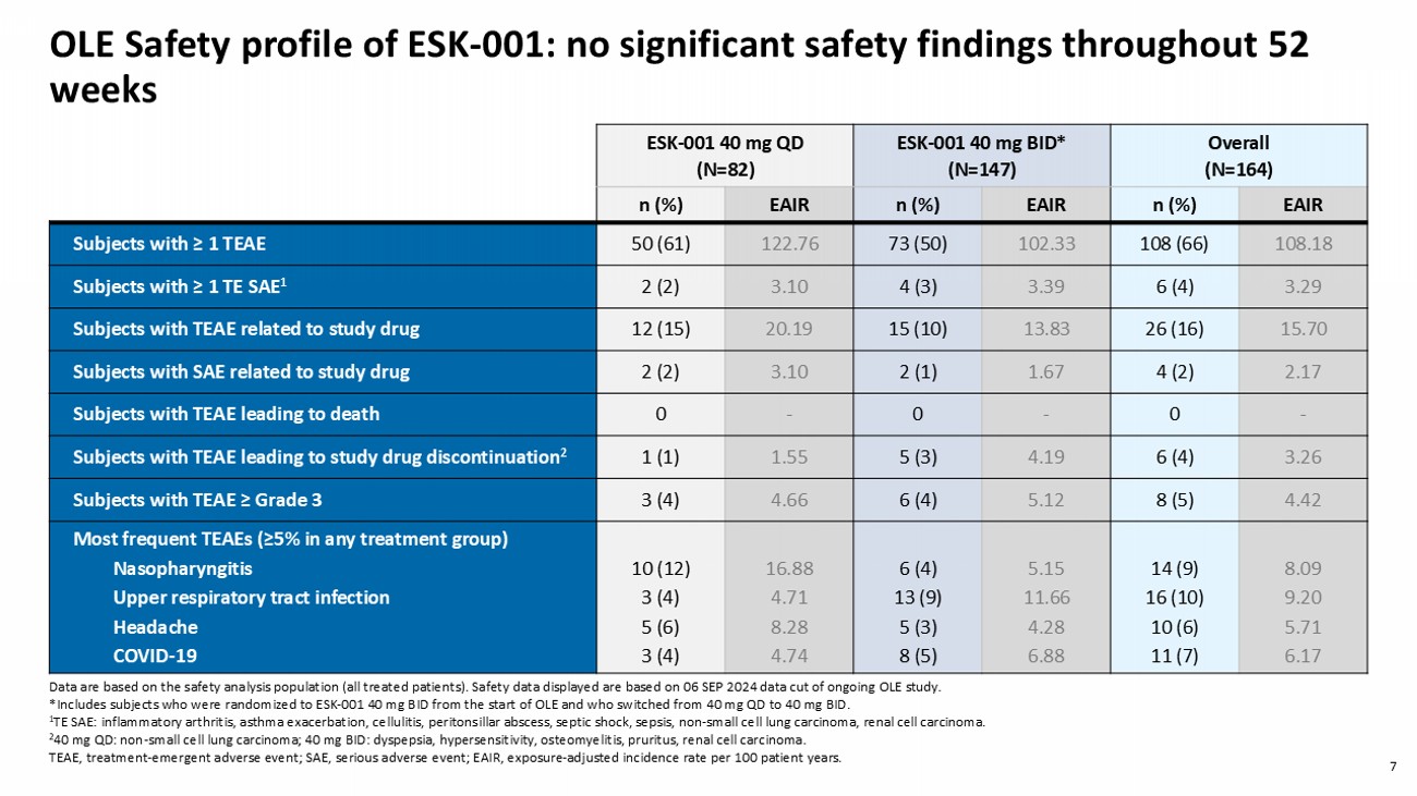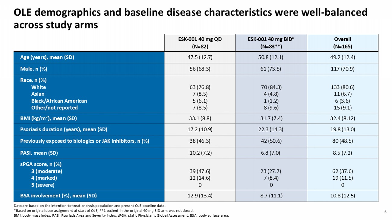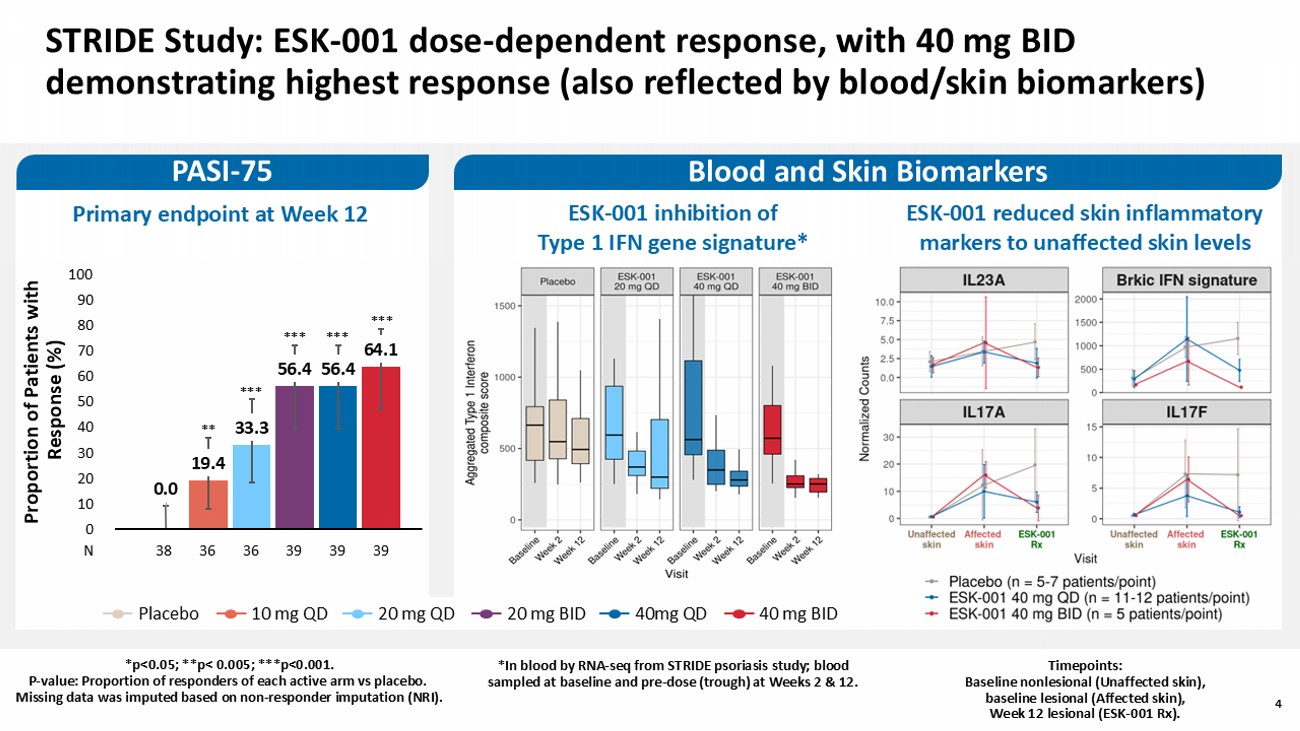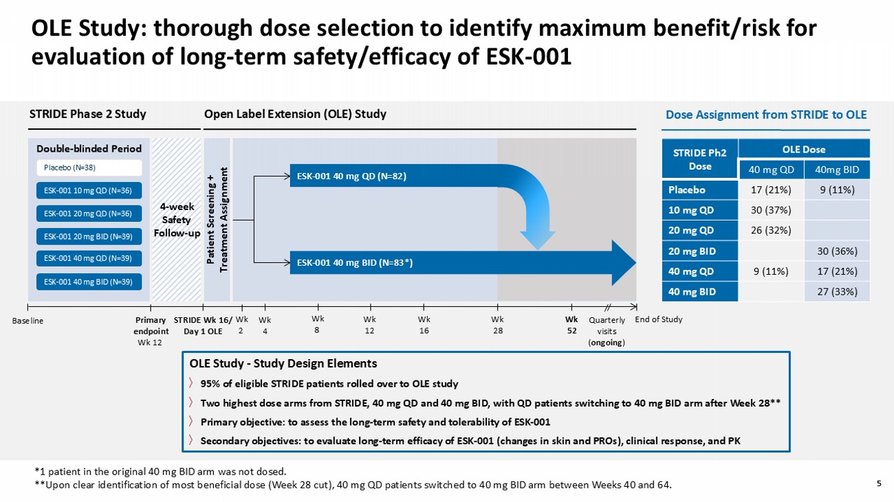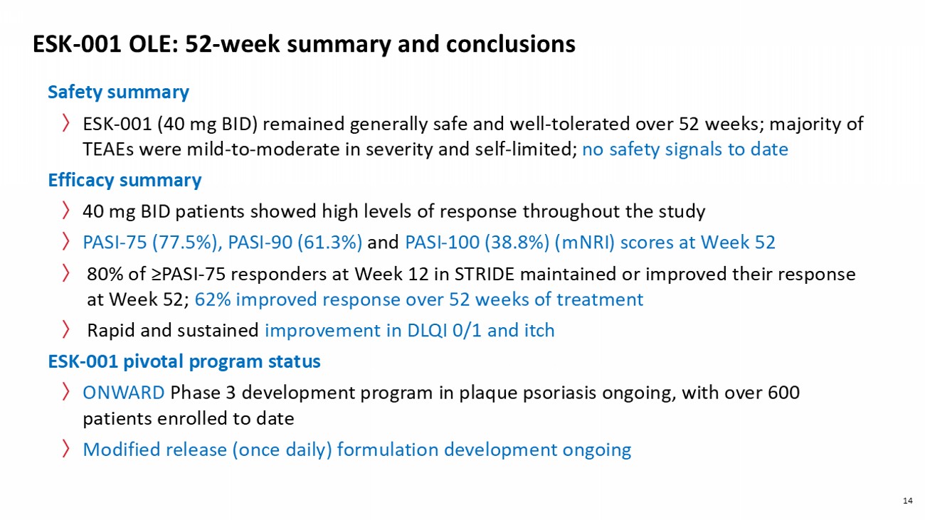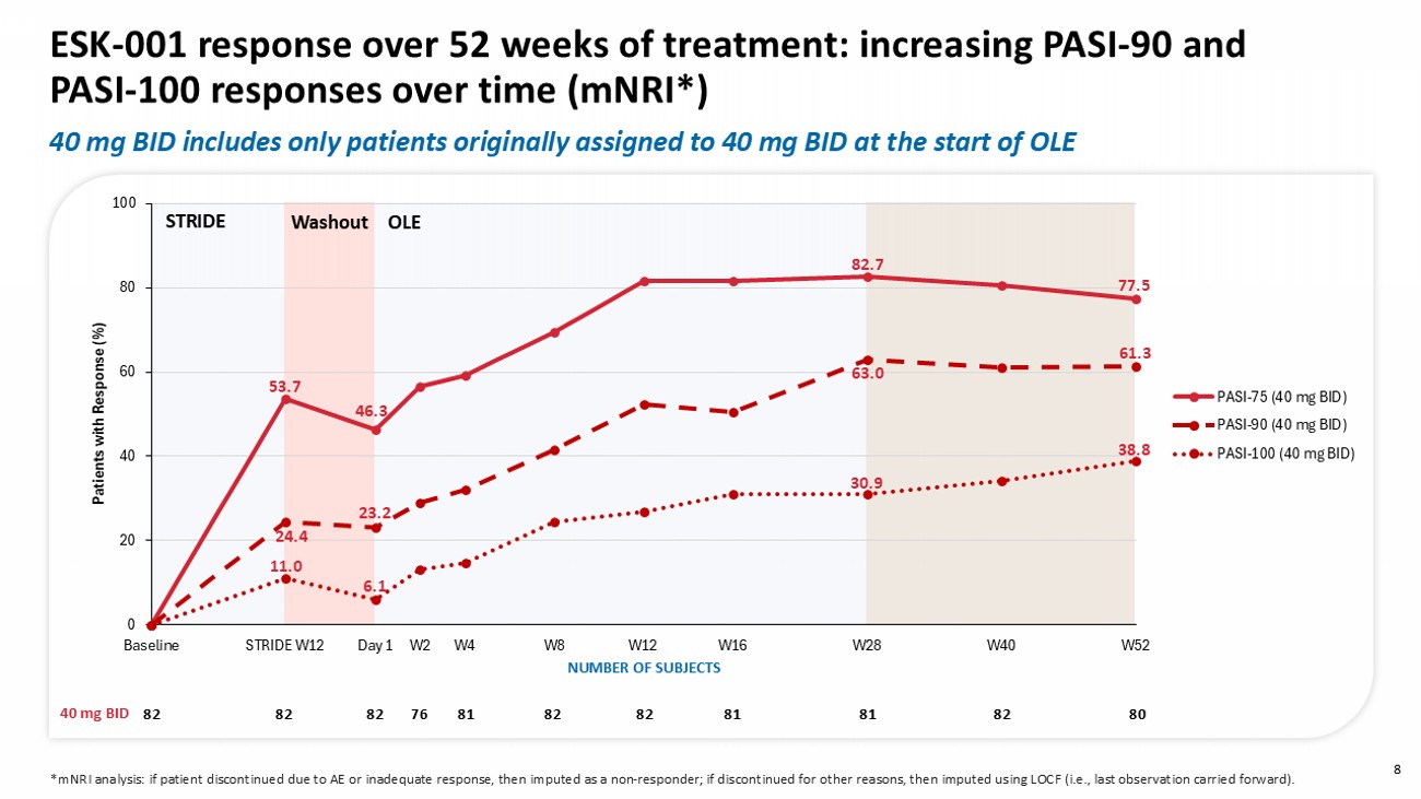 | - | Phase 2 OLE data of ESK-001 at 40 mg BID demonstrated sustained or increasing clinical responses through week 52 on PASI 90, PASI 100, and sPGA 0 |