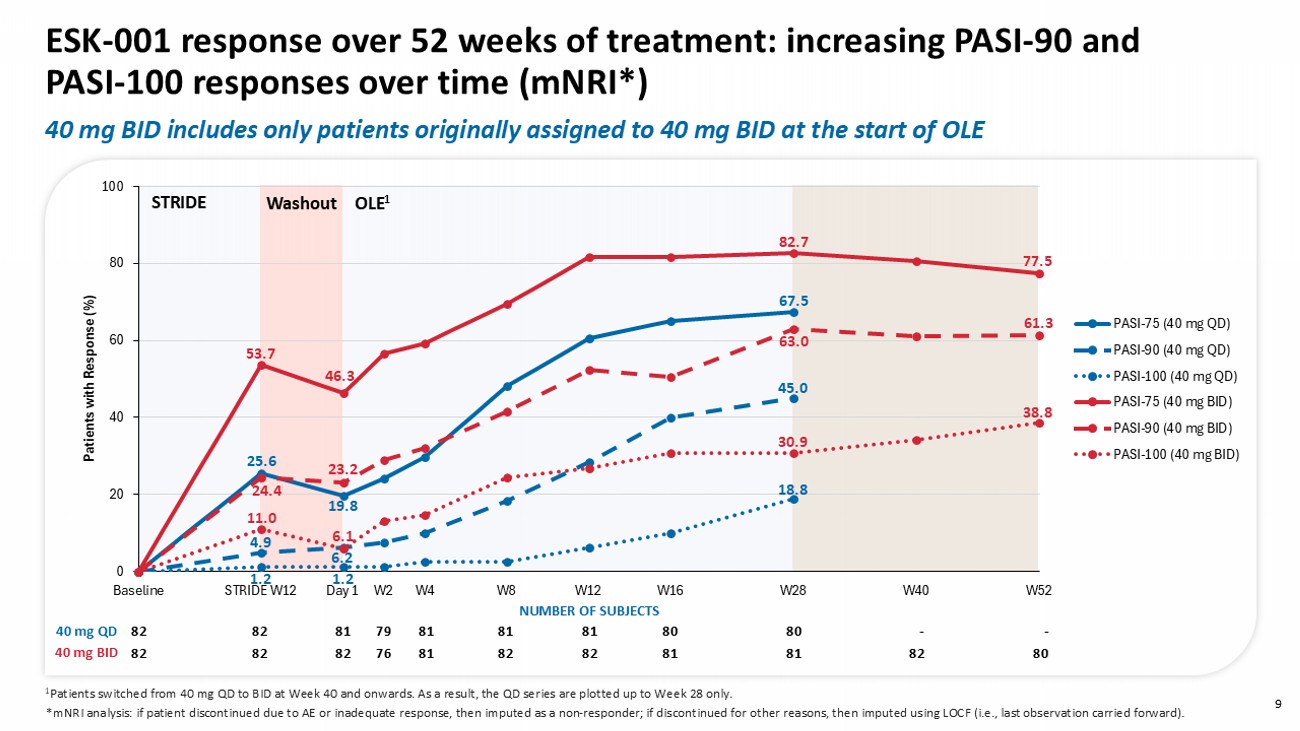 0 20 40 60 80 100 Baseline STRIDE W12 Day 1 W2 W4 W8 W12 W16 W28 W40 W52 Patients with R esponse (%) PASI-75 (40 mg BID) PASI-90 (40 mg BID) PASI-100 (40 mg BID) 53.7 24.4 11.0 46.3 23.2 6.1 82.7 63.0 30.9 77.5 38.8 61.3 Washout STRIDE OLE 8 ESK - 001 response over 52 weeks of treatment: increasing PASI - 90 and PASI - 100 responses over time ( mNRI *) 40 mg BID includes only patients originally assigned to 40 mg BID at the start of OLE * mNRI analysis: if patient discontinued due to AE or inadequate response, then imputed as a non - responder; if discontinued for other reasons, then imputed using LOCF (i.e., last observation carried forward).