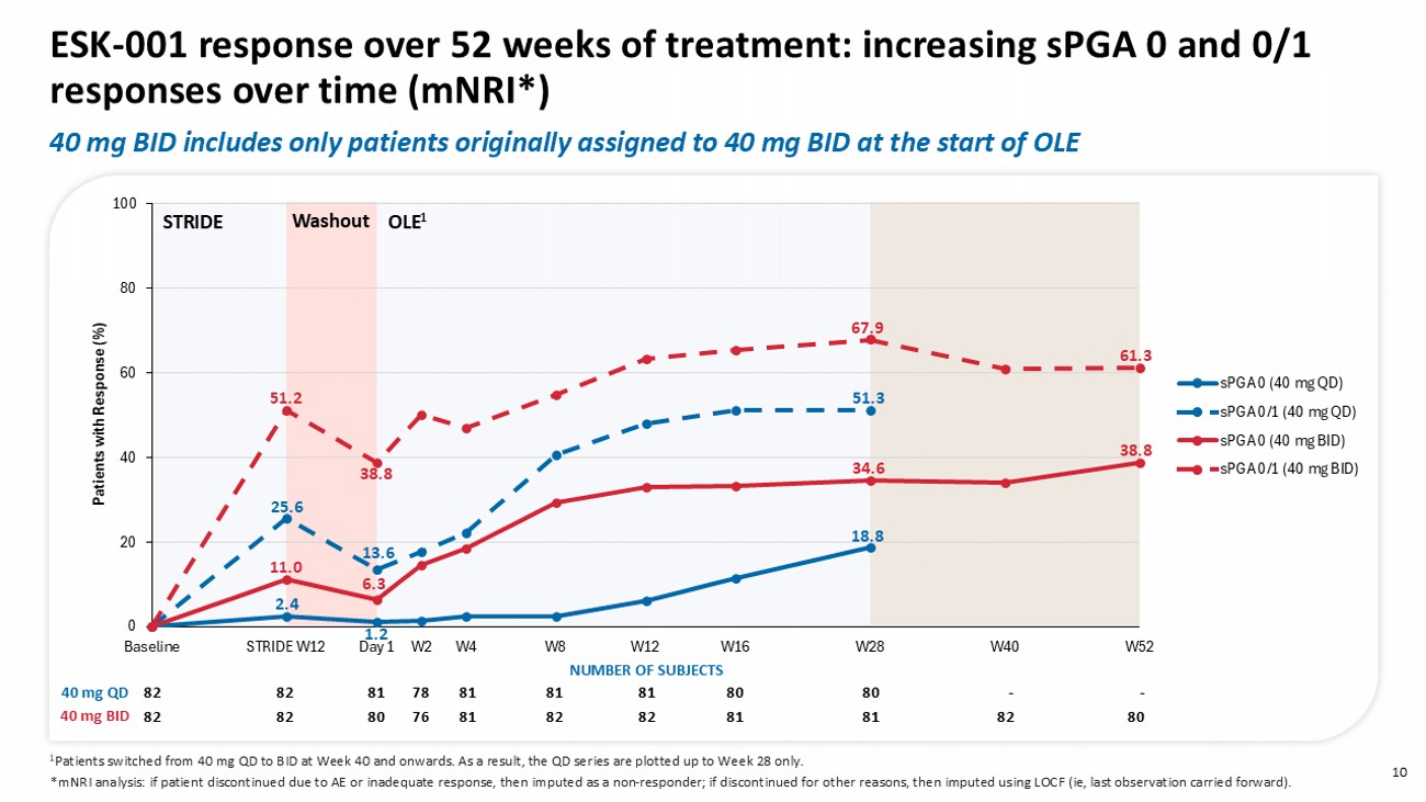 NUMBER OF SUBJECTS 80 82 81 81 82 82 81 76 82 82 82 40 mg BID 0 20 40 60 80 100 Baseline STRIDE W12 Day 1 W2 W4 W8 W12 W16 W28 W40 W52 Patients with R esponse (%) PASI-75 (40 mg QD) PASI-90 (40 mg QD) PASI-100 (40 mg QD) PASI-75 (40 mg BID) PASI-90 (40 mg BID) PASI-100 (40 mg BID) - - 80 80 81 81 81 79 81 82 82 80 82 81 81 82 82 81 76 82 82 82 1 Patients switched from 40 mg QD to BID at Week 40 and onwards. A s a result, the QD series are plotted up to Week 28 only. 40 mg QD 40 mg BID * mNRI analysis: if patient discontinued due to AE or inadequate response, then imputed as a non - responder; if discontinued for other reasons, then imputed using LOCF (i.e., last observation carried forward). NUMBER OF SUBJECTS 25.6 4.9 1.2 19.8 6.2 1.2 67.5 45.0 18.8 53.7 24.4 11.0 46.3 23.2 6.1 82.7 63.0 30.9 77.5 38.8 61.3 Washout STRIDE OLE 1 9 ESK - 001 response over 52 weeks of treatment: increasing PASI - 90 and PASI - 100 responses over time ( mNRI *) 40 mg BID includes only patients originally assigned to 40 mg BID at the start of OLE 0 20 40 60 80 100 Baseline STRIDE W12 Day 1 W2 W4 W8 W12 W16 W28 W40 W52 Patients with R esponse (%) sPGA 0 (40 mg QD) sPGA 0/1 (40 mg QD) sPGA 0 (40 mg BID) sPGA 0/1 (40 mg BID) 10 ESK - 001 response over 52 weeks of treatment: increasing sPGA 0 and 0/1 responses over time ( mNRI *) Washout STRIDE OLE 1 - - 80 80 81 81 81 78 81 82 82 80 82 81 81 82 82 81 76 80 82 82 40 mg QD 40 mg BID NUMBER OF SUBJECTS 61.3 38.8 25.6 51.2 38.8 13.6 67.9 51.3 11.0 2.4 6.3 1.2 18.8 34.6 1 Patients switched from 40 mg QD to BID at Week 40 and onwards.