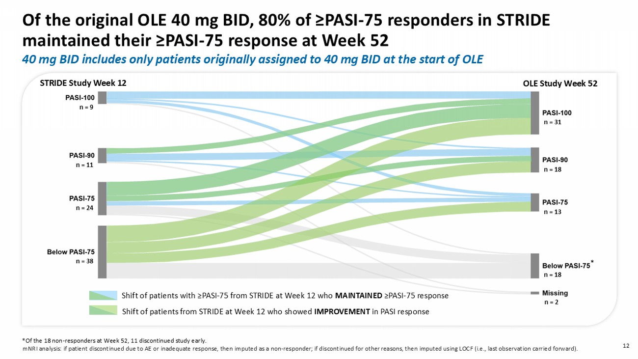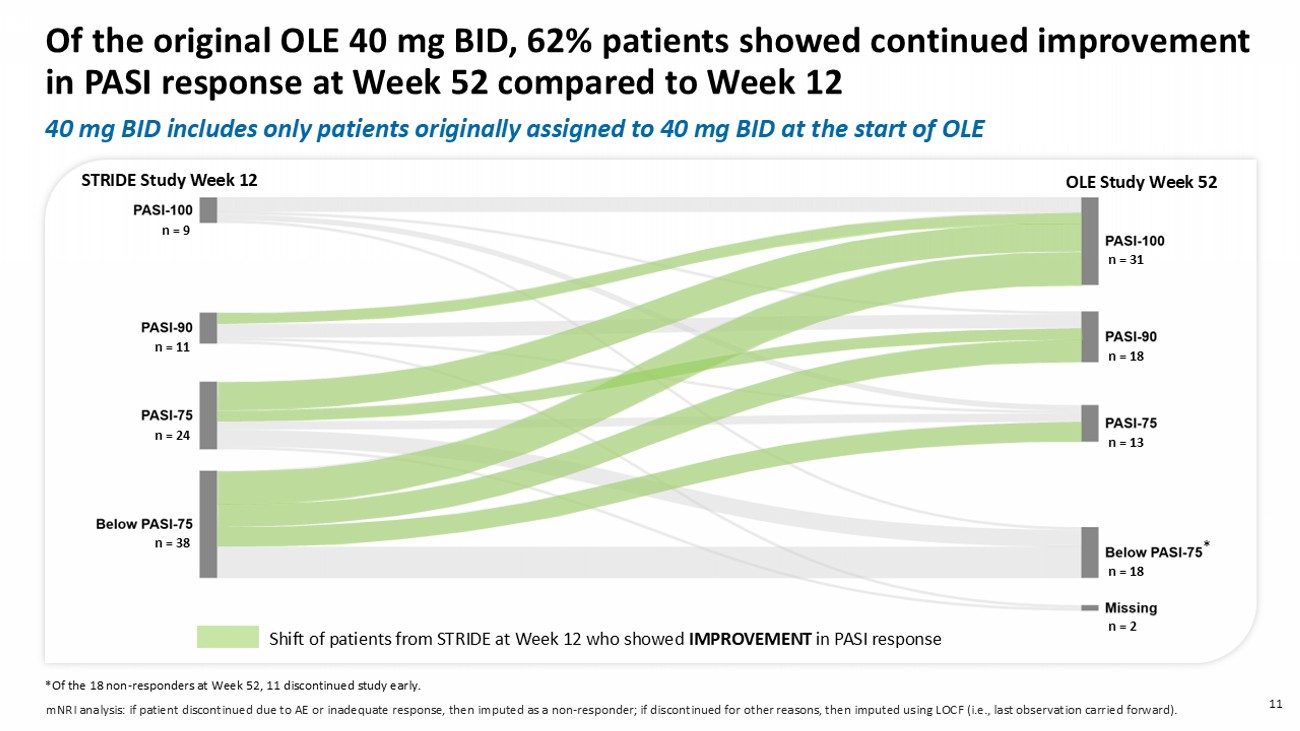 A s a result, the QD series are plotted up to Week 28 only. * mNRI analysis: if patient discontinued due to AE or inadequate response, then imputed as a non - responder; if discontinued for other reasons, then imputed using LOCF ( ie , last observation carried forward). 40 mg BID includes only patients originally assigned to 40 mg BID at the start of OLE 11 Of the original OLE 40 mg BID, 62% patients showed continued improvement in PASI response at Week 52 compared to Week 12 *Of the 18 non - responders at Week 52, 11 discontinued study early.