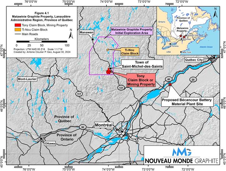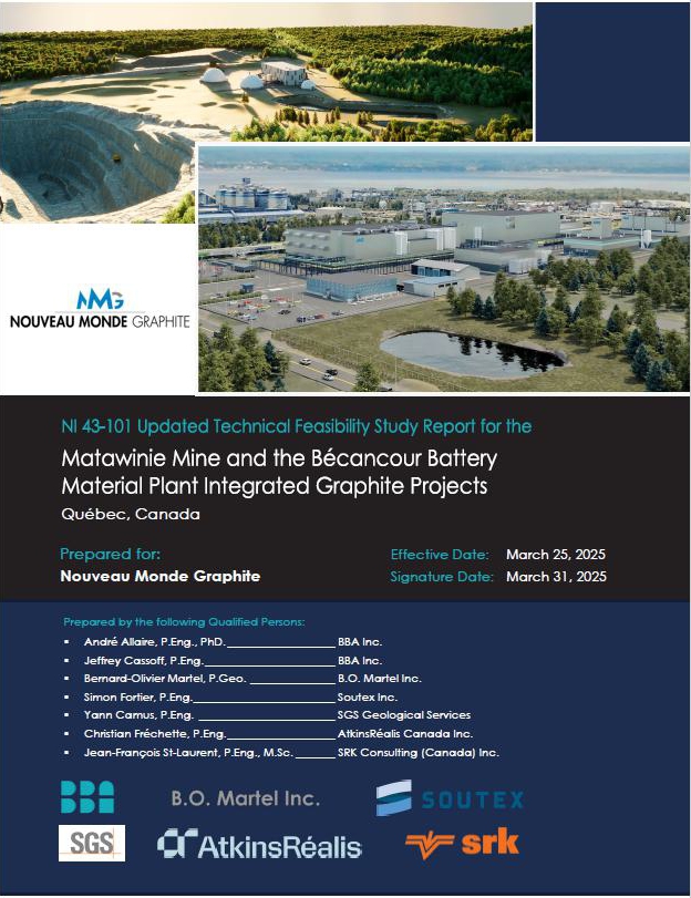 Allaire, A., Cassoff, J., Martel, B.-O., Fortier, S., and Camus, Yann (2022). NI 43-101 Technical Feasibility Study Report for the Matawinie Mine and the Bécancour Battery Material Plant Integrated Graphite Projects, Bécancour, Québec, Canada. Prepared for Nouveau Monde Graphite, dated August 10, 2022. 548 pages.