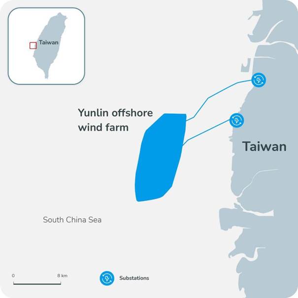 The Yunlin offshore wind farm is located about 15 kilometers off the west coast of Taiwan, at water depths of up to 35 meters. The project consists of 80 wind turbines, each with 8 MW capacity. The electricity generated is fed into the Taiwanese grid and contracted to Taiwan Power Company (TPC) through two 20-year Power Purchase Agreements (PPAs) at an average rate of $165/MWh.