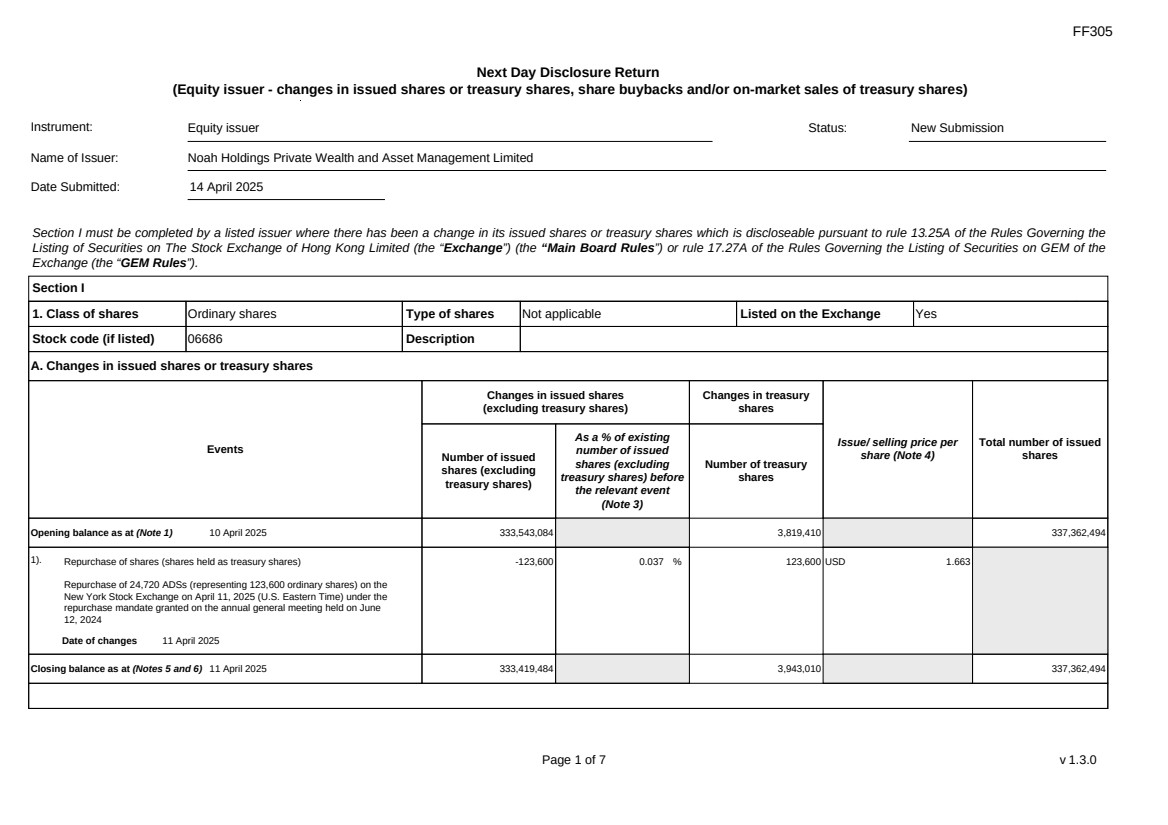 FF305 Page 1 of 7 v 1.3.0 Next Day Disclosure Return (Equity issuer - changes in issued shares or treasury shares, share buybacks and/or on-market sales of treasury shares) Instrument: Equity issuer Status: New Submission Name of Issuer: Noah Holdings Private Wealth and Asset Management Limited Date Submitted: 14 April 2025 Section I must be completed by a listed issuer where there has been a change in its issued shares or treasury shares which is discloseable pursuant to rule 13.25A of the Rules Governing the Listing of Securities on The Stock Exchange of Hong Kong Limited (the “Exchange”) (the “Main Board Rules”) or rule 17.27A of the Rules Governing the Listing of Securities on GEM of the Exchange (the “GEM Rules”). Section I 1. Class of shares Ordinary shares Type of shares Not applicable Listed on the Exchange Yes Stock code (if listed) 06686 Description A. Changes in issued shares or treasury shares Events Changes in issued shares (excluding treasury shares) Number of issued shares (excluding treasury shares) As a % of existing number of issued shares (excluding treasury shares) before the relevant event (Note 3) Changes in treasury shares Number of treasury shares Issue/ selling price per share (Note 4) Total number of issued shares Opening balance as at (Note 1) 10 April 2025 333,543,084 3,819,410 337,362,494 1). Repurchase of shares (shares held as treasury shares) Repurchase of 24,720 ADSs (representing 123,600 ordinary shares) on the New York Stock Exchange on April 11, 2025 (U.S. Eastern Time) under the repurchase mandate granted on the annual general meeting held on June 12, 2024 Date of changes 11 April 2025 -123,600 0.037 % 123,600 USD 1.663 Closing balance as at (Notes 5 and 6) 11 April 2025 333,419,484 3,943,010 337,362,494 |