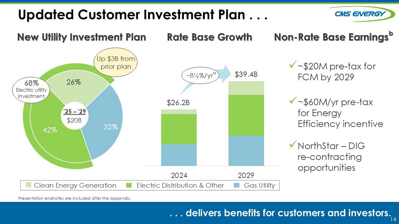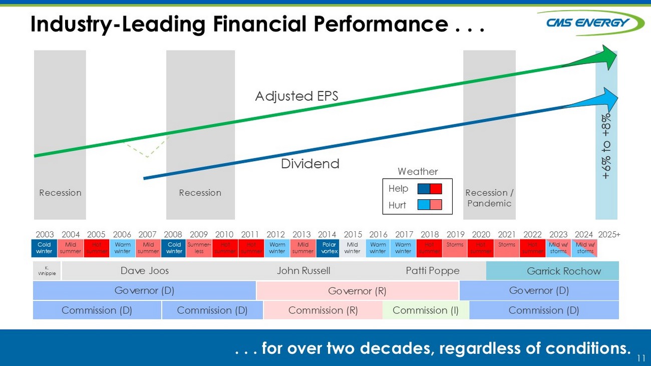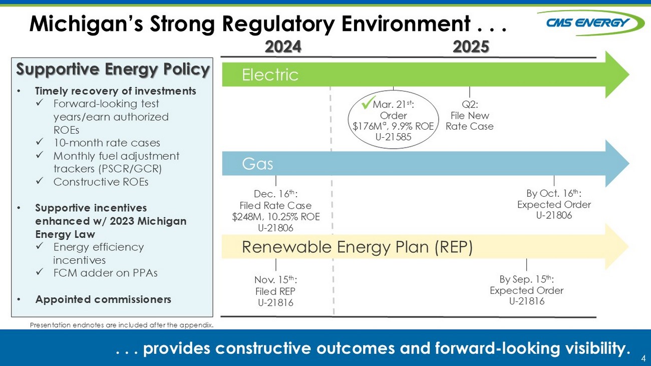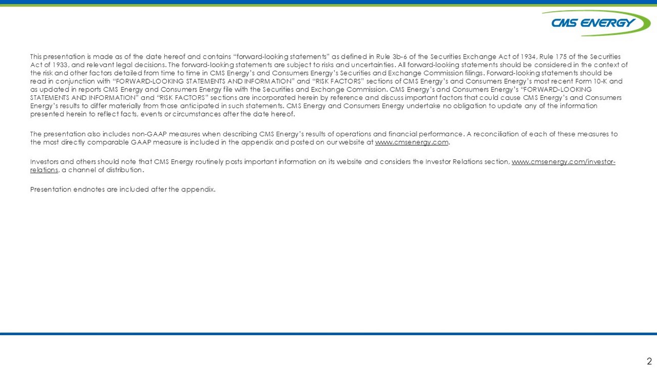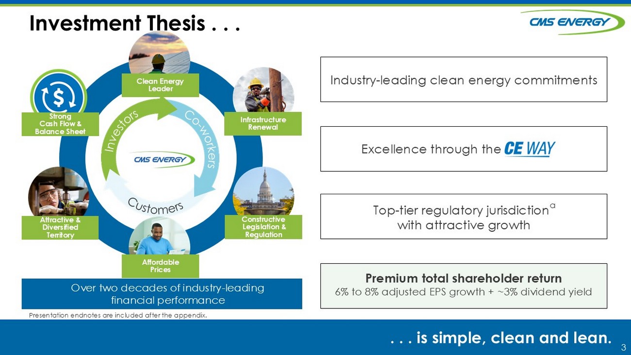 2 Enter “so what” if necessary – Century Gothic, Bold, Size 18 or smaller This presentation is made as of the date hereof and contains “forward - looking statements” as defined in Rule 3b - 6 of the Securit ies Exchange Act of 1934, Rule 175 of the Securities Act of 1933, and relevant legal decisions. The forward - looking statements are subject to risks and uncertainties. All forward - lo oking statements should be considered in the context of the risk and other factors detailed from time to time in CMS Energy’s and Consumers Energy’s Securities and Exchange Commissi on filings. Forward - looking statements should be read in conjunction with “FORWARD - LOOKING STATEMENTS AND INFORMATION” and “RISK FACTORS” sections of CMS Energy’s and Consumers Energy’s most recent Form 10 - K and as updated in reports CMS Energy and Consumers Energy file with the Securities and Exchange Commission. CMS Energy’s and Cons ume rs Energy’s “FORWARD - LOOKING STATEMENTS AND INFORMATION” and “RISK FACTORS” sections are incorporated herein by reference and discuss important factors th at could cause CMS Energy’s and Consumers Energy’s results to differ materially from those anticipated in such statements. CMS Energy and Consumers Energy undertake no ob ligation to update any of the information presented herein to reflect facts, events or circumstances after the date hereof. The presentation also includes non - GAAP measures when describing CMS Energy’s results of operations and financial performance. A reconciliation of each of these measures to the most directly comparable GAAP measure is included in the appendix and posted on our website at www.cmsenergy.com . Investors and others should note that CMS Energy routinely posts important information on its website and considers the Inves tor Relations section, www.cmsenergy.com/investor - relations , a channel of distribution. Presentation endnotes are included after the appendix. 2 3 Investment Thesis . . . . . . is simple, clean and lean. Over two decades of industry - leading financial performance Industry - leading c lean e nergy commitments Excellence through the Top - tier regulatory jurisdiction a with attractive growth Premium total shareholder r eturn 6% to 8% adjusted EPS growth + ~3% dividend yield Presentation endnotes are included after the appendix. Strong Cash Flow & Balance Sheet Attractive & Diversified Territory Clean Energy Leader Infrastructure Renewal Constructive Legislation & Regulation Affordable Prices