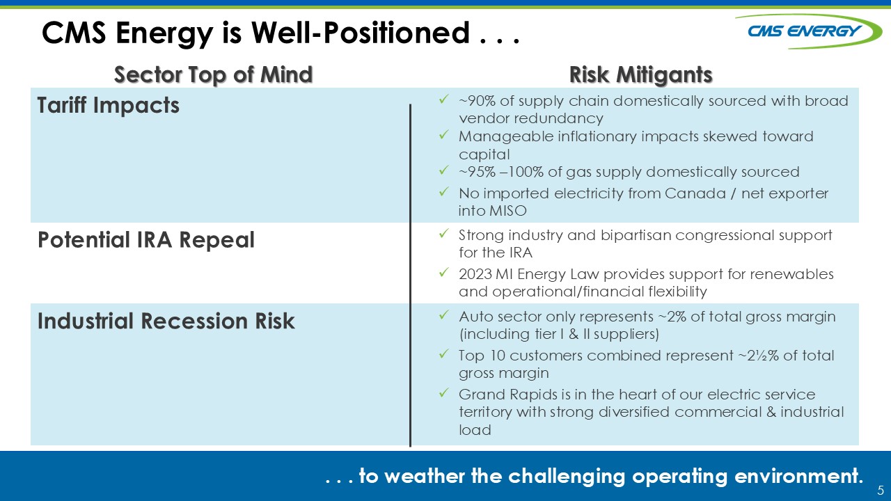 4 Q2: File New Rate Case By Oct. 16 th : Expected Order U - 21806 Dec. 16 th : Filed Rate Case $248M, 10.25% ROE U - 21806 2024 Michigan’s Strong Regulatory Environment . . . . . . provides constructive outcomes and forward - looking visibility. Electric Gas Supportive Energy Policy • Timely recovery of investments x Forward - looking test years/earn authorized ROEs x 10 - month rate cases x Monthly fuel adjustment trackers (PSCR/GCR) x Constructive ROEs • Supportive incentives enhanced w/ 2023 Michigan Energy Law x Energy efficiency incentives x FCM adder on PPAs • Appointed commissioners Renewable Energy Plan (REP) Nov. 15 th : Filed REP U - 21816 Presentation endnotes are included after the appendix. By Sep. 15 th : Expected Order U - 21816 2025 Mar.