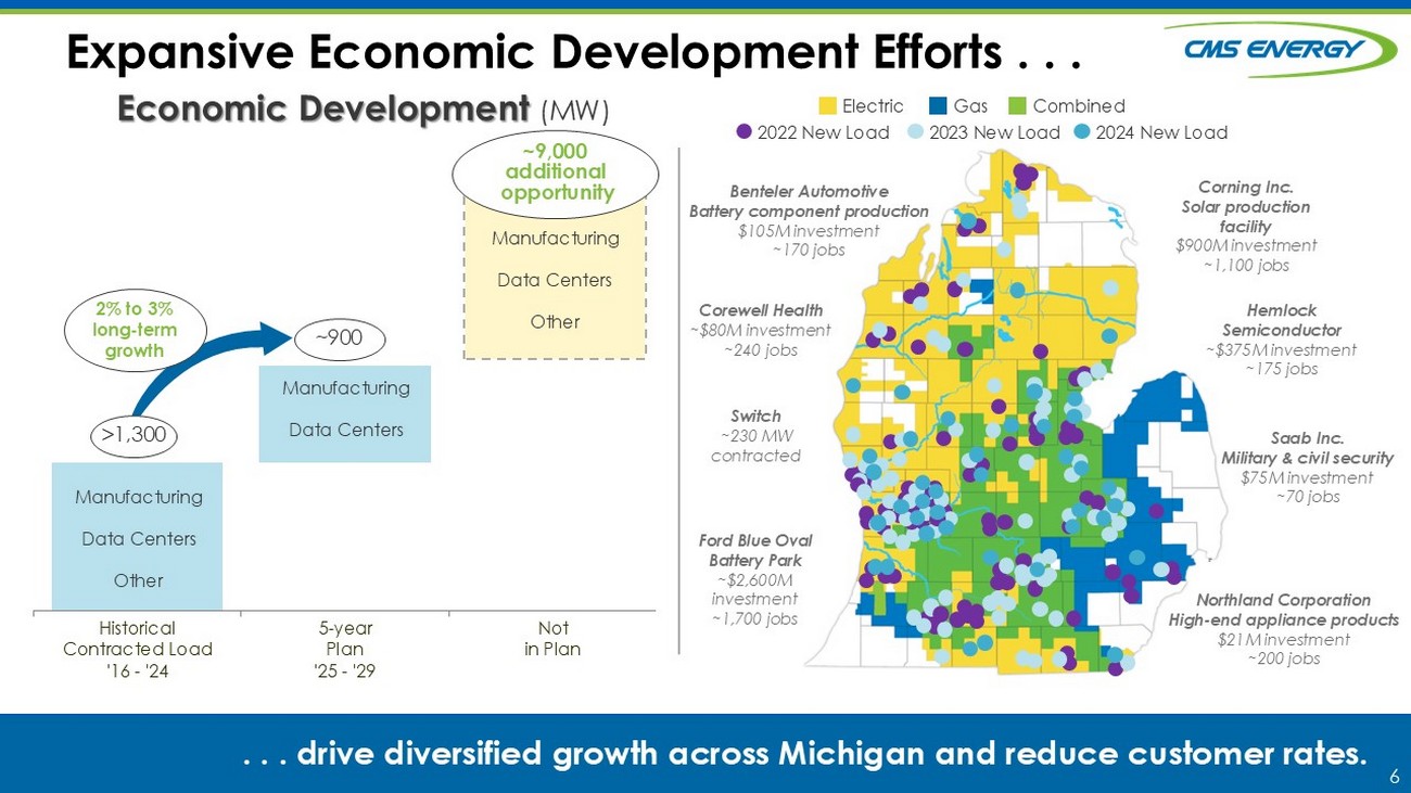 2 1 st : Order $176M a , 9.9% ROE U - 21585 x 5 CMS Energy is Well - Positioned . . . . . . t o weather the challenging operating environment . Sector Top of Mind Risk Mitigants x ~90% of supply chain domestically sourced with broad vendor redundancy x Manageable inflationary impacts skewed toward capital (<0.02% of annual capex budget) x ~95% – 100% of gas supply domestically sourced x No imported electricity from Canada / net exporter into MISO Tariff Impacts x Strong industry and bipartisan congressional support for the IRA x 2023 MI Energy Law provides support for renewables and operational/financial flexibility Potential IRA Repeal x Auto sector only represents ~2% of total gross margin (including tier I & II suppliers) x Top 10 customers combined represent ~2½% of total gross margin x Grand Rapids is in the heart of our electric service territory with strong diversified commercial & industrial load Industrial Recession Risk 6 Expansive Economic Development Efforts . . . . . . drive diversified growth across Michigan and reduce customer rates. Electric Gas Combined 2022 New Load 2023 New Load 2024 New Load Corning Inc. Solar production facility $900M investment ~1,100 jobs Saab Inc. Military & civil security $75M investment ~70 jobs Northland Corporation High - end appliance products $21M investment ~200 jobs Hemlock Semiconductor ~$375M investment ~175 jobs Ford Blue Oval Battery Park ~$2,600M investment ~1,700 jobs Benteler Automotive Battery component production $105M investment ~170 jobs Corewell Health ~$ 80 M investment ~ 240 jobs Switch ~230 MW contracted Economic Development (MW) Historical Contracted Load '16 - '24 5-year Plan '25 - '29 Not in Plan >1 ,300 ~900 2% to 3% l ong - term g rowth Manufacturing Data Centers Other ~ 9,000 additional opportunity Manufacturing Data Centers Manufacturing Data Centers Other