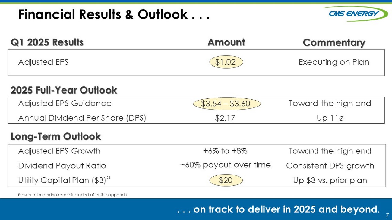 “Results from the first quarter show we are on track to deliver operationally and financially for 2025,” said Garrick Rochow, President and CEO of CMS Energy and Consumers Energy. “A constructive outcome in our electric rate case in March, which supports needed investments in our electric Reliability Roadmap; sustained momentum on the economic development front; and steady progress on a variety of customer investment projects in our electric and gas systems together support our triple bottom line of people, planet and prosperity.”