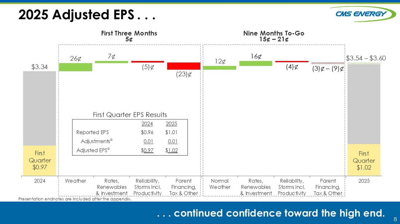 CMS Energy reaffirmed its 2025 adjusted earnings guidance of $3.54 to $3.60 per share (*See below for important information about non-GAAP measures) and long-term adjusted EPS growth of 6 to 8 percent, with continued confidence toward the high end.