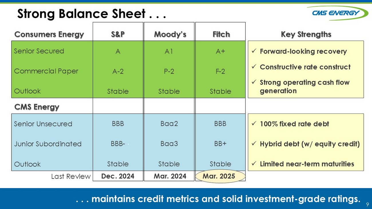 $3.54 – $3.60 26¢ $3.34 7¢ (23)¢ 12¢ 16¢ (3) ¢ – (9)¢ (5)¢ ( 4 )¢ First Quarter $1.02 First Quarter $0.97 2025 2024 $1.01 $0.96 Reported EPS 0.01 0.01 Adjustments a $ 1.02 $ 0.97 Adjusted EPS a First Quarter EPS Results 9 . Strong Balance Sheet . . . . . . m aintains credit metrics and solid investment - grade ratings. Consumers Energy CMS Energy Senior Secured Commercial Paper Outlook Senior Unsecured Junior Subordinated Outlook Last Review A1 P - 2 Stable Baa2 Baa3 Stable Mar. 2024 A+ F - 2 Stable BBB BB+ Stable Mar. 2025 S&P Moody’s Fitch x Forward - looking recovery x Constructive rate construct x Strong operating cash flow generation x 100% fixed rate debt x Hybrid debt (w/ equity credit) x Limited near - term maturities Key Strengths A A - 2 Stable BBB BBB - Stable Dec. 2024 Mar. 2025 10 YTD Plan ($M) ($M) Consumers Energy: -- $1,125 First Mortgage Bonds CMS Energy: $1,000 $1,270 New Debt Issuances -- Up to $500 Planned Equity Retirements (incl.