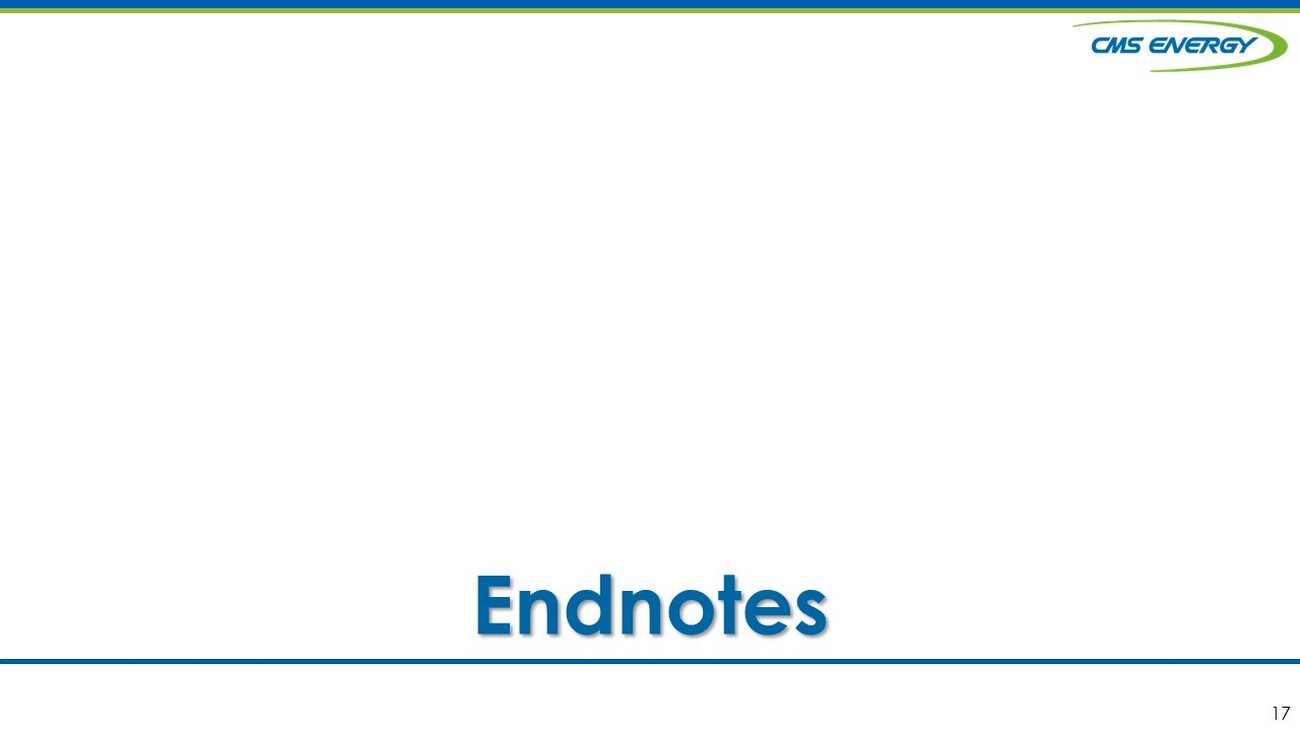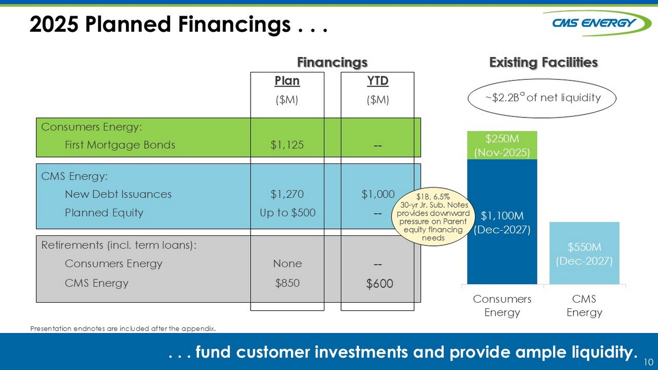 term loans): -- None Consumers Energy $600 $850 CMS Energy Existing Facilities $1,100M (Dec - 2027) $550M (Dec - 2027) $250M (Nov - 2025) Consumers Energy CMS Energy Financings 2025 Planned Financings . . . . . . fund customer investments and provide ample liquidity. Presentation endnotes are included after the appendix. ~$2.2B a of net liquidity $1B, 6.5% 30 - yr Jr. Sub.