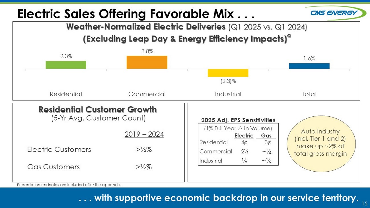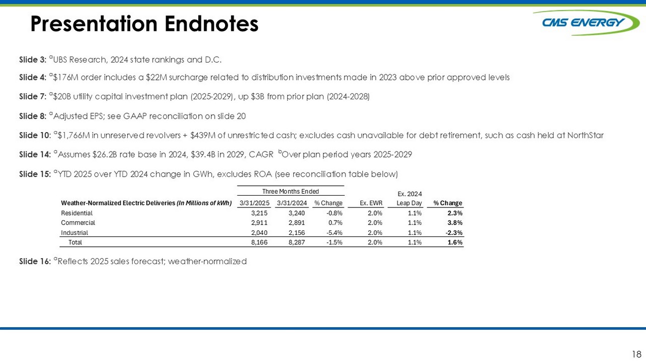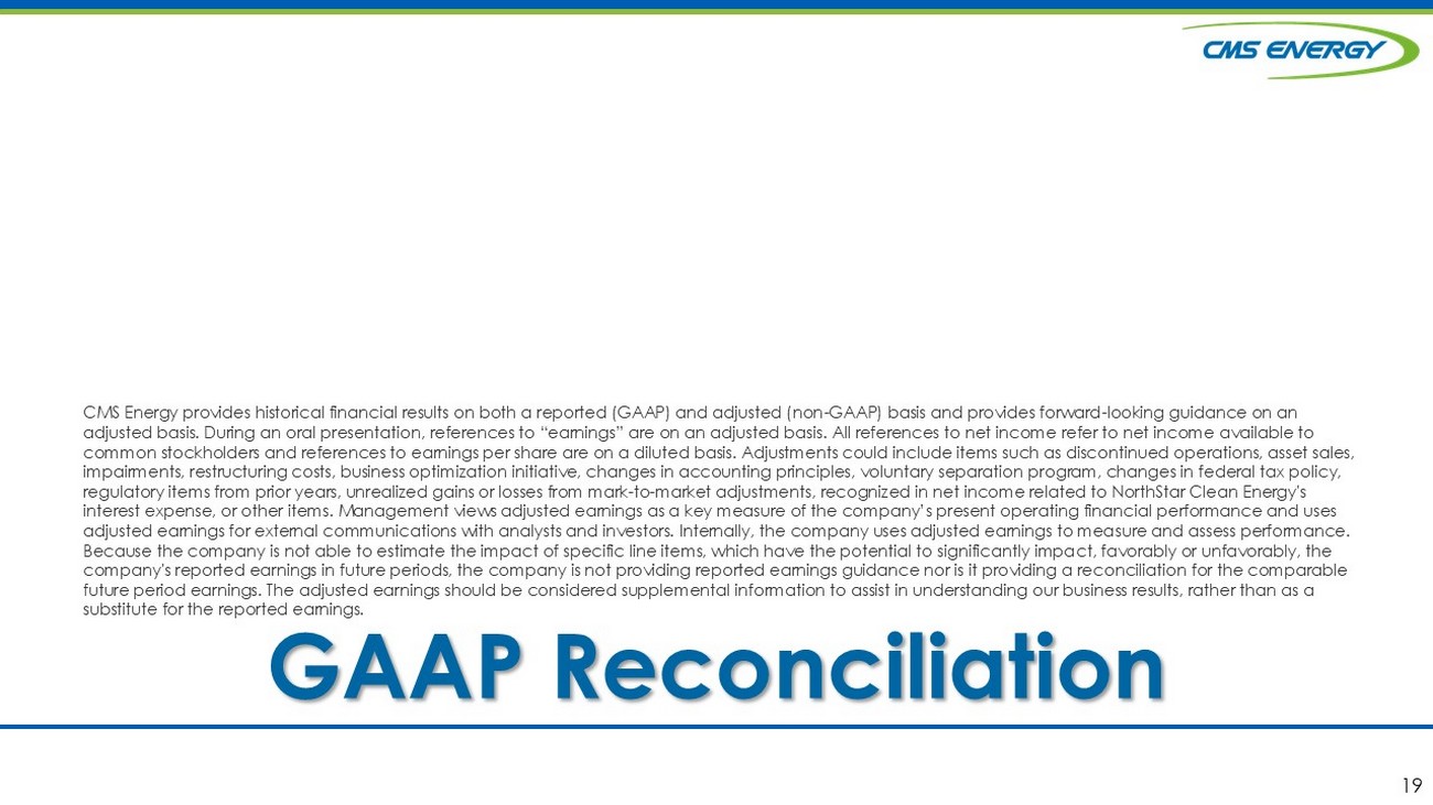 EPS Sensitivities Gas ½ ~½ ~½ < 18 Presentation Endnotes Slide 3: a UBS Research, 2024 state rankings and D.C. Slide 4: a $176M order includes a $22M surcharge related to distribution investments made in 2023 above prior approved levels Slide 7: a $20B utility capital investment plan (2025 - 2029), up $3B from prior plan (2024 - 2028) Slide 8: a Adjusted EPS; see GAAP reconciliation on slide 20 Slide 10 : a $1,766M in unreserved revolvers + $439M of unrestricted cash; excludes cash unavailable for debt retirement, such as cash hel d a t NorthStar Slide 14: a Assumes $2 6 .2B rate base in 2024, $39.4B in 2029, CAGR b Over plan period years 2025 - 2029 Slide 15: a YTD 2025 over YTD 2024 change in GWh, excludes ROA (see reconciliation table below) Slide 16: a Reflects 2025 sales forecast; weather - normalized 18 Weather-Normalized Electric Deliveries (In Millions of kWh)3/31/2025 3/31/2024 % Change Ex. EWR Residential 3,215 3,240 -0.8% 2.0% 1.1% 2.3% Commercial 2,911 2,891 0.7% 2.0% 1.1% 3.8% Industrial 2,040 2,156 -5.4% 2.0% 1.1% -2.3% Total 8,166 8,287 -1.5% 2.0% 1.1% 1.6% Three Months Ended % Change Ex. 2024 Leap Day 19 GAAP Reconciliation CMS Energy provides historical financial results on both a reported (GAAP) and adjusted (non - GAAP) basis and provides forward - lo oking guidance on an adjusted basis.