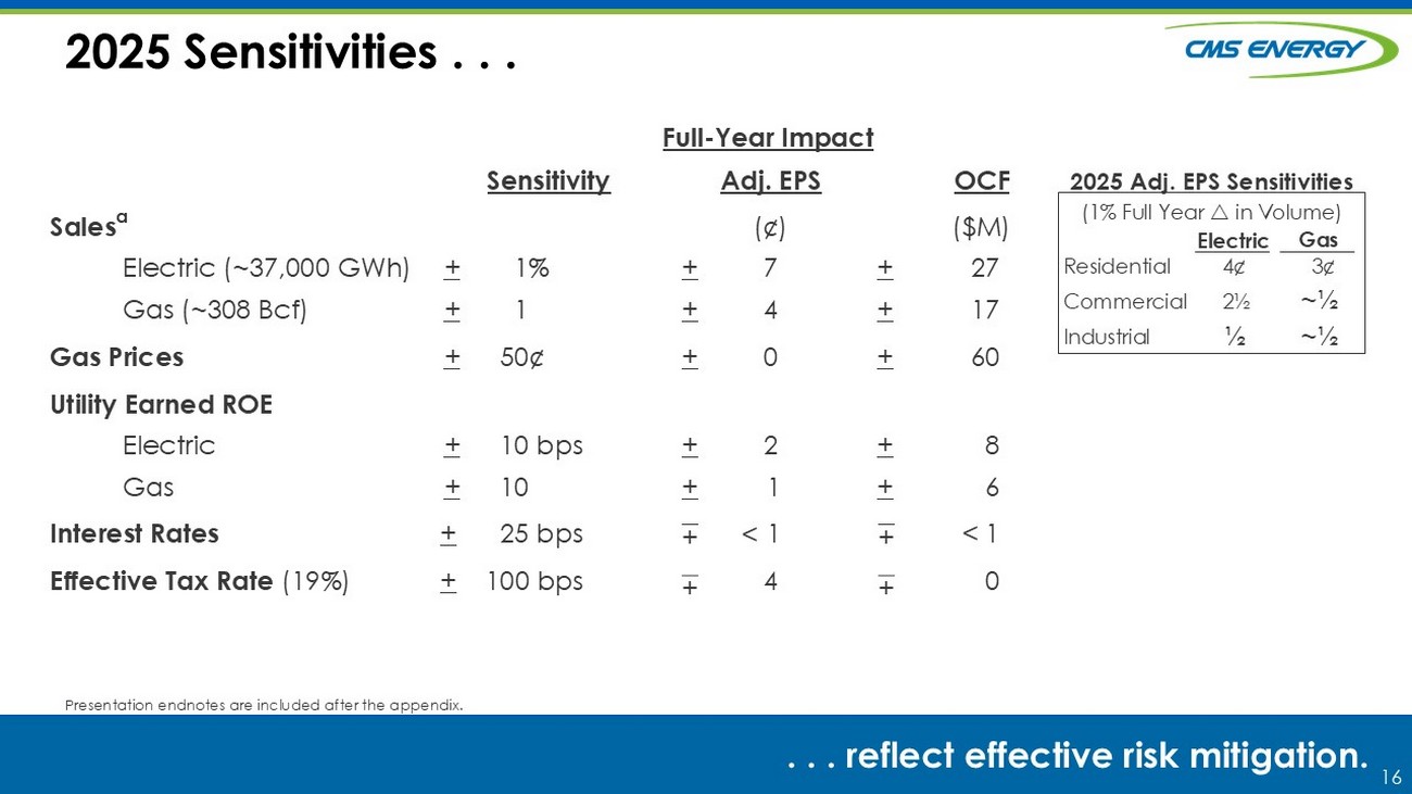 Tier 1 and 2) make up ~2% of total gross margin ( 2.3 )% 3 ¢ 16 2025 Sensitivities . . . . . . r eflect effective risk mitigation. Presentation endnotes are included after the appendix. Full - Year Impact OCF Adj. EPS Sensitivity ($M) 27 17 + + ( ¢) 7 4 + + 1% 1 + + Sales a Electric (~37,000 GWh) Gas (~308 Bcf) 60 + 0 + 50 ¢ + Gas Prices 8 6 + + 2 1 + + 10 bps 10 + + Utility Earned ROE Electric Gas < 1 1 25 bps + Interest Rates 0 4 100 bps + Effective Tax Rate (19%) + + + + Electric Residential Commercial Industrial 4¢ 2½ 3 ¢ (1% Full Year in Volume) 2025 Adj.
