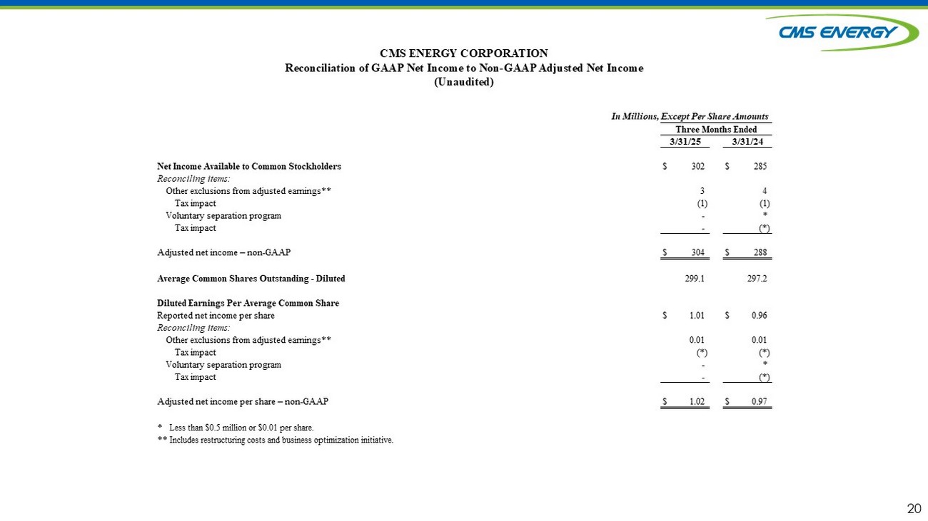 During an oral presentation, references to “earnings” are on an adjusted basis. All references to net income ref er to net income available to common stockholders and references to earnings per share are on a diluted basis. Adjustments could include items such as disc ont inued operations, asset sales, impairments, restructuring costs, business optimization initiative, changes in accounting principles, voluntary separation pr ogr am, changes in federal tax policy, regulatory items from prior years, unrealized gains or losses from mark - to - market adjustments, recognized in net income related to NorthStar Clean Energy's interest expense, or other items. Management views adjusted earnings as a key measure of the company’s present operating fina nci al performance and uses adjusted earnings for external communications with analysts and investors. Internally, the company uses adjusted earnings to mea sure and assess performance. Because the company is not able to estimate the impact of specific line items, which have the potential to significantly impa ct, favorably or unfavorably, the company's reported earnings in future periods, the company is not providing reported earnings guidance nor is it providing a rec onciliation for the comparable future period earnings. The adjusted earnings should be considered supplemental information to assist in understanding our bu sin ess results, rather than as a substitute for the reported earnings. 19 CMS ENERGY CORPORATION Reconciliation of GAAP Net Income to Non - GAAP Adjusted Net Income (Unaudited) Net Income Available to Common Stockholders $ 302 $ 285 Reconciling items: Other exclusions from adjusted earnings** 3 4 Tax impact (1) (1) Voluntary separation program - * Tax impact - (*) Adjusted net income – non-GAAP $ 304 $ 288 Average Common Shares Outstanding - Diluted 299.1 297.2 Diluted Earnings Per Average Common Share Reported net income per share $ 1.01 $ 0.96 Reconciling items: Other exclusions from adjusted earnings** 0.01 0.01 Tax impact (*) (*) Voluntary separation program - * Tax impact - (*) Adjusted net income per share – non-GAAP $ 1.02 $ 0.97 * Less than $0.5 million or $0.01 per share.