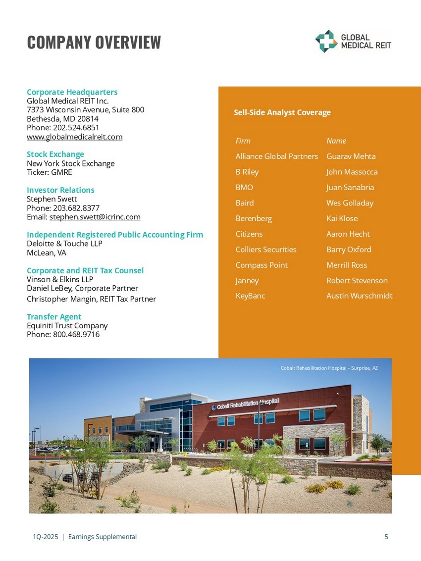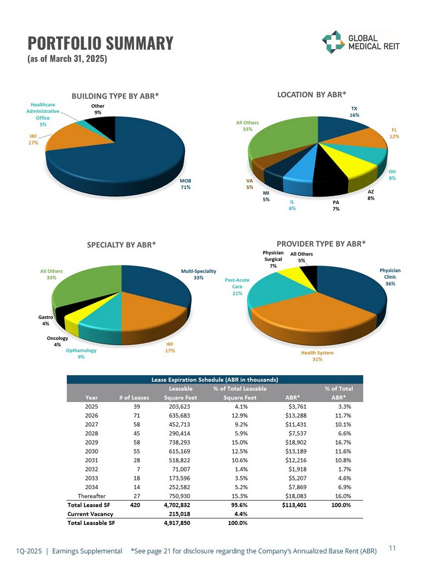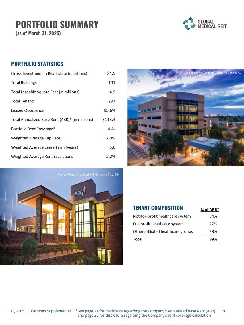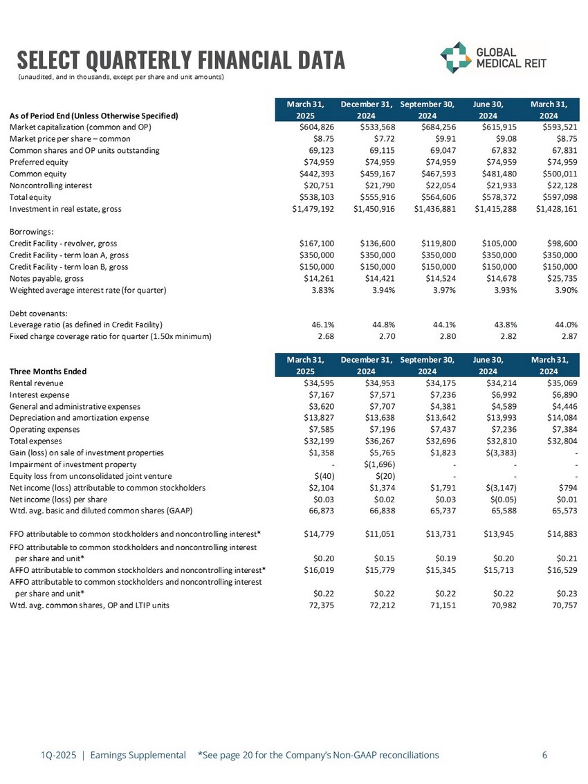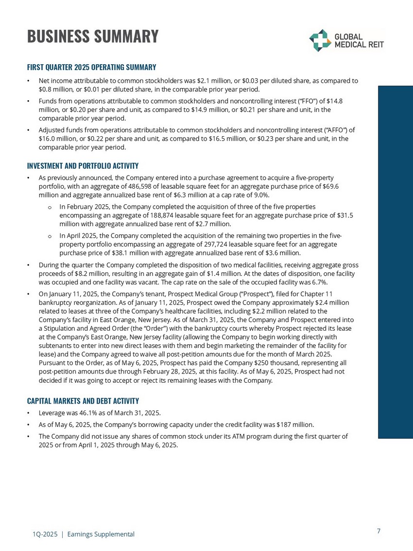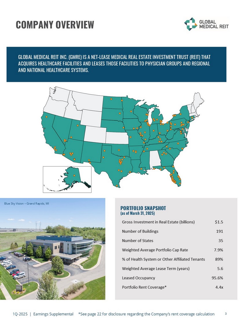 メリーランド州ベセスダ - 2025年5月7日 - (BUSINESS WIRE) - 医療施設を取得し、その施設を医師グループや地域および全国規模の医療システムに賃貸するネットリースの医療不動産投資信託(REIT)であるグローバル・メディカル・リート・インク(NYSE: GMRE)(以下「当社」または「GMRE」)は本日、2025年3月31日に終了した3カ月間の決算およびその他のデータを発表しました。