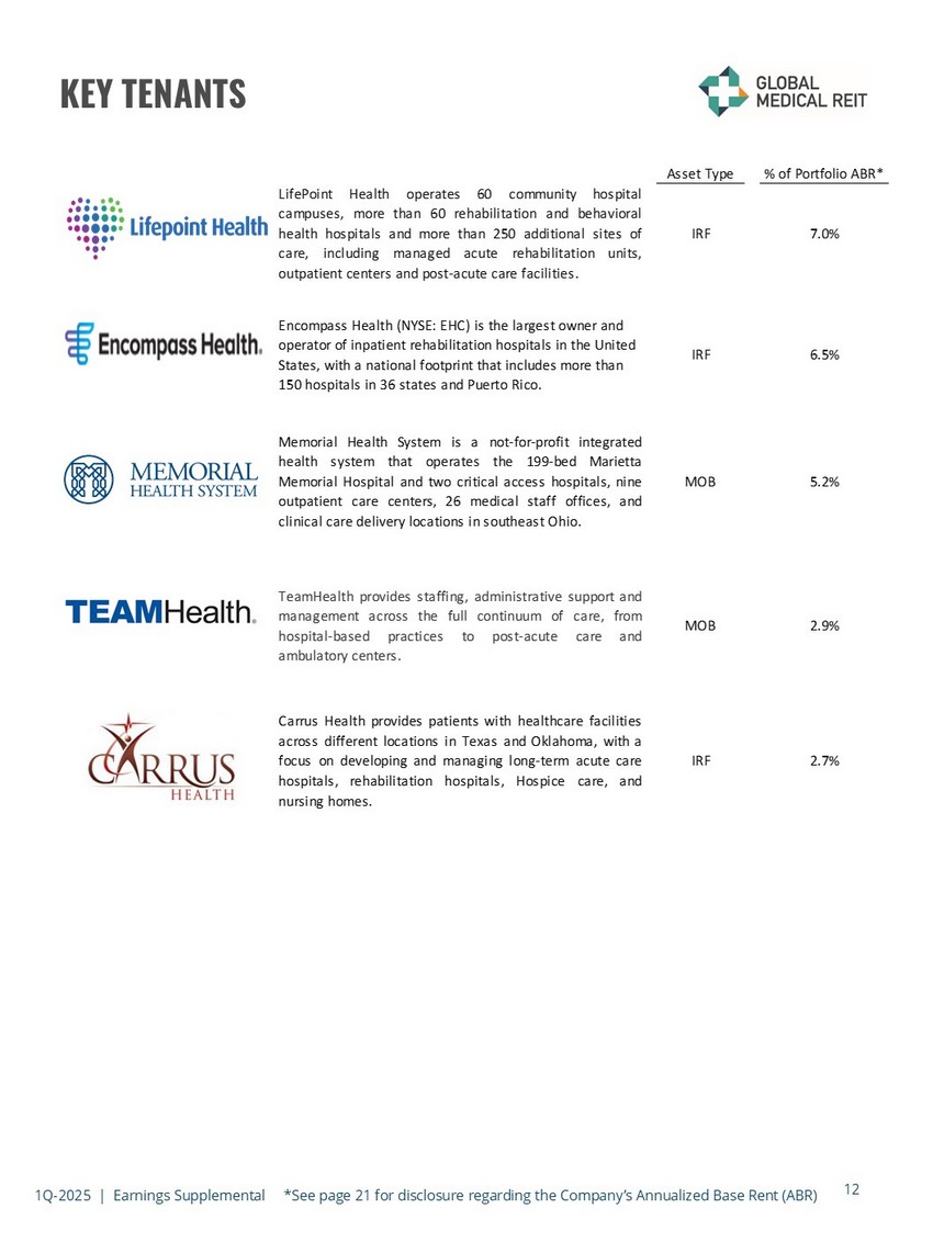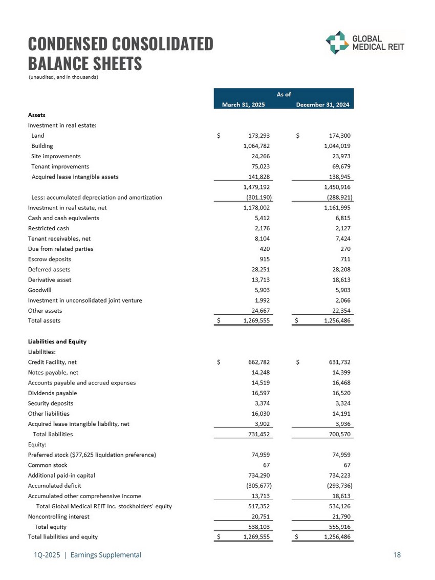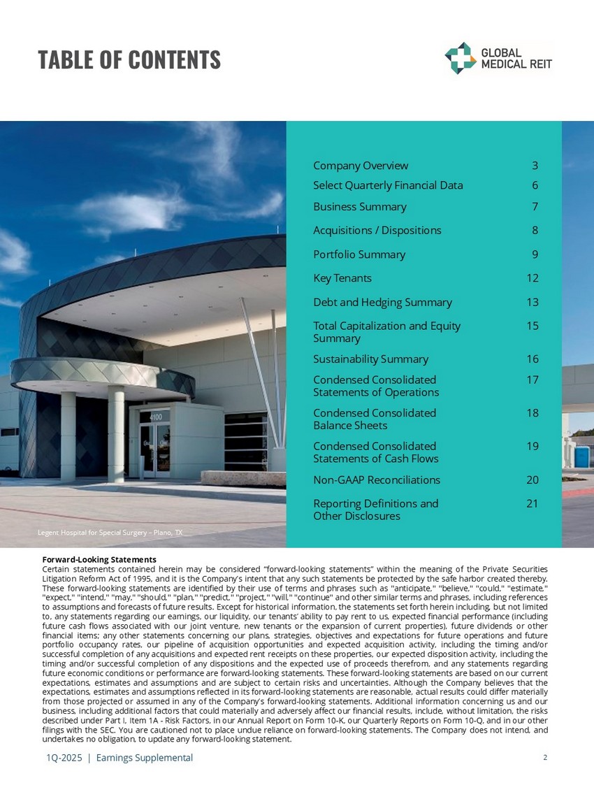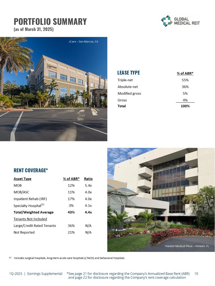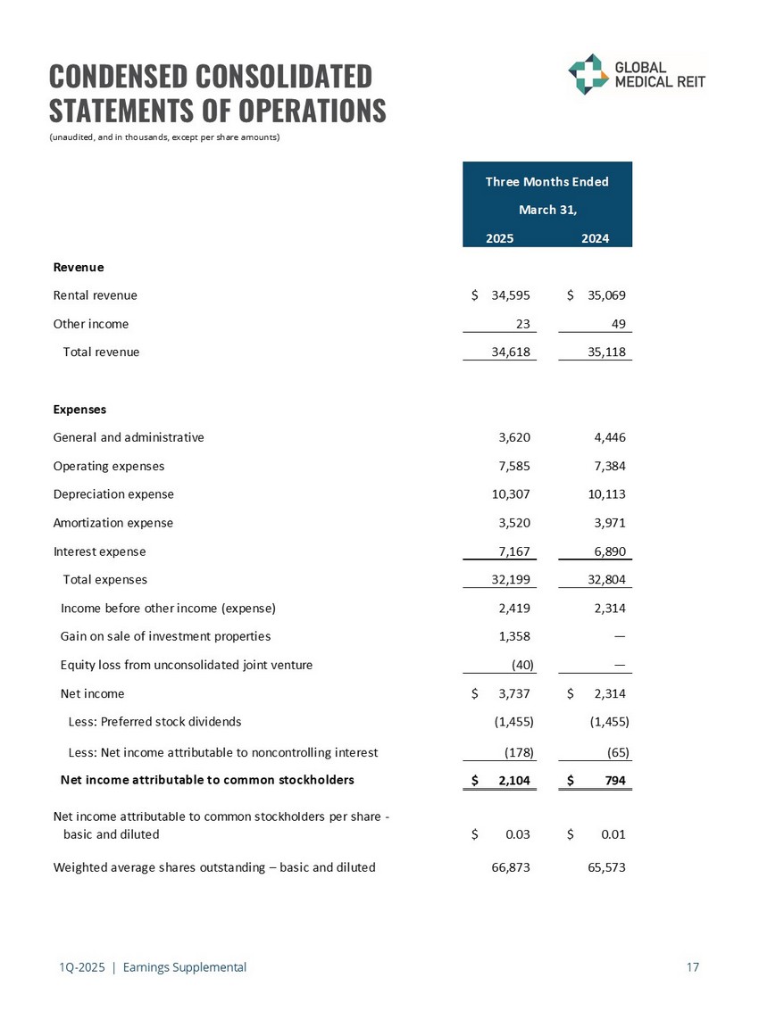 メリーランド州ベセスダ - 2025年5月7日 - (BUSINESS WIRE) - 医療施設を取得し、その施設を医師グループや地域および全国規模の医療システムに賃貸するネットリースの医療不動産投資信託(REIT)であるグローバル・メディカル・リート・インク(NYSE: GMRE)(以下「当社」または「GMRE」)は本日、2025年3月31日に終了した3カ月間の決算およびその他のデータを発表しました。