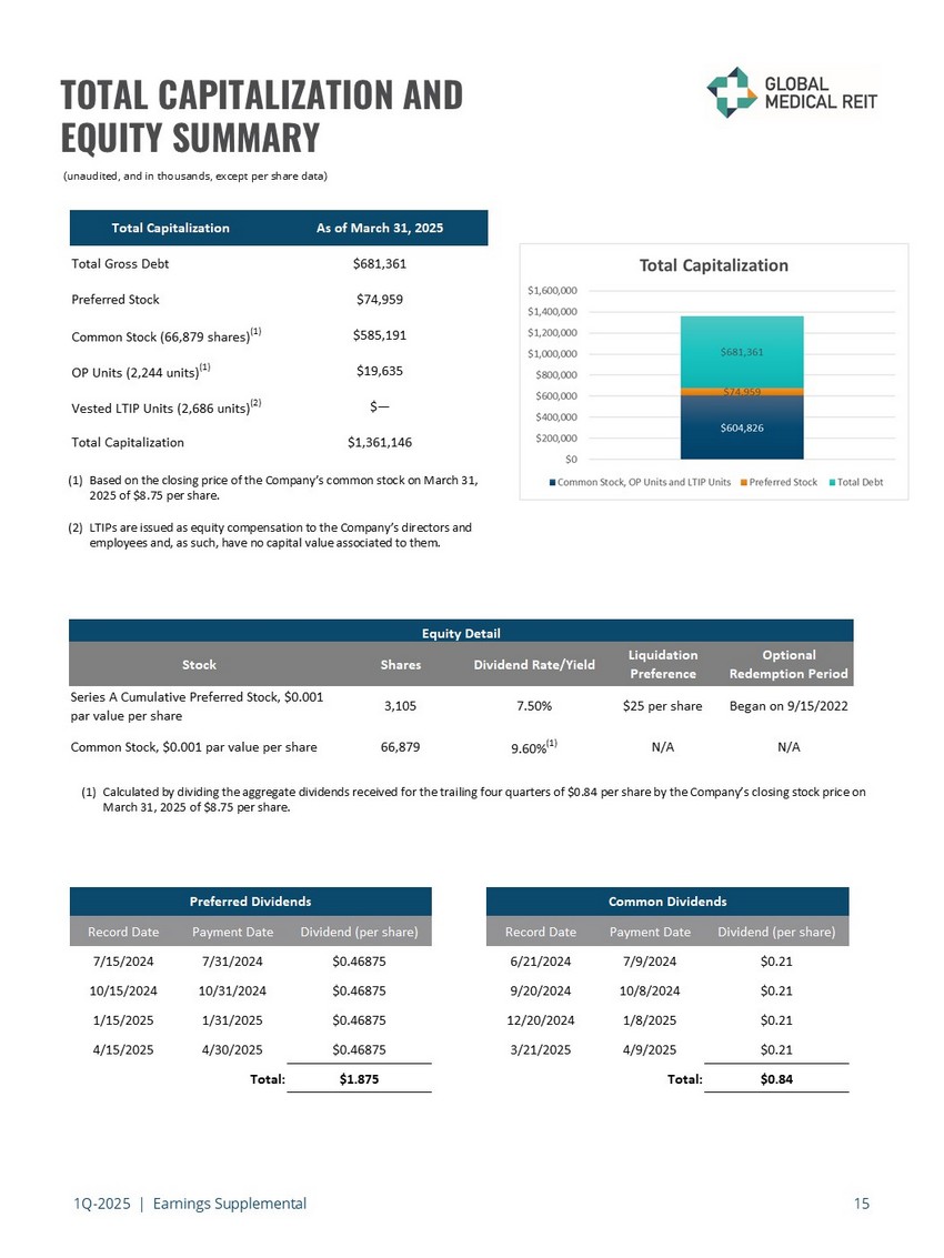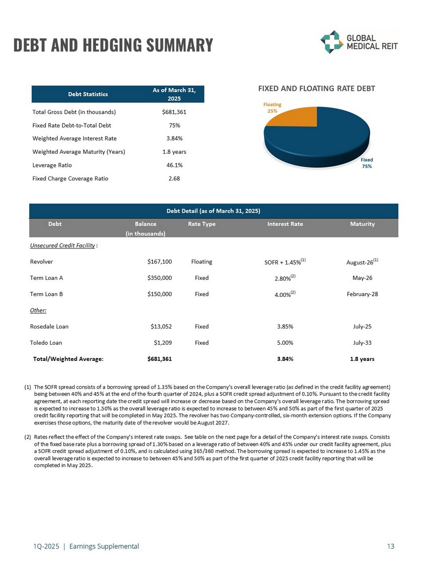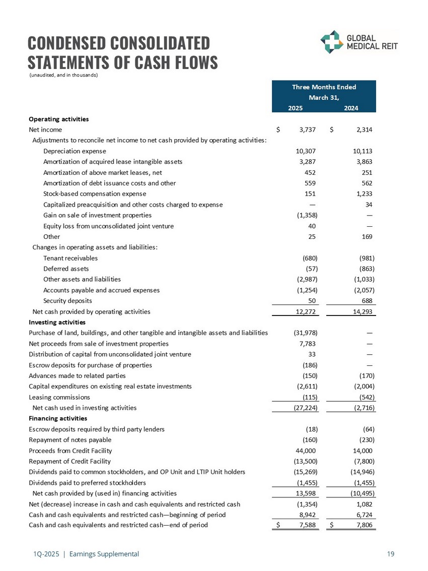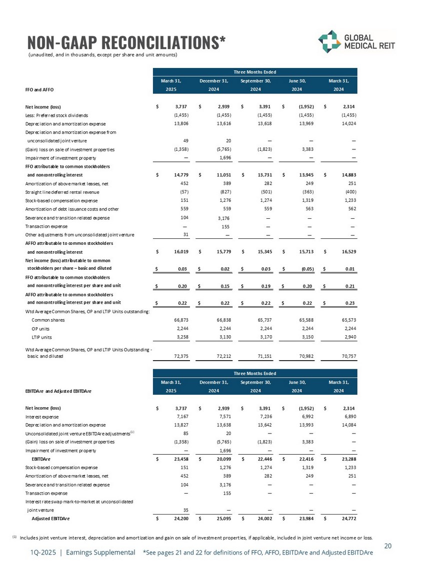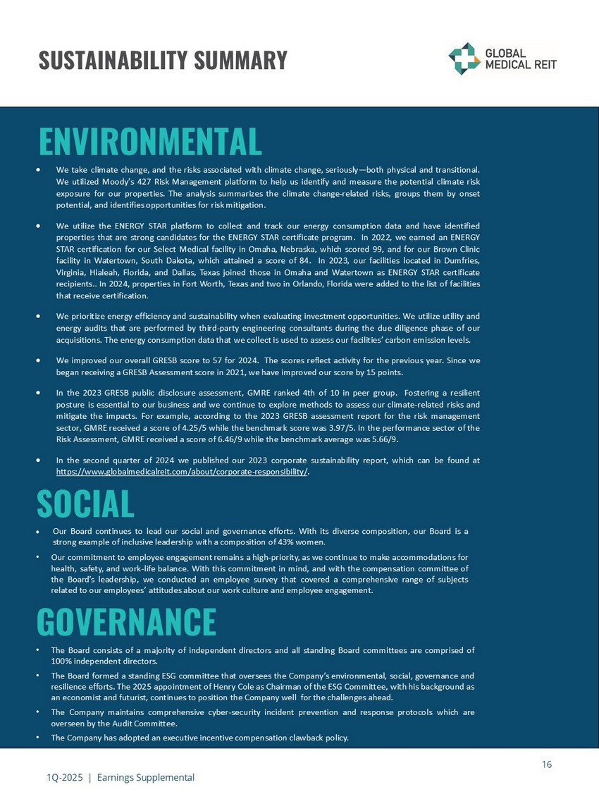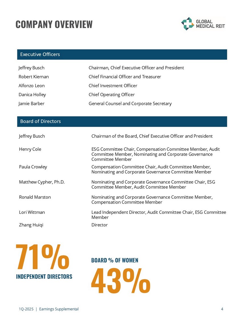 メリーランド州ベセスダ - 2025年5月7日 - (BUSINESS WIRE) - 医療施設を取得し、その施設を医師グループや地域および全国規模の医療システムに賃貸するネットリースの医療不動産投資信託(REIT)であるグローバル・メディカル・リート・インク(NYSE: GMRE)(以下「当社」または「GMRE」)は本日、2025年3月31日に終了した3カ月間の決算およびその他のデータを発表しました。