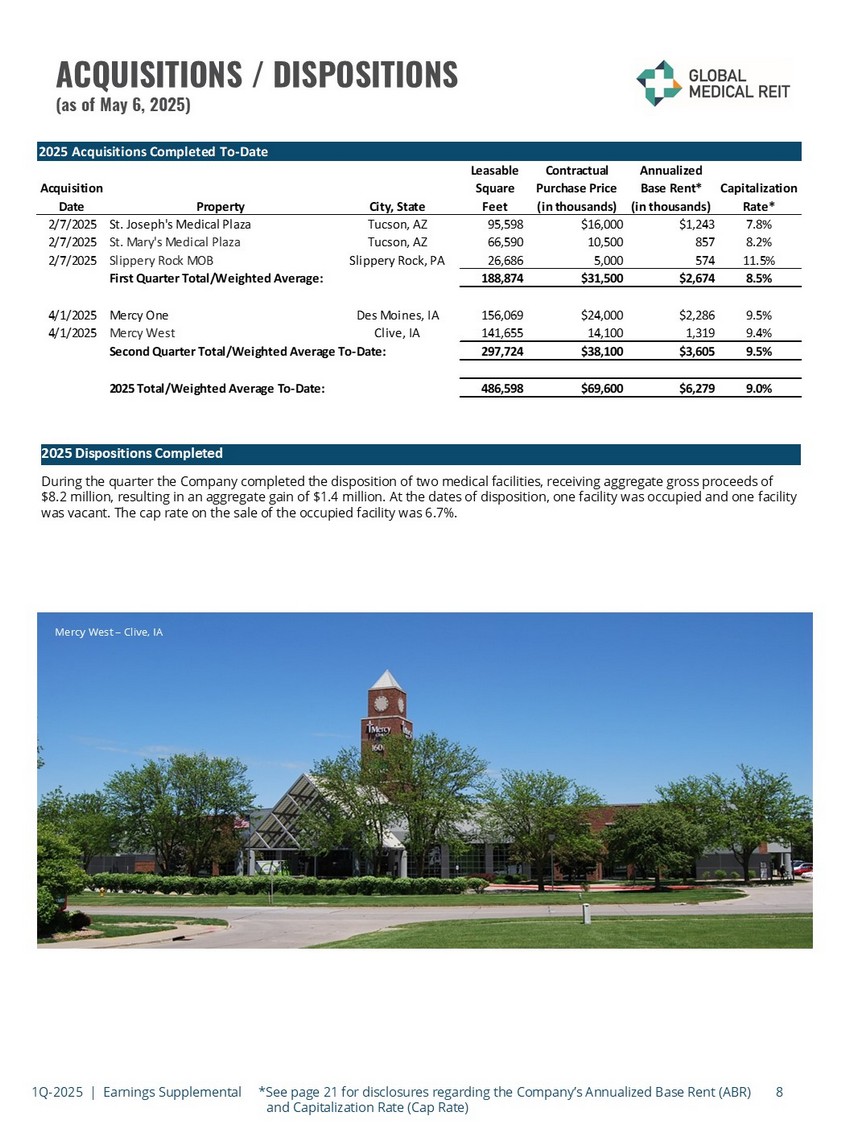 | · | 先に発表した医療用不動産ポートフォリオ5物件(賃貸可能面積486,598平方フィート、年換算ベース賃料総額630万ドル)の取得価格6,960万ドルで完了。うち3物件は2025年2月、残り2物件は2025年4月にクローズした。 |