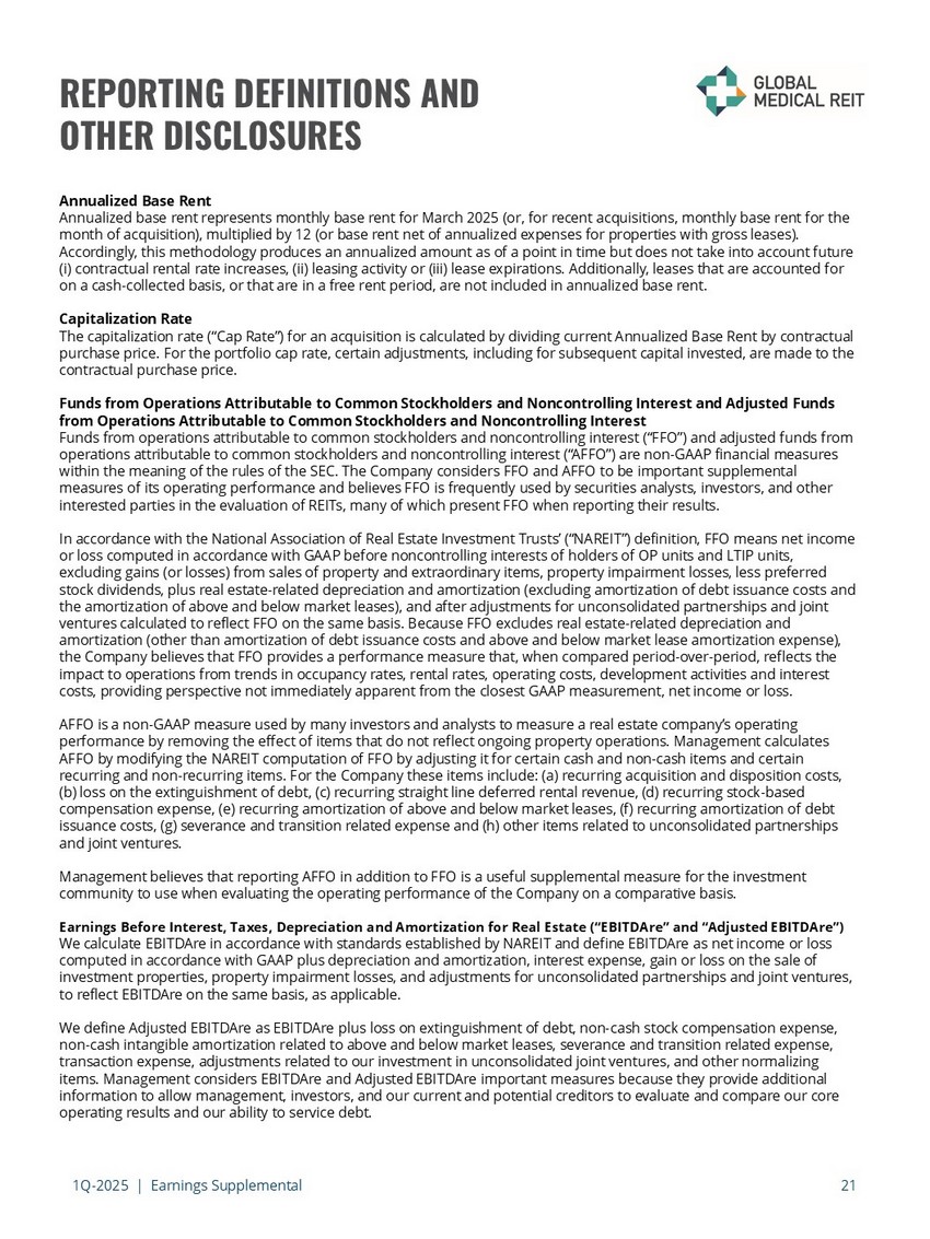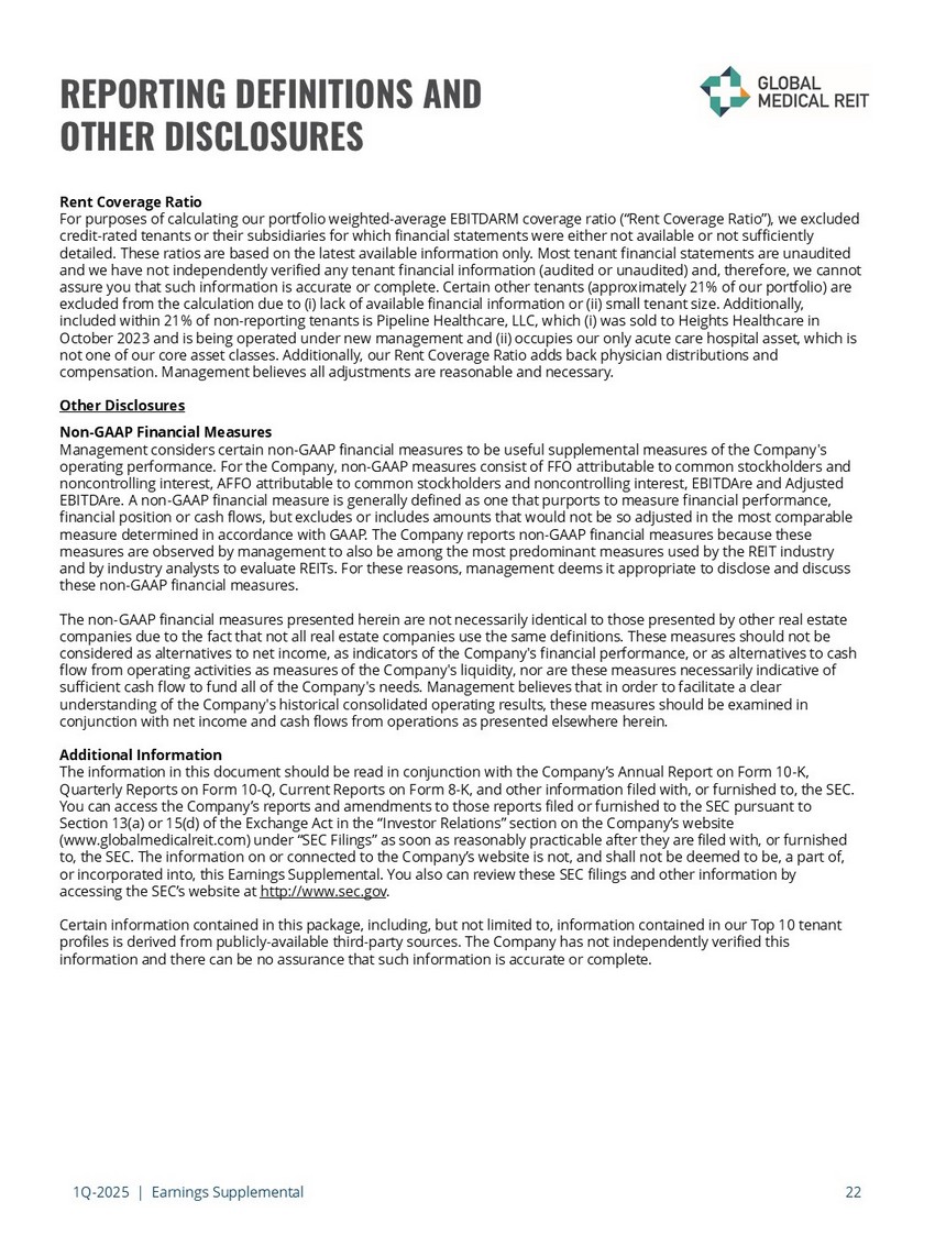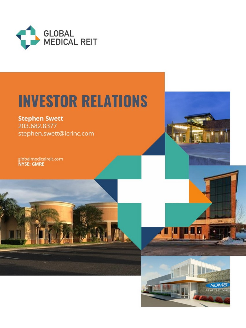 これらの結果に関する詳細は、当社ウェブサイトの投資家向け情報セクション(http://investors.globalmedicalreit.com/)に掲載されている当社の補足財務パッケージに記載されています。