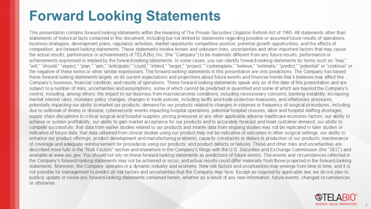 本プレスリリースには、1995年米国私募証券訴訟改革法(The Private Securities Litigation Reform Act of 1995)に定義される「将来予想に関する記述(forward-looking statements)」が含まれています。可能性がある」、「かもしれない」、「予定である」、「はずである」、「信じる」、「期待する」、「予想する」、「見積もる」、「継続する」、「予測する」、「予想する」、「プロジェクトする」、「計画する」、「意図する」などの表現、または意図、確信、現在の期待に関する記述は、将来の見通しに関する記述であり、TELA Bioの経営陣の現在の考えを反映したものです。このような将来予想に関する記述には、2025年通期における当社の予想売上高および売上高の増加、ならびに2025年通期における営業費用の削減に関する記述が含まれます。これらの記述は、将来の業績を保証するものではなく、一定のリスクや不確実性、その他の要因の影響を受ける可能性があります:景気後退懸念、銀行の不安定化、市場金利の上昇、金融政策の変更、関税や貿易保護措置を含む貿易政策の変更、インフレ圧力など、マクロ経済状況による当社事業への影響;病気や疾患の発生、病院運営に影響を及ぼすサイバーセキュリティ事象、潜在的な病院閉鎖、労働力および病院スタッフの不足、重要な手術および病院用品に対するサプライチェーンの混乱、価格圧力、またはその他の該当する不利な医療経済要因によるものを含む、外科手術の量または頻度の変化に関連する当社製品に対する需要;収益性を達成または維持する当社の能力、当社製品の市場受容性を獲得し、顧客の需要を正確に予測し、満たす当社の能力、競争を成功させる当社の能力、当社製品に関連する先行研究のデータおよび進行中の研究の中間データが、以降の研究で再現されない可能性、または将来のデータを示さない可能性があること;当社製品を使用した臨床試験から得られたデータが、他の手術環境における転帰を示さない可能性があること、当社製品の提供を強化する当社の能力、製品開発および製造上の問題、当社製品の生産能力の制約または遅延、当社製品を使用した手術に対する保険適用および適切な償還の維持、製品の欠陥または不具合。これらのリスクや不確実性については、「リスク要因」の項や、Form 10-K年次報告書およびForm 10-Q四半期報告書を含む、当社が米国証券取引委員会に提出し、www.sec.gov。この発表文に記載されている将来の見通しに関する記述は、このプレスリリースの発表日現在において判断したものであり、TELA Bioは、このプレスリリースの発表日以降、新たな情報、将来の事象、その他により、将来の見通しに関する記述を更新する義務を負うものではありません。