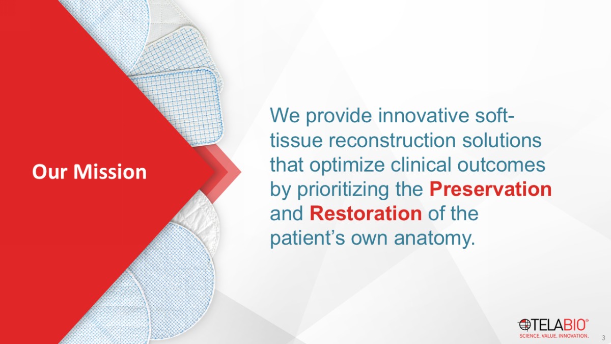 TELA Bio, Inc. (NASDAQ: TELA)は、患者自身の解剖学的構造の保存と回復を優先することにより、臨床転帰を最適化する革新的な技術を提供する商業段階の医療技術企業です。TELAは、患者自身の自然治癒力を活用しながら、永久的な合成材料への長期的な曝露を最小限に抑える、先進的で経済的効果の高い軟部組織再建ソリューションを外科医に提供することに取り組んでいます。詳しくはwww.telabio.com。