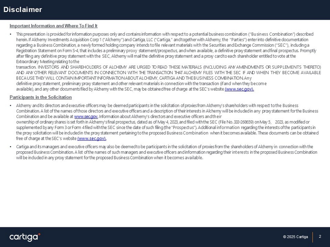 Important Information and Where To Find It • This presentation is provided for information purposes only and contains information with respect to a potential business combination (“Business Combination”) described herein. If Alchemy Investments Acquisition Corp 1 (“Alchemy”) and Cartiga, LLC (“Cartiga,” and together with Alchemy, the “Parties”) enter into definitive documentation regarding a Business Combination, a newly formed holding company intends to file relevant materials with the Securities and Exchange Commission (“SEC”), including a Registration Statement on Form S - 4, that includes a preliminary proxy statement/prospectus, and when available, a definitive proxy statement and final prospectus. Promptly after filing any definitive proxy statement with the SEC, Alchemy will mail the definitive proxy statement and a proxy card to each shareholder entitled to vote at the Extraordinary Meeting relating to the transaction . INVESTORS AND SHAREHOLDERS OF ALCHEMY ARE URGED TO READ THESE MATERIALS (INCLUDING ANY AMENDMENTS OR SUPPLEMENTS THERETO) AND ANY OTHER RELEVANT DOCUMENTS IN CONNECTION WITH THE TRANSACTION THAT ALCHEMY FILES WITH THE SEC IF AND WHEN THEY BECOME AVAILABLE BECAUSE THEY WILL CONTAIN IMPORTANT INFORMATION ABOUT ALCHEMY, CARTIGA AND THE BUSINESS COMBINATION . Any definitive proxy statement, preliminary proxy statement and other relevant materials in connection with the transaction (if and when they become available), and any other documents filed by Alchemy with the SEC, may be obtained free of charge at the SEC’s website (www.sec.gov). Participants in the Solicitation • Alchemy and its directors and executive officers may be deemed participants in the solicitation of proxies from Alchemy’s shareholders with respect to the Business Combination. A list of the names of those directors and executive officers and a description of their interests in Alchemy will be included in any proxy statement for the Business Combination and be available at www.sec.gov. Information about Alchemy’s directors and executive officers and their ownership of ordinary shares is set forth in Alchemy’s final prospectus, dated as of May 4, 2023, and filed with the SEC (File No. 333 - 268659) on May 5, 2023, as modified or supplemented by any Form 3 or Form 4 filed with the SEC since the date of such filing (the “Prospectus”). Additional information regarding the interests of the participants in the proxy solicitation will be included in the proxy statement pertaining to the proposed Business Combination when it becomes available. These documents can be obtained free of charge at the SEC’s website (www.sec.gov). • Cartiga and its managers and executive officers may also be deemed to be participants in the solicitation of proxies from the shareholders of Alchemy in connection with the proposed Business Combination. A list of the names of such managers and executive officers and information regarding their interests in the proposed Business Combination will be included in any proxy statement for the proposed Business Combination when it becomes available.