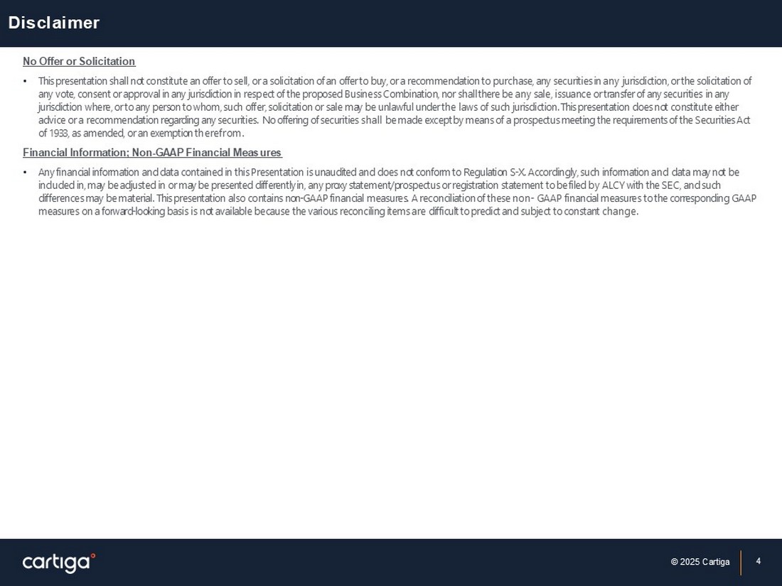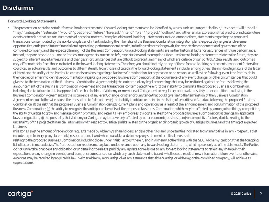 © 2025 Cartiga 2 Disclaimer Disclaimer © 2025 Cartiga 3 Forward - Looking Statements • This presentation contains certain “forward - looking statements.” Forward - looking statements can be identified by words such as: “target,” “believe,” “expect,” “will,” “shall,” “may,” “anticipate,” “estimate,” “would,” “positioned,” “future,” “forecast,” “intend,” “plan,” “project,” “outlook” and other similar expressions that predict or indicate future events or trends or that are not statements of historical matters. Examples of forward - looking statements include, among others, statements regarding the proposed transactions contemplated by the non - binding letter of intent, including the benefits of the Business Combination, integration plans, expected synergies and revenue opportunities, anticipated future financial and operating performance and results, including estimates for growth, the expected management and governance of the combined company, and the expected timing of the Business Combination. Forward - looking statements are neither historical facts nor assurances of future performance. Instead, they are based only on the Parties’ managements’ current beliefs, expectations and assumptions. Because forward - looking statements relate to the future, they are subject to inherent uncertainties, risks and changes in circumstances that are difficult to predict and many of which are outside of our control. Actual results and outcomes may differ materially from those indicated in the forward - looking statements. Therefore, you should not rely on any of these forward - looking statements. Important factors that could cause actual results and outcomes to differ materially from those indicated in the forward - looking statements include, among others, the non - binding nature of the letter of intent and the ability of the Parties’ to cease discussions regarding a Business Combination for any reason or no reason, as well as the following, even if the Parties do in their discretion enter into definitive documentation regarding a proposed Business Combination: (a) the occurrence of any event, change, or other circumstances that could give rise to the termination of the Business Combination Agreement; (b) the outcome of any legal proceedings that may be instituted against the Parties following the announcement of the Business Combination Agreement and the transactions contemplated therein; (c) the inability to complete the proposed Business Combination, including due to failure to obtain approval of the shareholders of Alchemy or members of Cartiga, certain regulatory approvals, or satisfy other conditions to closing in the Business Combination Agreement; (d) the occurrence of any event, change, or other circumstance that could give rise to the termination of the Business Combination Agreement or could otherwise cause the transaction to fail to close; (e) the inability to obtain or maintain the listing of securities on Nasdaq following the proposed Business Combination; (f) the risk that the proposed Business Combination disrupts current plans and operations as a result of the announcement and consummation of the proposed Business Combination; (g) the ability to recognize the anticipated benefits of the proposed Business Combination, which may be affected by, among other things, competition, the ability of Cartiga to grow and manage growth profitably, and retain its key employees; (h) costs related to the proposed Business Combination; (i) changes in applicable laws or regulations; (j) the possibility that Alchemy or Cartiga may be adversely affected by other economic, business, and/or competitive factors; (k) risks relating to the uncertainty of the projected financial information with respect to Cartiga; (l) risks related to the organic and inorganic growth of Cartiga’s business and the timing of expected business milestones; (m) the amount of redemption requests made by Alchemy’s shareholders; and (n) other risks and uncertainties indicated from time to time in any Prospectus that includes a preliminary proxy statement/prospectus, and if and when available, a definitive proxy statement and final prospectus relating to the proposed Business Combination, including those under “Risk Factors” therein, and in Alchemy’s other filings with the SEC. Alchemy cautions that the foregoing list of factors is not exclusive. The Parties caution readers not to place undue reliance upon any forward - looking statements, which speak only as of the date made. The Parties do not undertake or accept any obligation or undertaking to release publicly any updates or revisions to any forward - looking statements to reflect any change in their expectations or any change in events, conditions, or circumstances on which any such statement is based, whether as a result of new information, future events, or otherwise, except as may be required by applicable law. Neither Alchemy nor Cartiga gives any assurance that either Cartiga or Alchemy, or the combined company, will achieve its expectations.