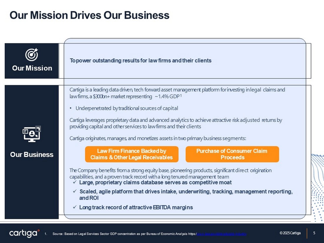 Disclaimer © 2025 Cartiga 4 No Offer or Solicitation • This presentation shall not constitute an offer to sell, or a solicitation of an offer to buy, or a recommendation to purchase, any securities in any jurisdiction, or the solicitation of any vote, consent or approval in any jurisdiction in respect of the proposed Business Combination, nor shall there be any sale, issuance or transfer of any securities in any jurisdiction where, or to any person to whom, such offer, solicitation or sale may be unlawful under the laws of such jurisdiction. This presentation does not constitute either advice or a recommendation regarding any securities. No offering of securities shall be made except by means of a prospectus meeting the requirements of the Securities Act of 1933, as amended, or an exemption therefrom. Financial Information; Non - GAAP Financial Measures • Any financial information and data contained in this Presentation is unaudited and does not conform to Regulation S - X. Accordingly, such information and data may not be included in, may be adjusted in or may be presented differently in, any proxy statement/prospectus or registration statement to be filed by ALCY with the SEC, and such differences may be material. This presentation also contains non - GAAP financial measures. A reconciliation of these non - GAAP financial measures to the corresponding GAAP measures on a forward - looking basis is not available because the various reconciling items are difficult to predict and subject to constant change.